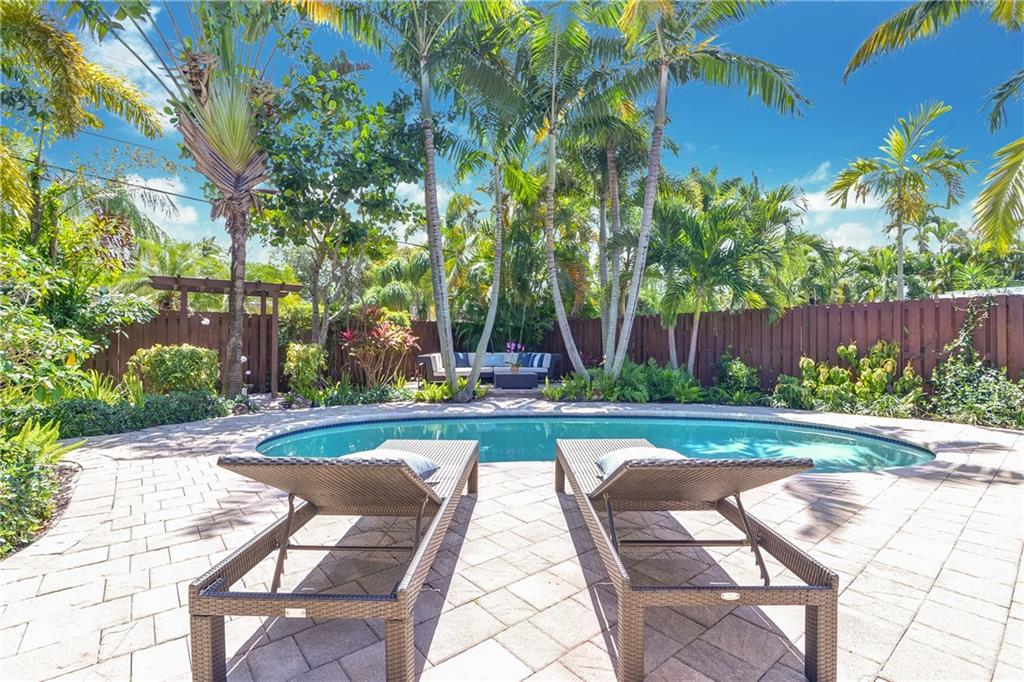 Your own private resort in highly sought after North Ridge section of Poinsettia Heights. This beautifully landscaped home, features light/neutral tile and paint throughout, outdoor bar, heated saltwater pool, and a backyard perfect for entertaining. Updated with hurricane impact windows, plantation shutters, granite counters, stainless appliances, tile roof, refinished pool, landscape lighting, irrigation system and new fencing. Indoor laundry room and carport. Close to beach and popular shopping / dining.