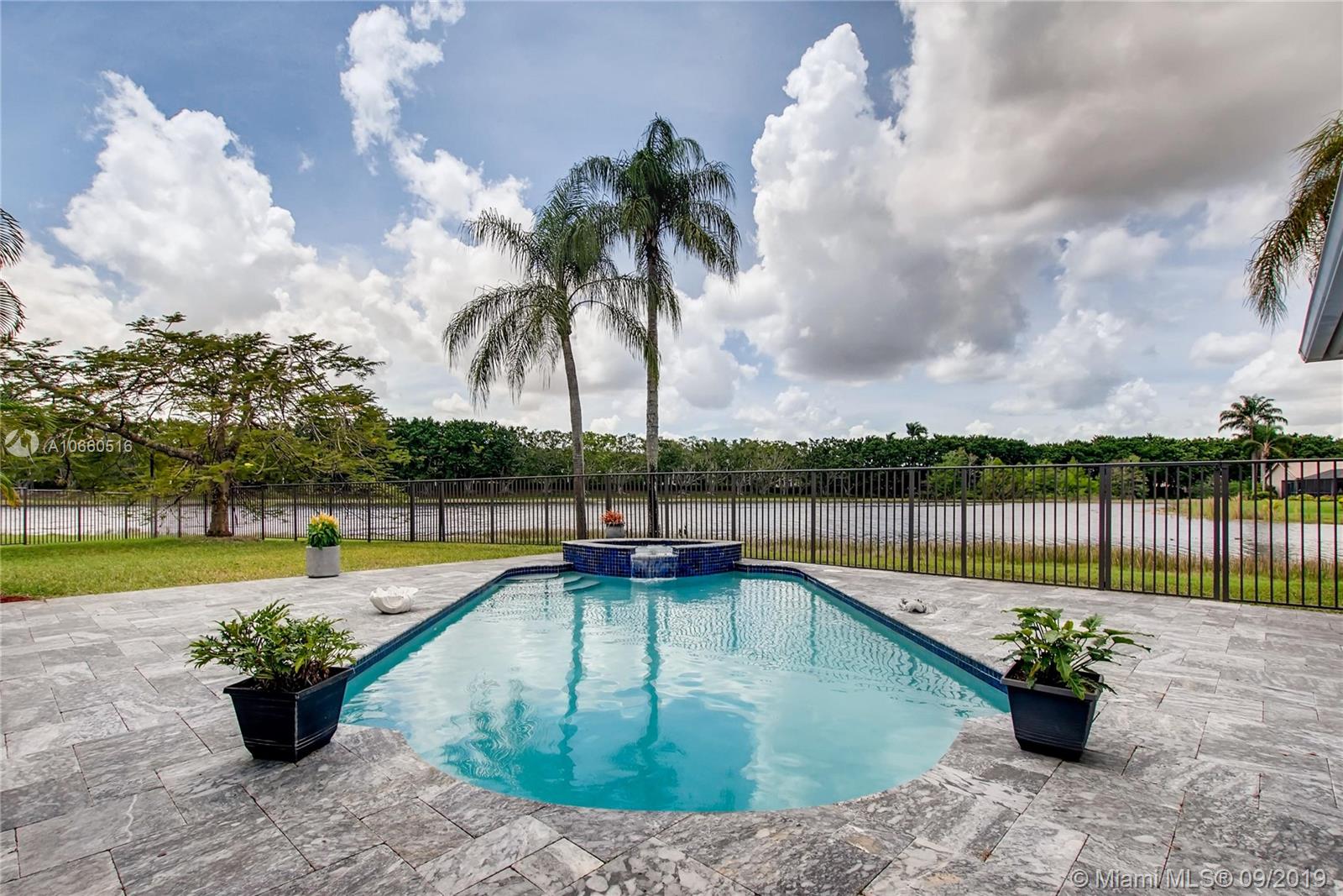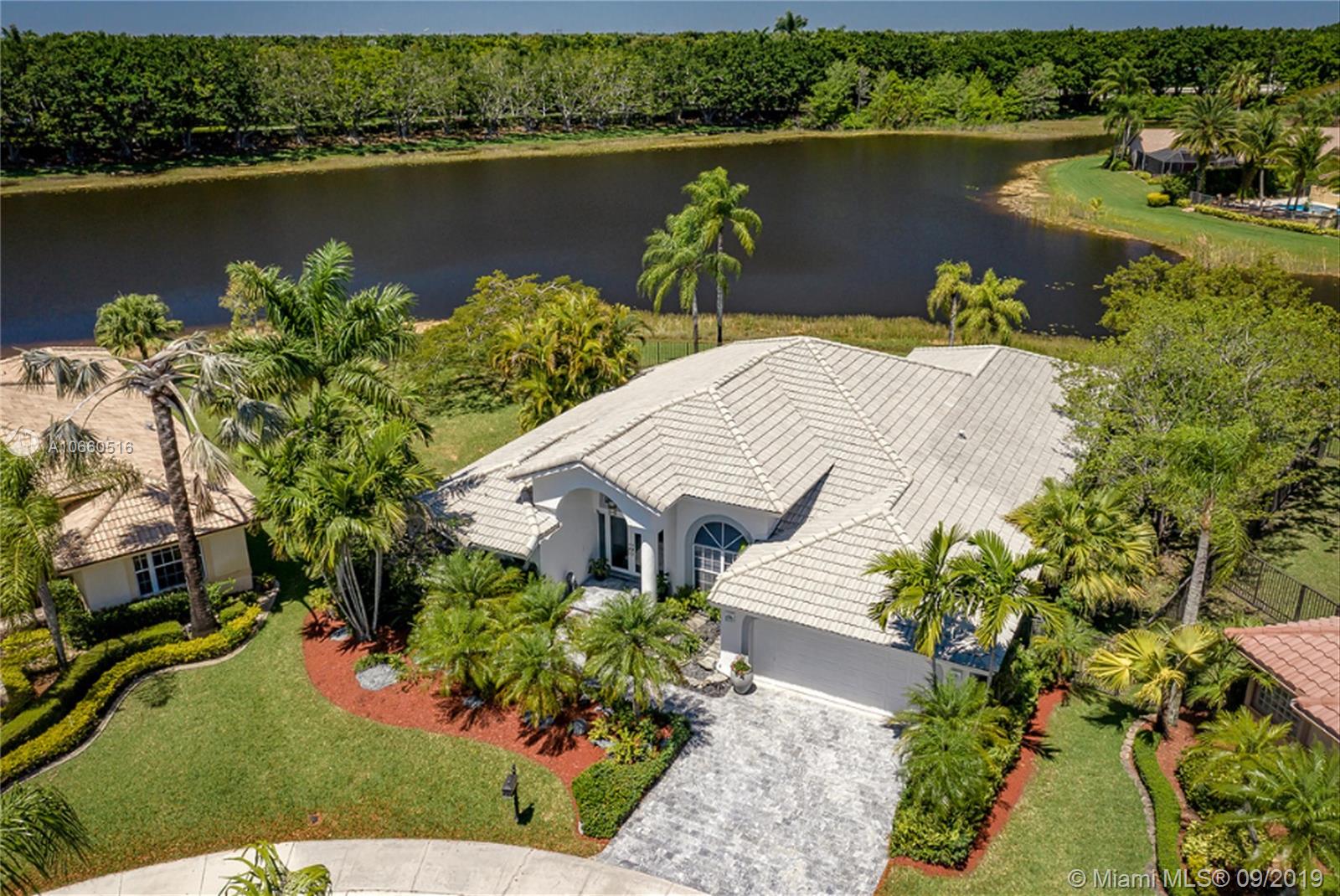 LUXURIOUS WESTON WIDEST (Sunset) LAKE VIEW HOME: ORCHID ISLAND w/community tennis, basketball & playground. Cul-de-sac, exotic landscaping, marble pavers front & back. 18" glass-like Porcelain tiles throughout, granite tops, marble master bath, stainless steel sinks & appliances. ROOF: 2007. Stone entertainment wall, 71' TV surround sound, music, intercom throughout. Each window & door alarmed + motion, fire & smoke sensors. Huge side yard, 16,101 sq. ft. Pie-shaped lot. Waterfall pool faces directly west for year-round sunsets. Large Jacuzzi tub in Master, single Jacuzzi in the second bathroom. Toilets are all Kohler & separated by doors for privacy. All closets have systems. TURNKEY.