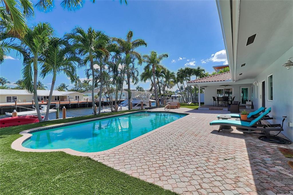 PARADISE FOUND! This 100 foot lot (no wake zone/no fixed bridges) on a wide canal, with a new 90 ft dock with updated electric. Located in the very desirable Bayview school district, this home has been extensively remodeled with the following updates made within the last few years: Back yard re-done with sports turf for carefree maintenance (drip system for palm trees), retaining wall installed, new floors in most rooms, new paint inside (with modern new doors, baseboards and beautiful crown molding) and outside (with new gutters), new impact windows and doors throughout, recessed lighting in most rooms, silhouette blinds on all windows, vinyl fencing, salt water pool, and professionally landscaped yard, extra large garage. 3,000+/- sq ft under roof. Come make this house your home...