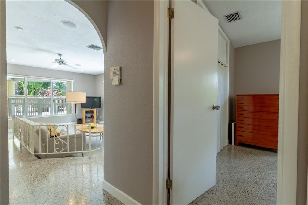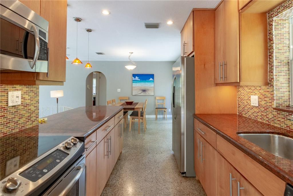 don't miss the photos for this charming home on an oversized and lushly landscaped corner lot. the pool area, in full view from the dining and step down living area add to the beauty of this home. polished terrazzo throughout for easy care and living. the geographic positioning of this home makes for lots of natural light, especially in the living areas. entire property is fenced. updated galley style kitchen makes being in the kitchen easy and convenient to the raised dining area. bathroom makes good use of combo tub/shower with a window. double carport with access for a standard sized vehicle and a compact is a real plus in the florida sun. shaded patio off the dining area is easily accessible for grilling or just chillin, while the pool deck affords plenty of sunshine!