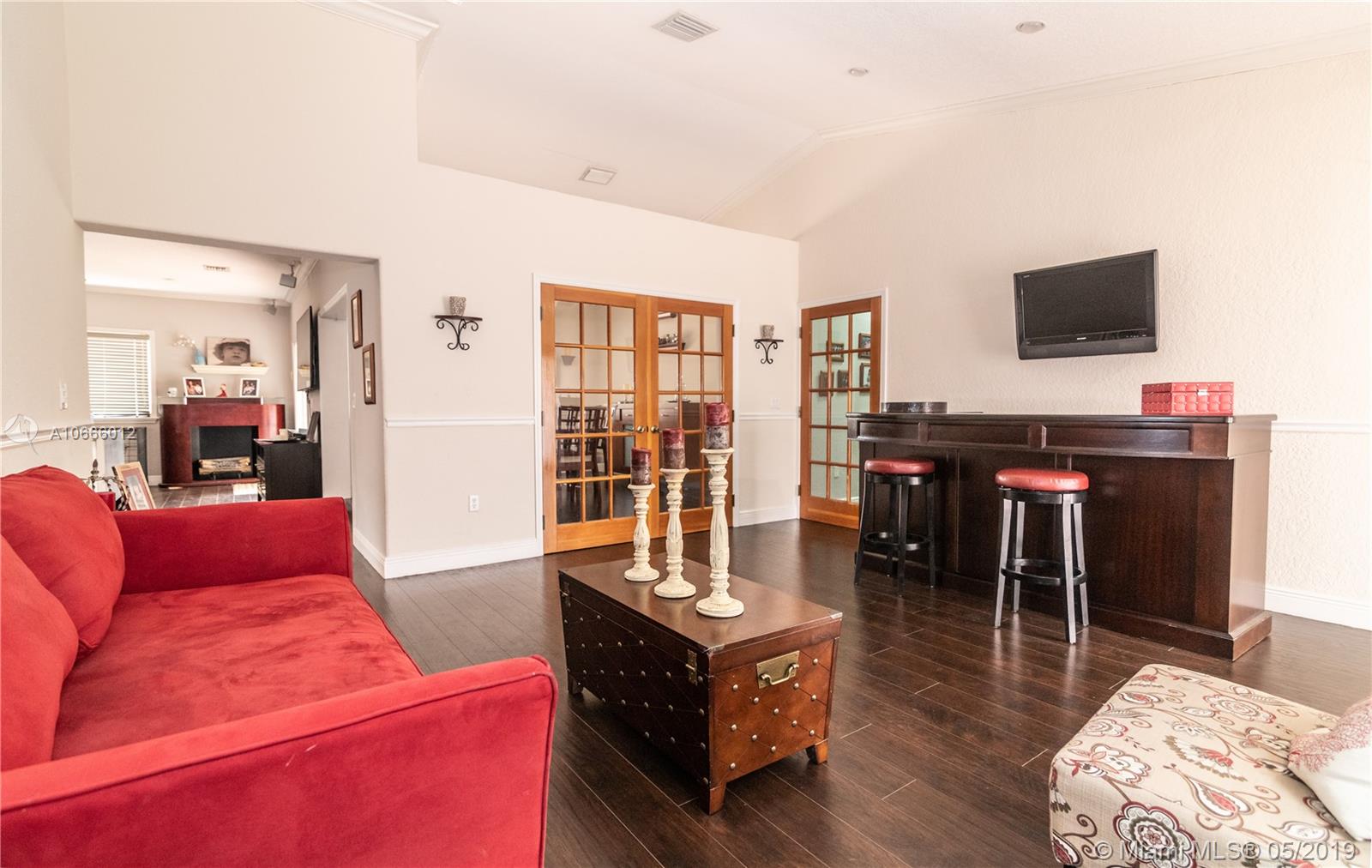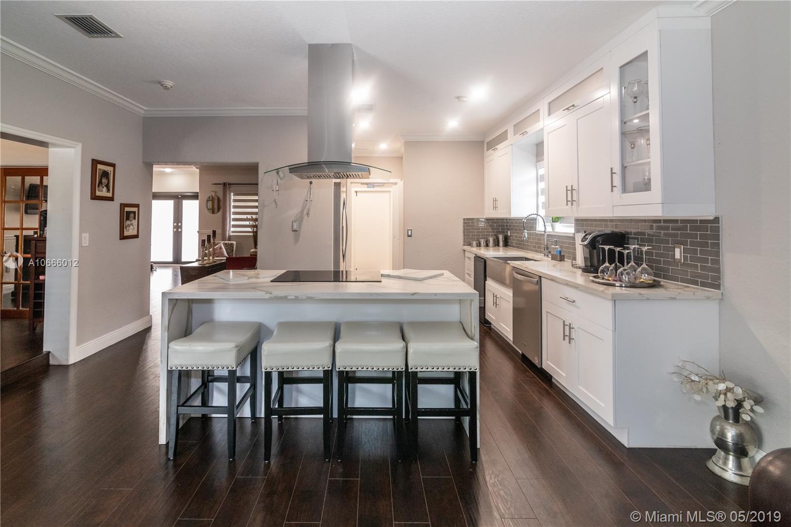 Lovely updated spacious 4/2 pool home. This home features vaulted ceilings, wood laminate floors, open concept kitchen with quartz counter tops, stainless steel appliances & wine cooler w/ a snack counter, formal dining room, large master suite and bath, covered patio wired for flat screen TV, large open pool patio area, Pool has a Jacuzzi, fenced back yard for privacy, great for entertaining. Garage has been converted to partial storage, part made into laundry room adjacent to kitchen, under air with sink & cabinetry with floor poured up to grade. Circular driveway holds minimum of 6 cars.