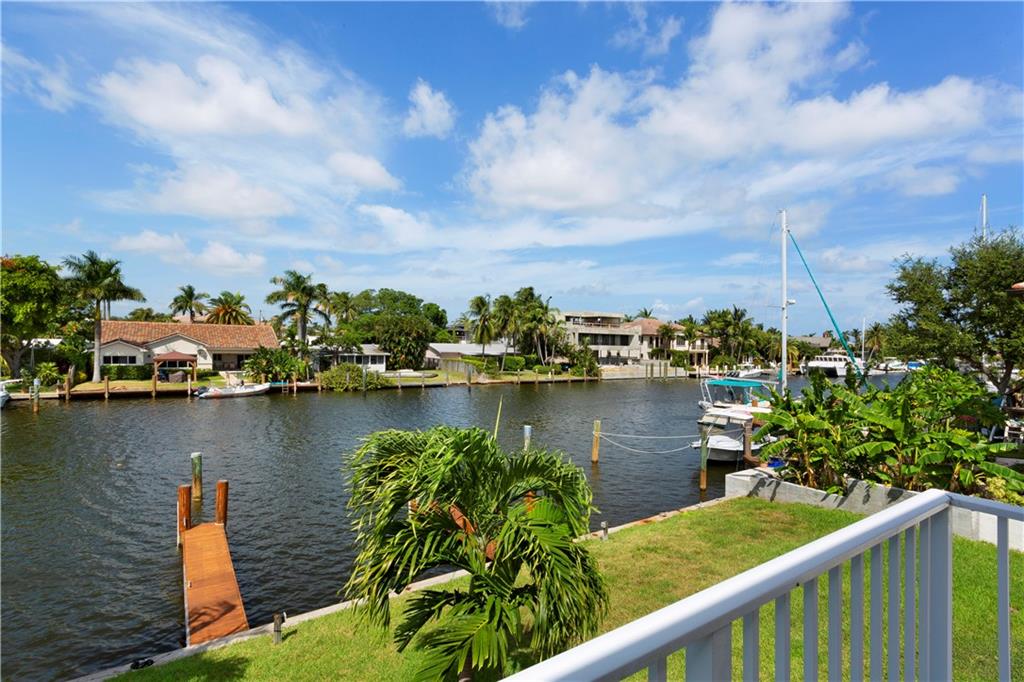 Designed in a clean-lined style, the comfortable layout totals 2,403± sf w/ 4 BR/3BA and an attached garage. Amenities include two air conditioning systems and storm shutters throughout. Neutral-tone ceramic tile floors unify the great room where banks of windows bring in the waterfront view. Leading to the terrace, this generous open space combines the main living and dining areas with the renovated kitchen - granite counters, cooking island, and stainless steel appliances. Den opens to the waterside terrace with full bath. Across the great room, two more bedrooms, one facing the water, are accompanied by another bath. Upstairs, the master suite opens to balcony over the waterway and tree-studded shoreline. The master bath includes a dual vanity. Additional bedroom on this level.