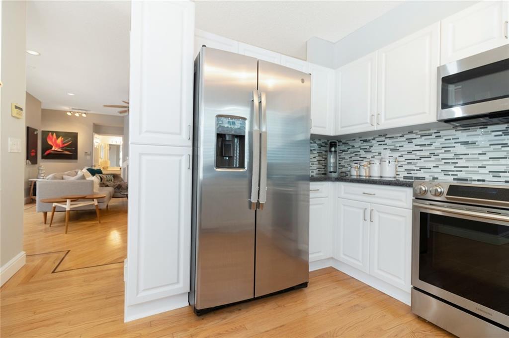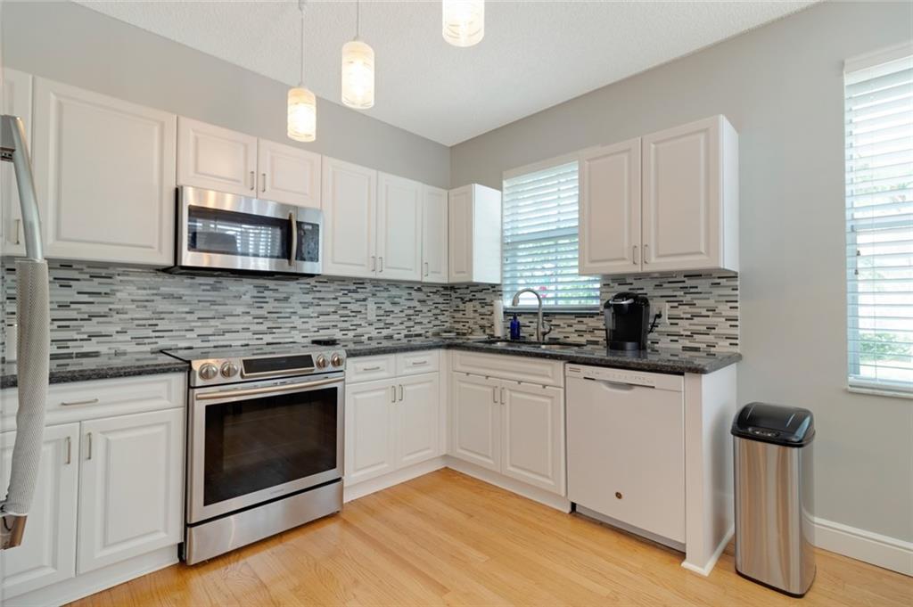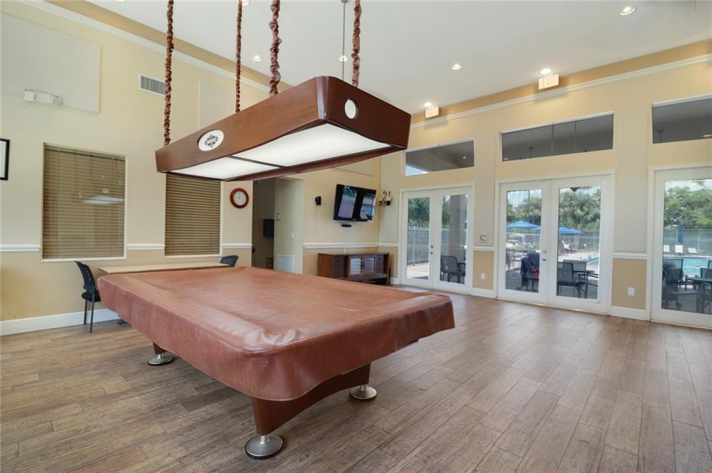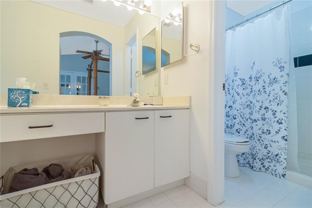 Surrounded by protected wetlands, West Lake Village stands alone in the East Side Real Estate Market. Enter the property through a screened courtyard of sealed tumbled stone pavers. Hardwood floors shine throughout the property. The eat in kitchen has been updated with new cabinets, granite counters, stainless appliances & a new backsplash. The living area is awash in light from the impact rated French doors. While the master suite is upstairs, there is a second master down, again with large, impact rated French doors opening to the courtyard. Oh, the master suite! Enter through French doors at the top of the landing. Vaulted ceilings, enormous walk in closet and master bath with both a roman tub and walk in shower.