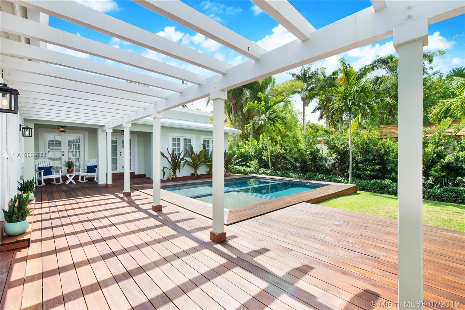 Beautifully re-envisioned 3,226 sq ft home located on a sought after street in the Platinum Triangle. An inviting front porch is surrounded by amazing native trees and plantings. Stunning wood look porcelain floors combined with custom cabinetry and millwork are the perfect palette for design inspiration. Friends and family will gather in the sun filled social areas and magazine quality chef’s kitchen. Master with attached den or nursery and spa-like bathroom. En suite marble baths in every room. Relax in your private yard while enjoying a heated jacuzzi, pool with water treadmill, pergola, and summer kitchen. Impact windows and doors and one of a select few homes in Coral Gables with a metal roof. Nothing left to do but settle in and make yourselves at home!