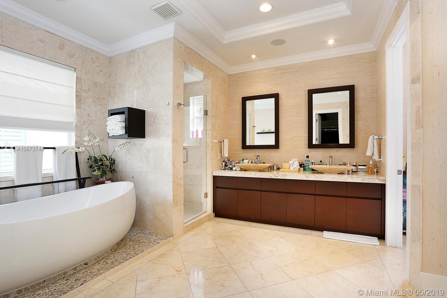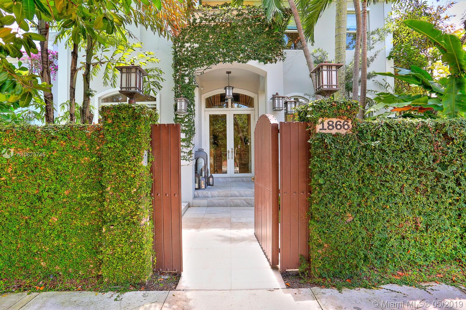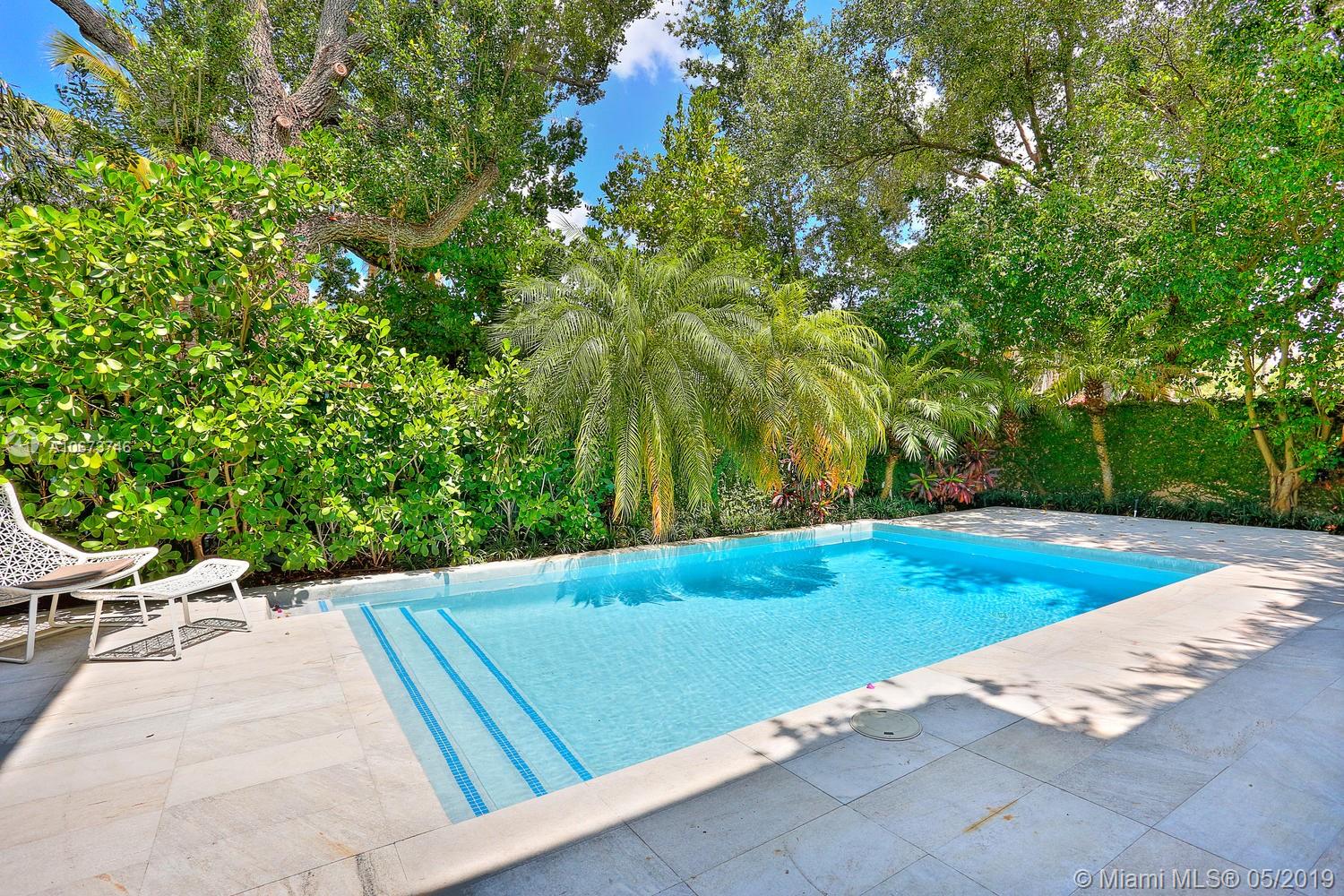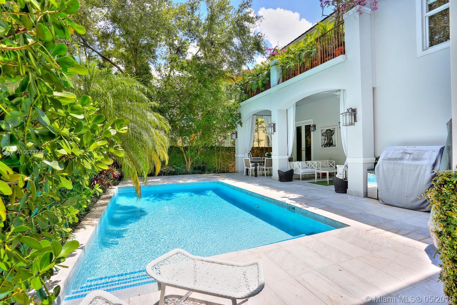Stunning, magazine quality home in prestigious North Coconut Grove. Walk to bayfront parks & marinas, yet located at one of the highest sea-level elevations in South Florida. Totally walled & gated for ultra-privacy. Light-filled living spaces offer double-height ceilings and a blending of classic architectural details with a modern vibe. Expansive formal living & dining rooms for entertaining. Family room with custom built-ins, opens to the spectacular high-end kitchen w/white-lacquered cabinetry, walk-in pantry, professional gas range & adjacent breakfast area. Incredible master suite features his/hers walk-in closets (hers: 12’ X 19’), luxurious bath w/soaking tub & private terrace overlooking the garden & tranquil pool. Minutes to the Grove village center, MIA, downtown & the Beaches.