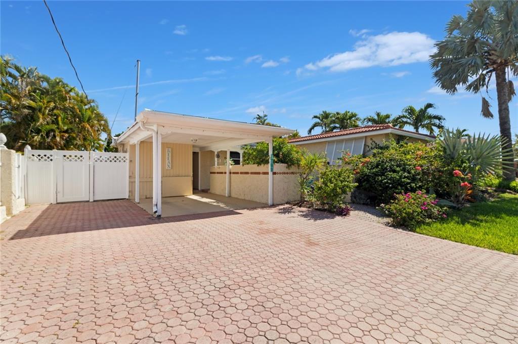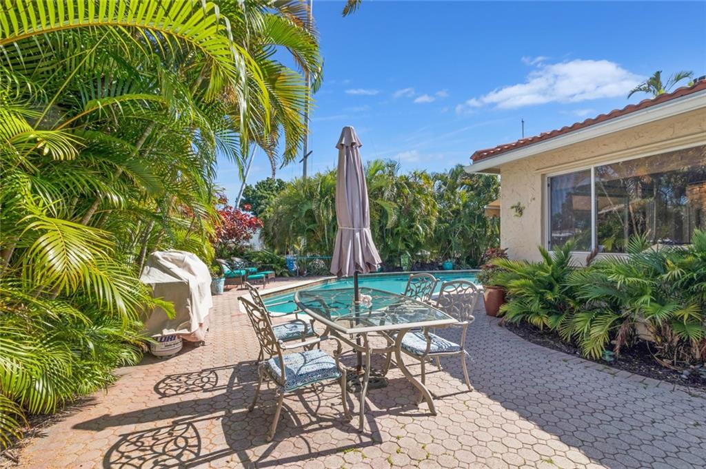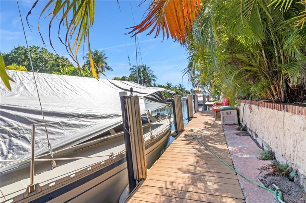 You'll love this vintage sweetheart! This two bedroom, two bathroom waterfront bungalow has a private backyard with a solar heated pool, and 65ft of water frontage with ocean access & NO FIXED BRIDGES. This light and bright home features an updated, open kitchen with custom white cabinetry w/pull-outs, granite countertops and stainless steel appliances. Home has tile floors throughout, crown molding, large closets with built-ins, modern bathrooms, and pot lighting in the living areas. Enjoy mature gardens in the front and back yard that features an covered awning with a seating area and lots of outdoor space for entertaining, the epitome of the South Florida lifestyle! Currently being leased as a legal AirBNB. NOTE: Under Mexican tile terrazo floors.
