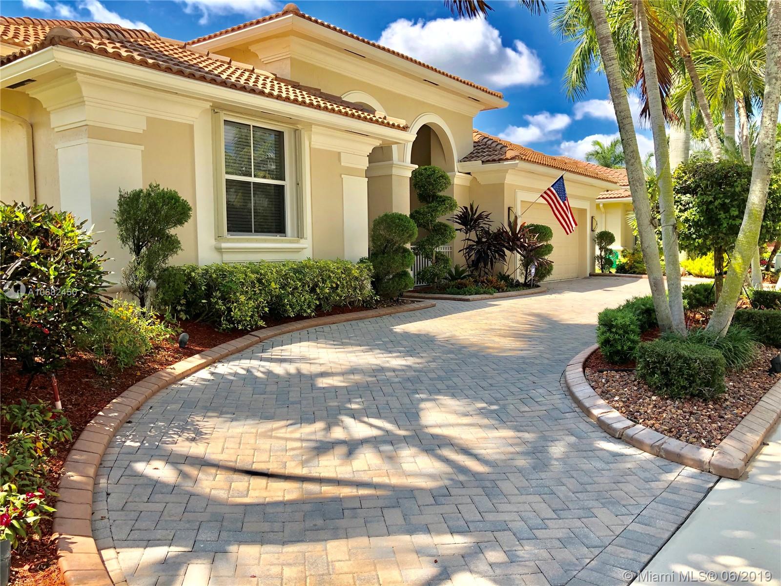 Original owners have maintained this elegant home with pride. Enter this spacious one story via your expansive circular paver driveway, lushly landscaped and enter through glass impact doors. Neutral diagonal coral stone tile flows through the living areas. Enjoy soaring ceilings and windows on private pool with paver patio, fully fenced and lushly landscaped. Split floor plan with private bedroom wing with wood floors, blinds and cabana bath to pool. Master bath with slider to patio, silloutte shades and luxurious master bath with roman tub, dual sinks. White kitchen with upgraded stainless steel appliances, center island and fashionable corian countertops. This home shows pride of ownership. Full accordion protection. Walk to community park.