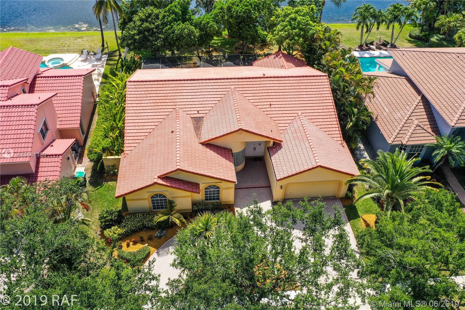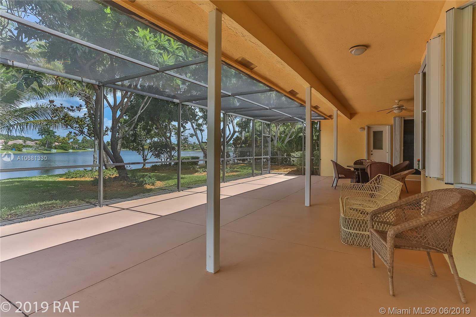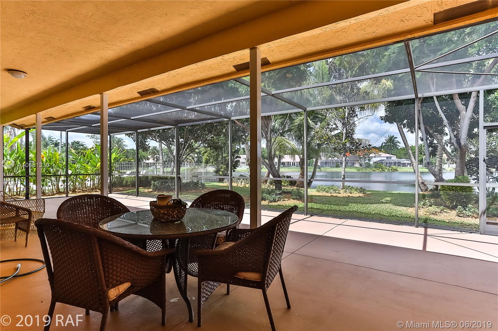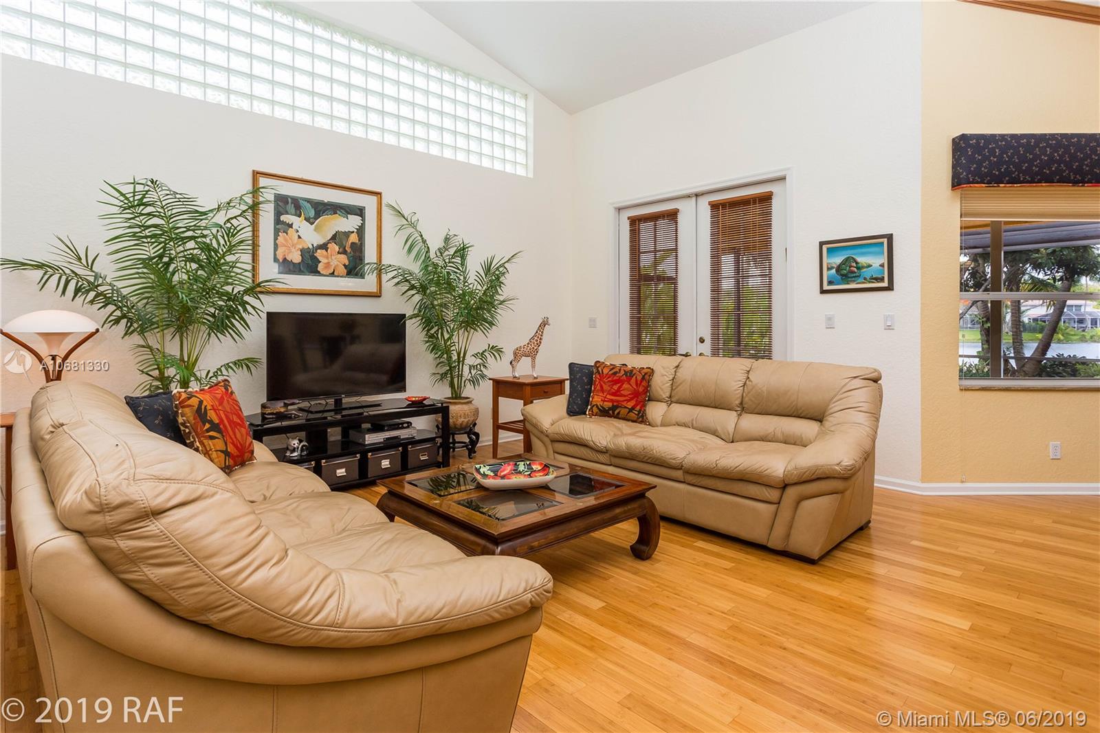 Beautiful 4 bedroom Monaco model set on a fabulous 12000+ SQ FT lakefront lot with 80' on the lake; and located in the prestigious Estates section of guard gated Embassy Lakes. You'll love the completely remodeled island kitchen with custom built wood cabinets, granite counter tops and back splash; and all stainless steel appliances. You'll find top of the line solid bamboo flooring in all the common areas and carpet in the bedrooms. Soaring vaulted ceilings add to the spaciousness you'll feel throughout the house. Step through the French doors from the family room onto the large, covered and screened patio shaded by lush tropical landscaping and fruit trees. The S-tile roof was replaced in 2007. **LISTING PHOTOS ARE COPYRIGHT PROTECTED. UNAUTHORIZED USE IS PROHIBITED**