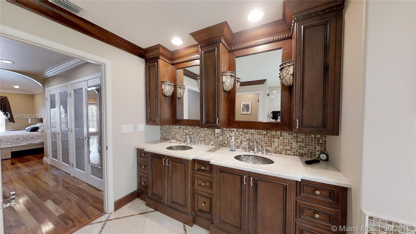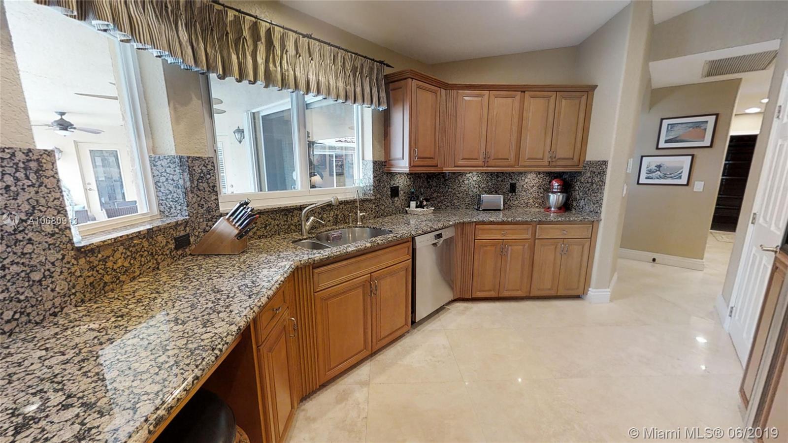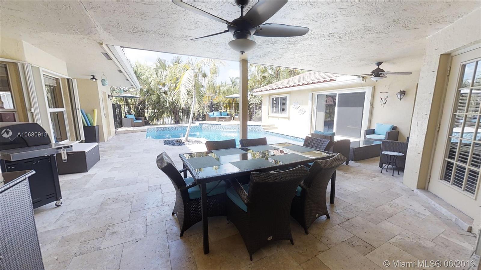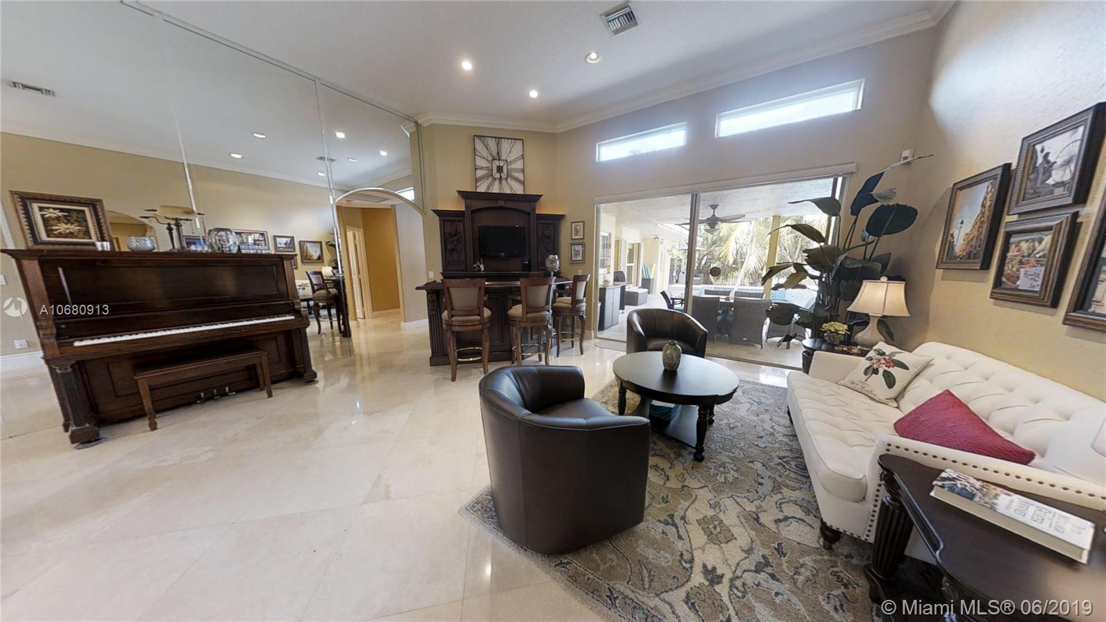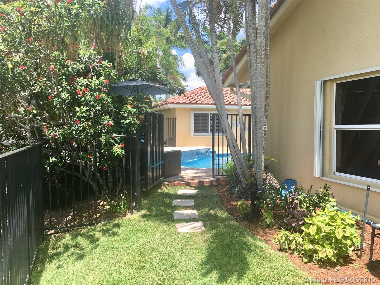 Beautiful and unique lake home with a pool in Sunset Springs. 5 bedroom, 3.5 bath where the 5th bedroom and 3rd full bath are in a full in-law suite with sitting area, kitchenette and separate entrance overlooking the pool. Updated kitchen with granite counters, large pantry and stainless steel appliances. All bathrooms are upgraded. Marble floors throughout the house living area. 2007 roof. Custom wood bar. Full of upgrades: impact windows & accordion shutters combination, power generator, recently resurfaced pool with salt system, LED recessed lighting, new water heaters, reverse osmosis water filtration system, widened driveway with pavers, camera door bell, sprinkler's water from the lake. Extra large corner lake lot across the community's play ground. A definite must-see!.