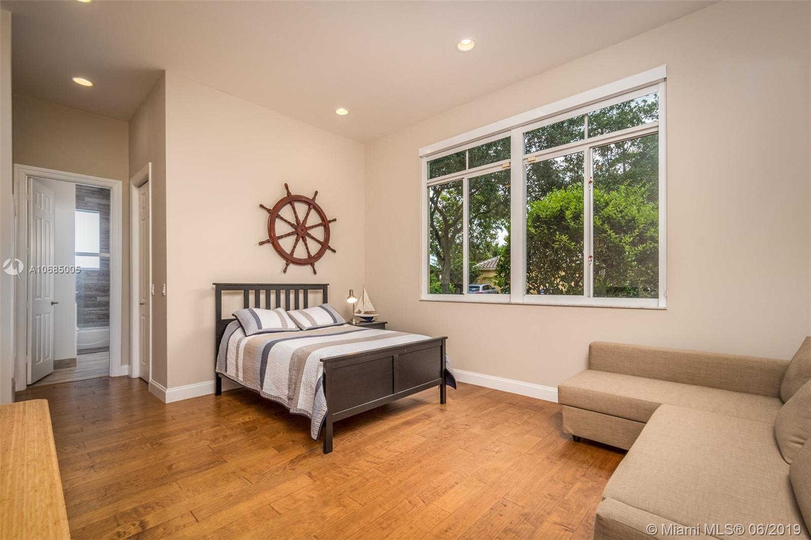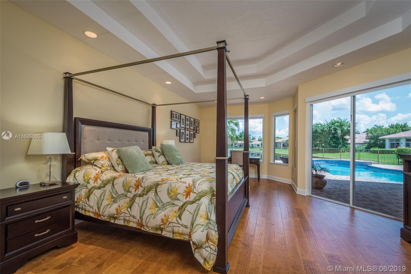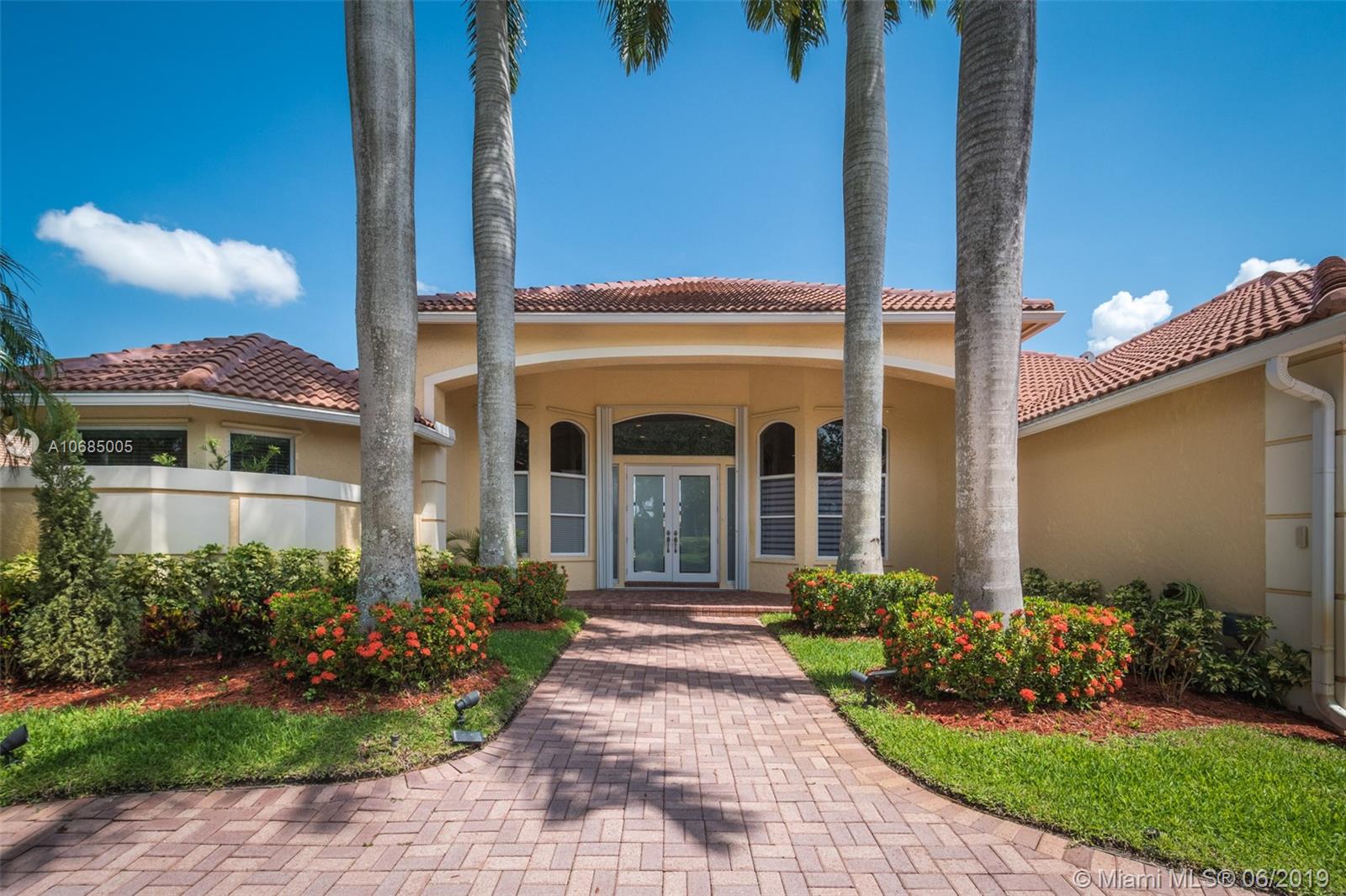 This is the one you have been waiting for. Expanded custom one story home on a private oversized 17,796 square foot lot. Enjoy long lake views with newly renovated heated pool - chlorinated but could be salt*cascading spa*spacious covered paver patio*summer kitchen*fully fenced*across the street from the community park. Chef's Delight kitchen*marble center island 9x5 with seating*top of the line Stainless Steel Appliances*Custom wood floors*Master bedroom with custom built in closet*glass doors*shoe closet*Marble Master Bath*Spa.Newer addition 2010 with full impact glass protection. Kid Wing includes large playroom*guest room*office* Newer Roof*Newer A/C's*Accordions*Fireplace