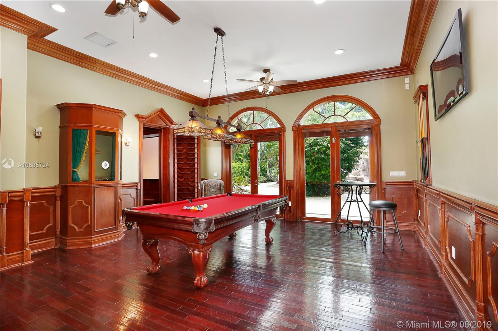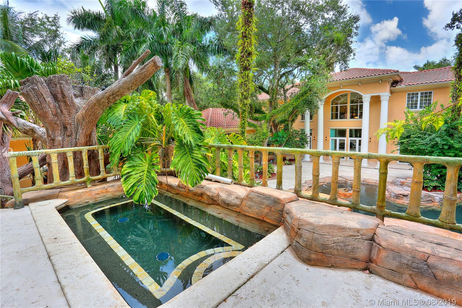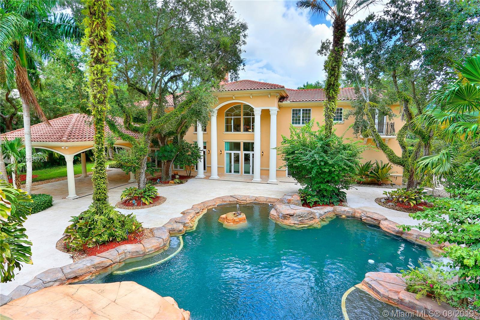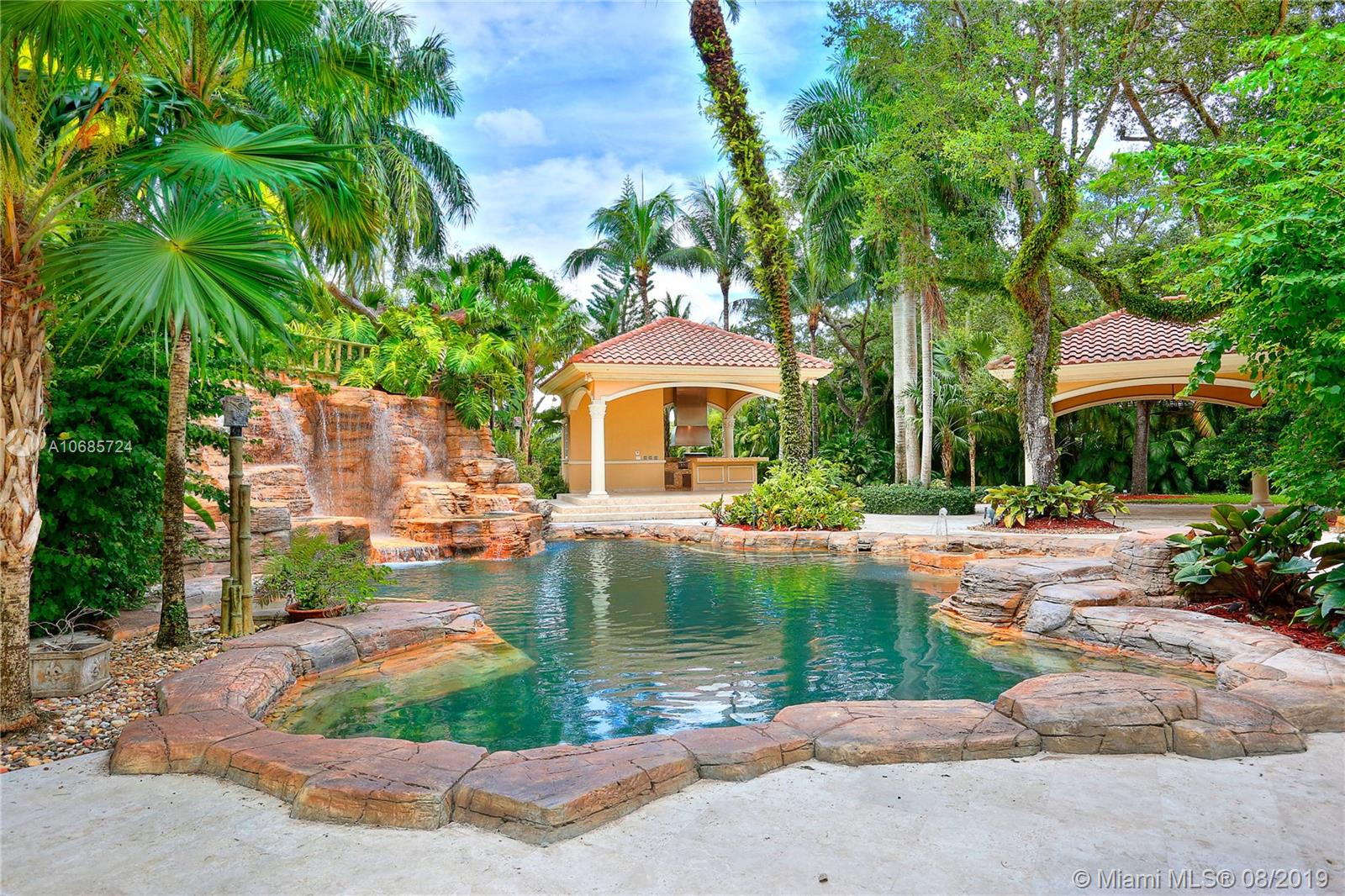 Majestic and Gated 2 Story Estate on Lush Acre Plus! Custom built 9792 sq ft. on 51,400 sq. ft lot! Grand Entrance Foyer with double staircase! Grand Spaces and double volume ceilings with Finest Finishes and Details throughout! Banquet sized formal dining and living room, 6 en-suite bedrooms, Elevator, 13 Seat Home Theater, Billiard/Game room, Cherry Wood Office/Library and separate building on property with Gym and extra storage. Amazing back yard for entertaining featuring oversized covered terraces, Resort Style Pool with a Cascading Waterfall & Second Story Jacuzzi, (pool was featured in Pinecrest Magazine in Aug 2014). Outdoor Kitchen with Cabana Bath and Professionally Manicured Landscaping with Majestic Palm Trees throughout.
