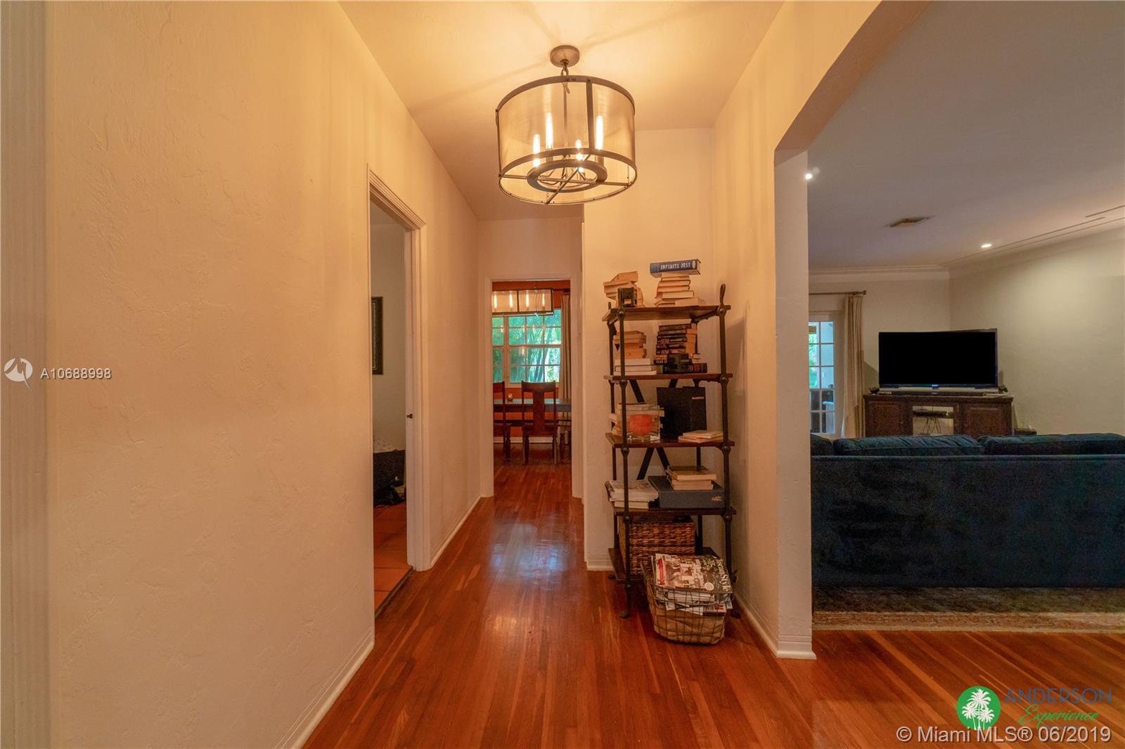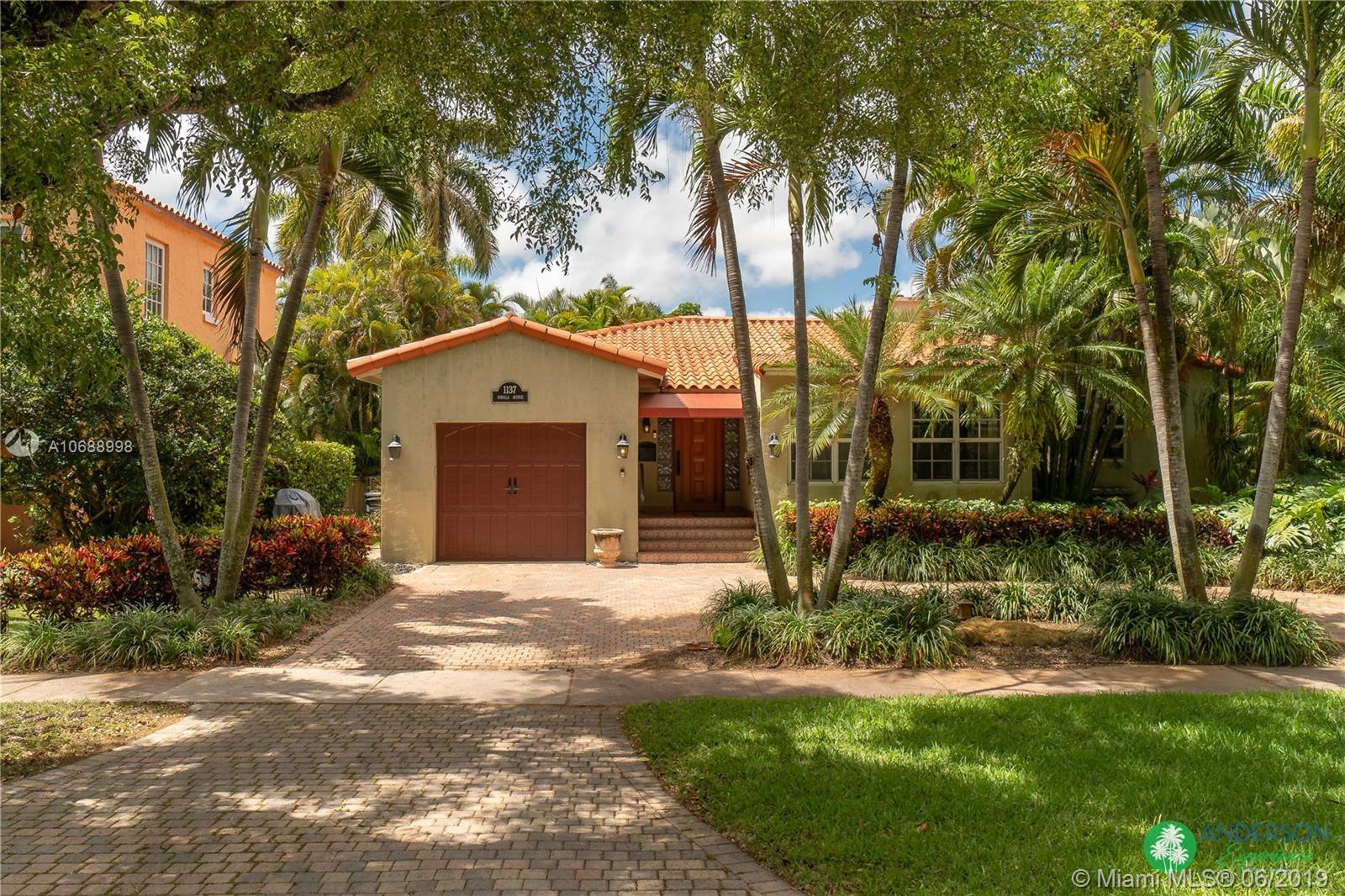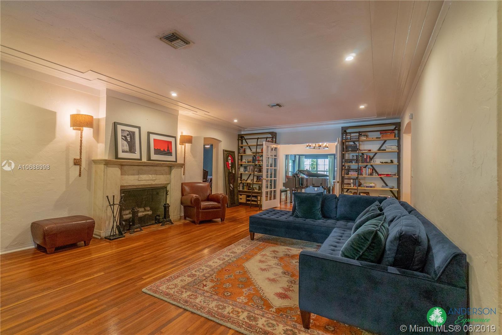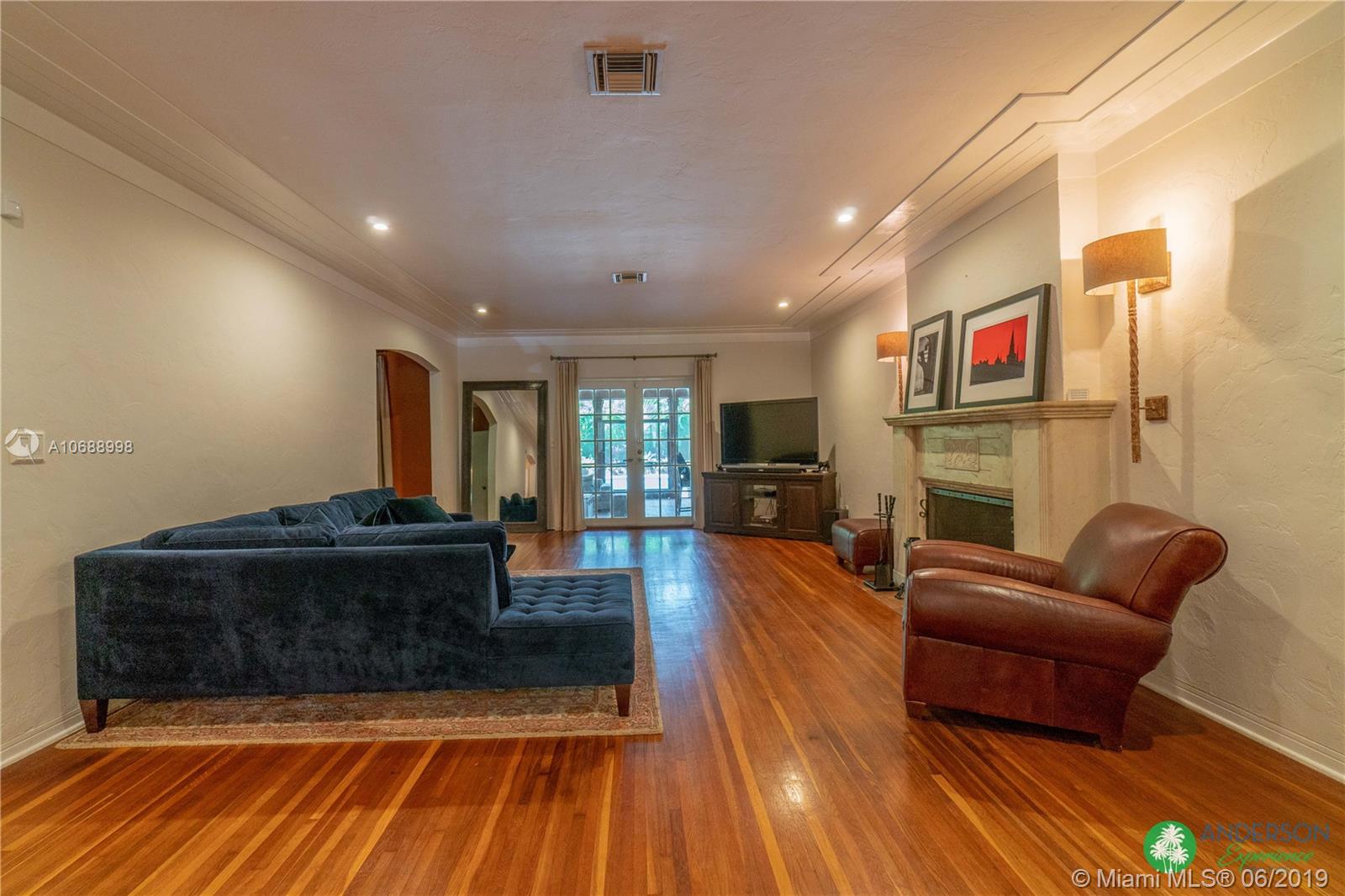 Great house to call home! Located a few blocks from Granada Golf Course and the Coral Gables Country Club. Built in 1944, this charming Art Deco home sits on a beautiful tree lined street w/ a circular driveway and a 1-car garage. The living room has beautiful Art Deco features in the ceiling & mantel of the working fireplace. The home is a split plan 3b/3b. The master bedroom features a walk-in closet & master bath w/ his n’ hers sinks. From the living room, French doors open to a huge screened in patio w/ wood beam vaulted ceiling, wet bar, serving station, and plenty of room for a dining table and seating area. Sparkling salt water pool with brick paved deck area, tropical landscaping, detached gazebo.