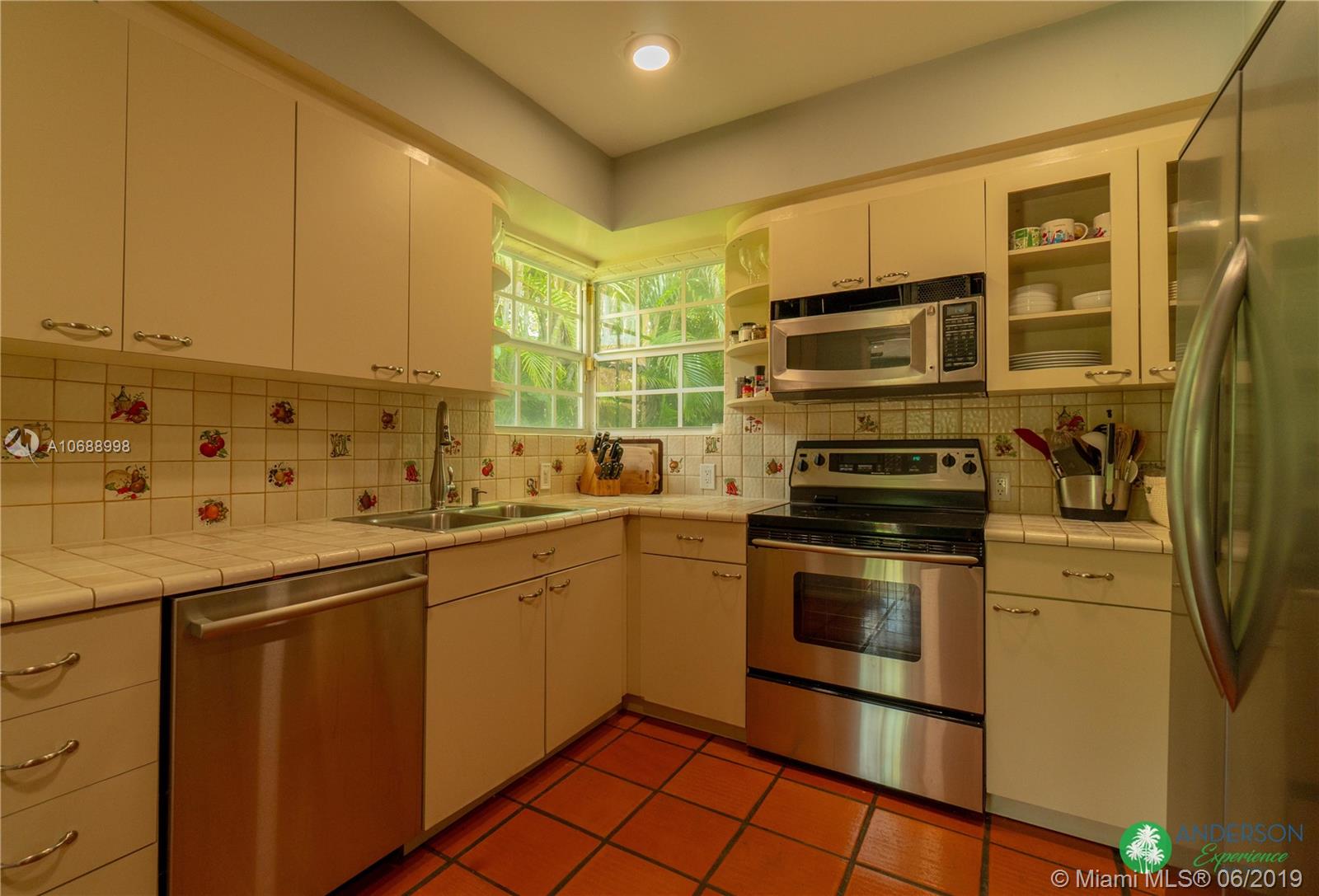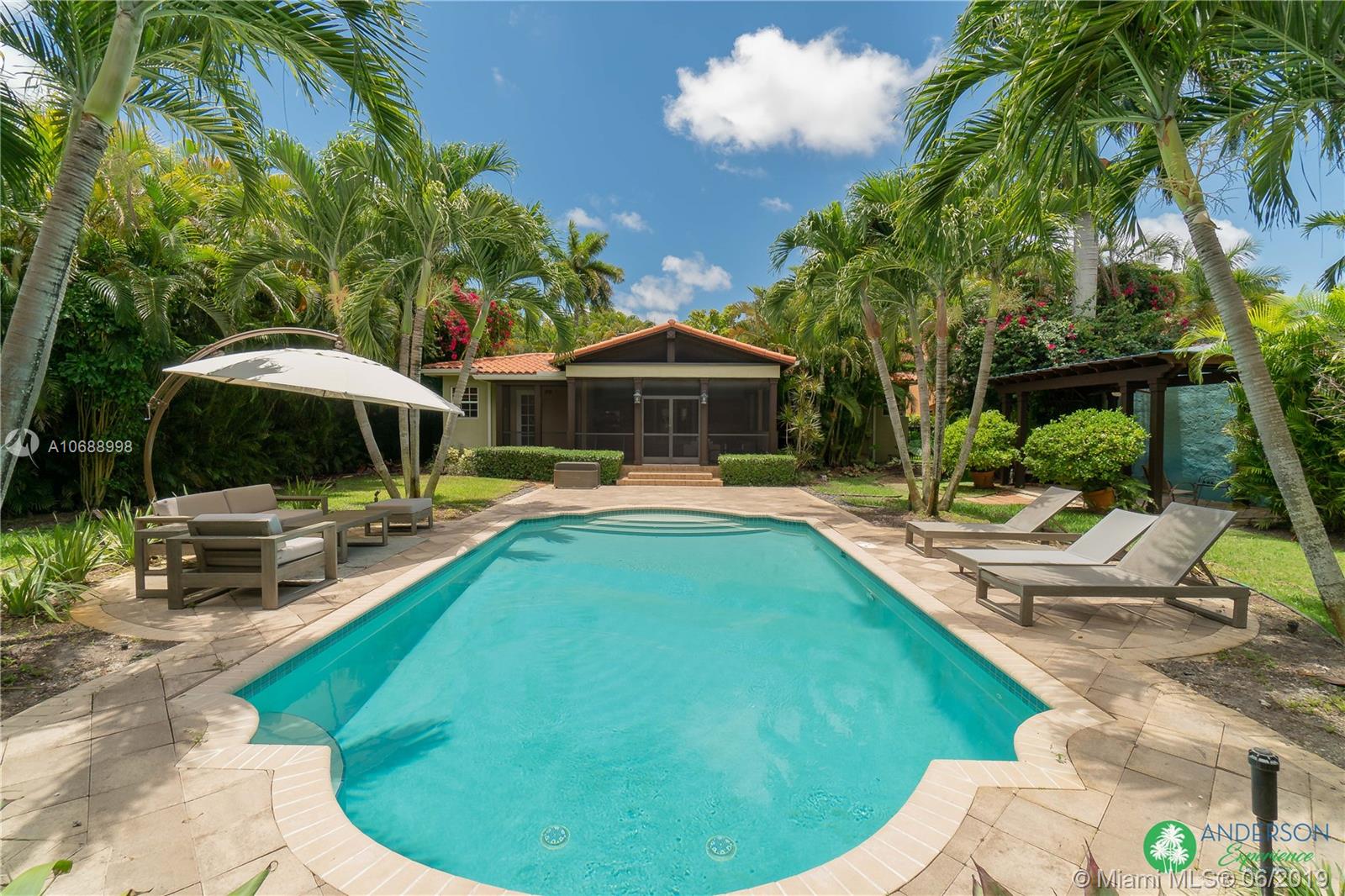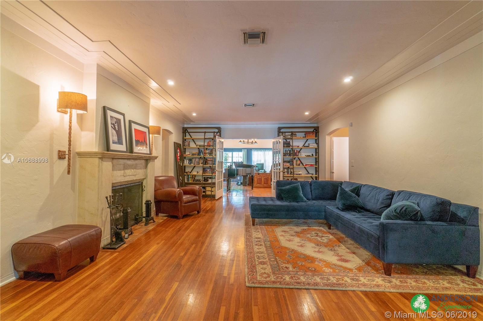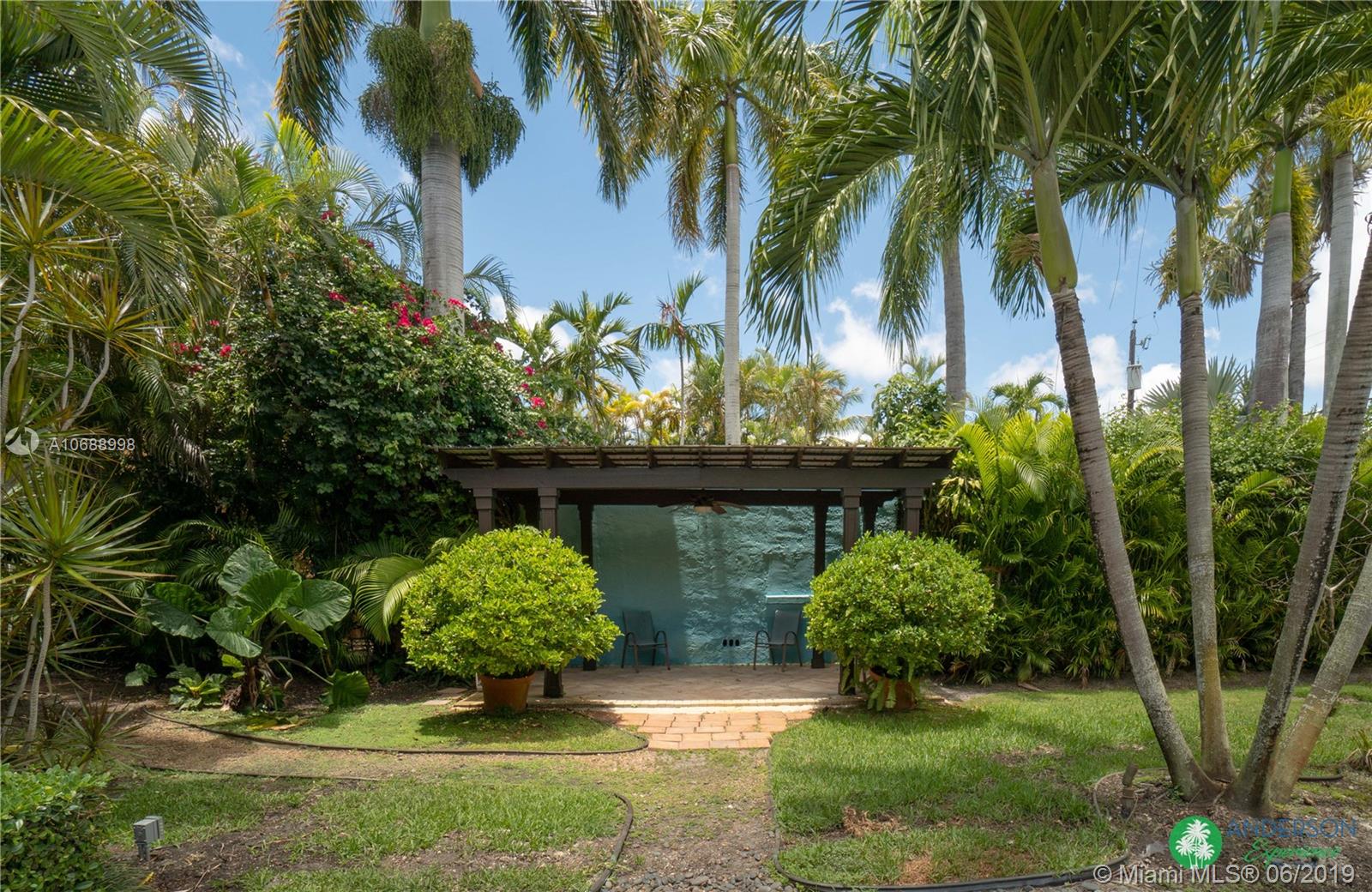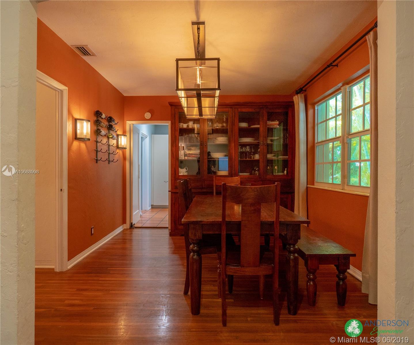 Great house to call home! Located a few blocks from Granada Golf Course and the Coral Gables Country Club. Built in 1944, this charming Art Deco home sits on a beautiful tree lined street w/ a circular driveway and a 1-car garage. The living room has beautiful Art Deco features in the ceiling & mantel of the working fireplace. The home is a split plan 3b/3b. The master bedroom features a walk-in closet & master bath w/ his n’ hers sinks. From the living room, French doors open to a huge screened in patio w/ wood beam vaulted ceiling, wet bar, serving station, and plenty of room for a dining table and seating area. Sparkling salt water pool with brick paved deck area, tropical landscaping, detached gazebo.