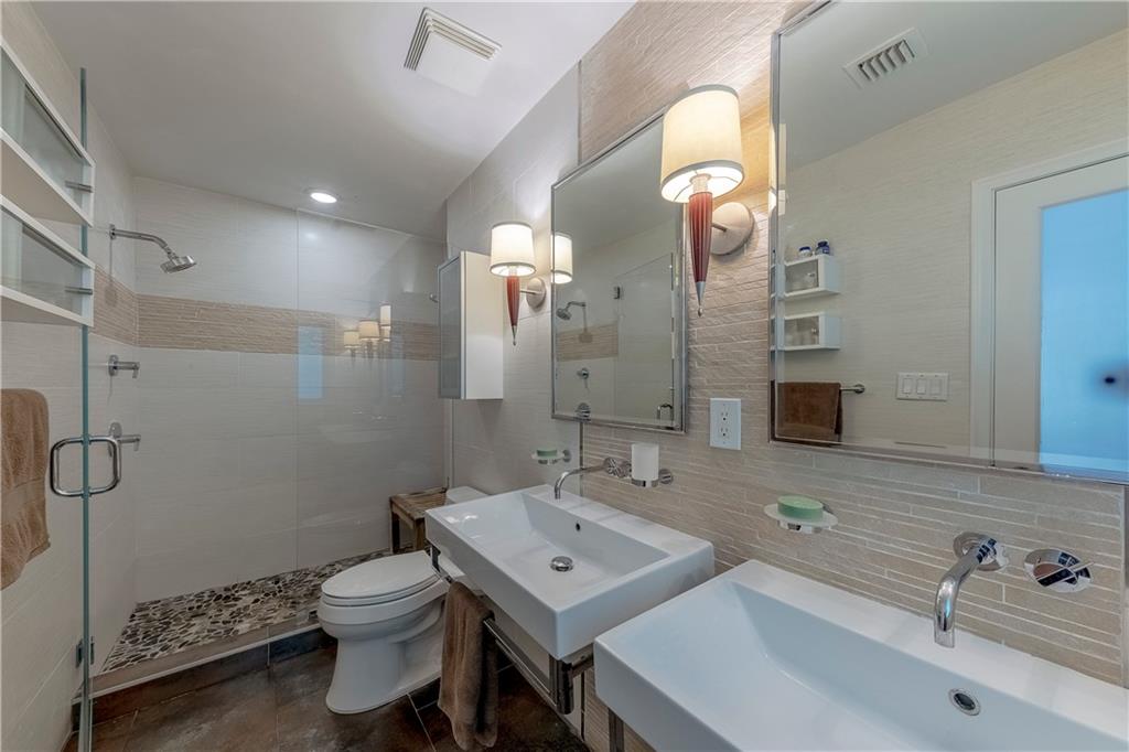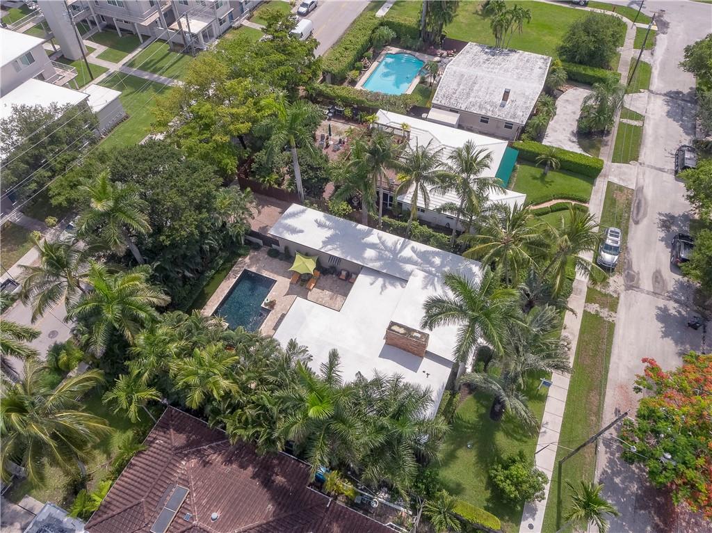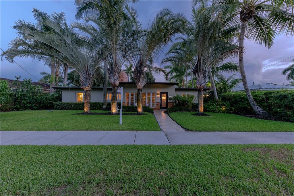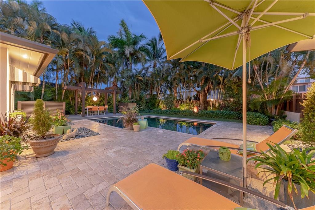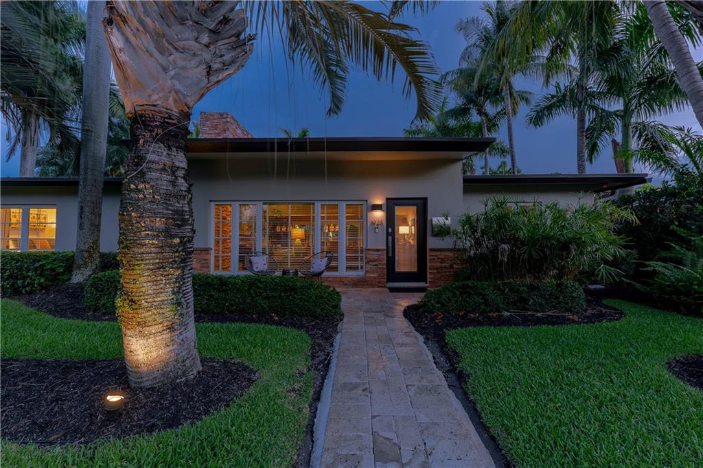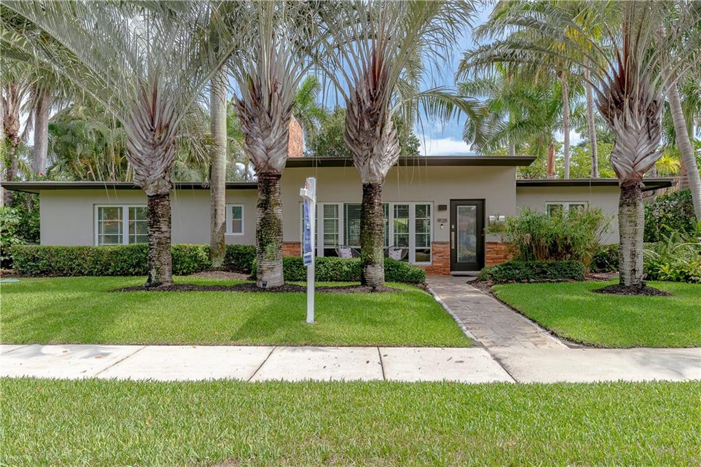 A beautifully modernized Victoria Park Mid-Century is a sterling representation from the Atomic period. This three bedroom, three bath home with a Den boasts an iconic stacked Sandstone wall and room divider, wood burning fireplace, soaring vaulted ceilings, polished slate flooring and sloping roof lines. Features include impact windows and doors, whole house generator, over-sized single bay garage with storage loft and Chef's kitchen with premium stainless appliances including a Thermador gas range, hardwood cabinetry and granite tops. A spacious Breakfast bar separates the kitchen from the dining room. The very private fenced yard is surrounded by spectacular architectural gardens with marble pavered terrace, thoughtful dining loggia overlook a sparkling pool.