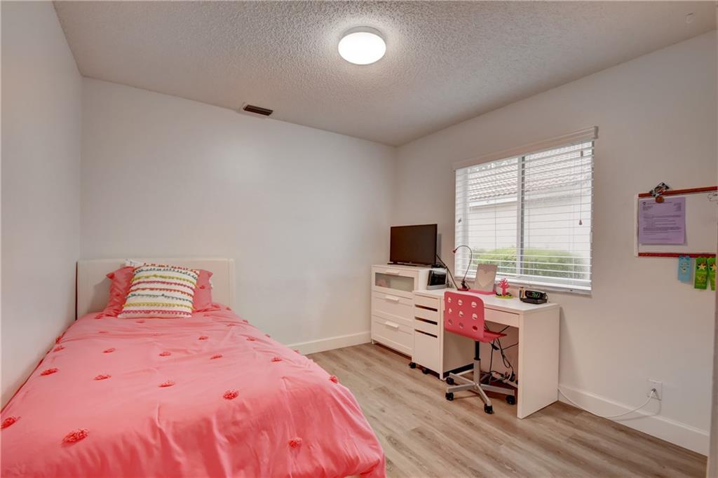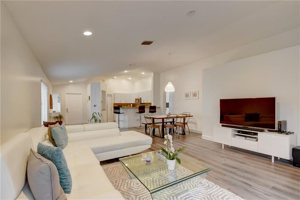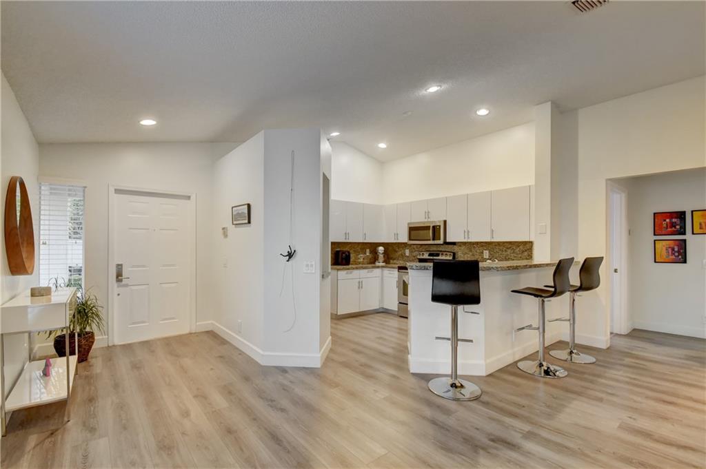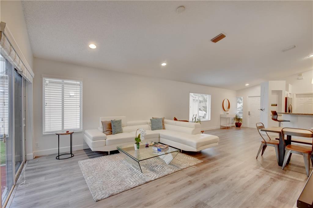 Beautiful 3 bed/2 bath in pristine condition. Quality wide plank laminate flooring throughout professionally installed 2015 in mint condition & today’s colors; Open kitchen with new sleek European modern cabinet doors & nickel pulls & granite counters & snack bar; SS microwave & garbage disposal 6 months new. Stove, dishwasher, refrigerator ALL new 2013; Washer 2014; A/C & water heater 2013; 2 Car garage newly painted w/special coating & industrial attached shelving conveys w/sale; 2nd Bath remodeled with today’s hottest materials; Split plan w/custom closets - Master is a walk-in closet; Large screened patio perfect for entertaining. Hurricane shutters.