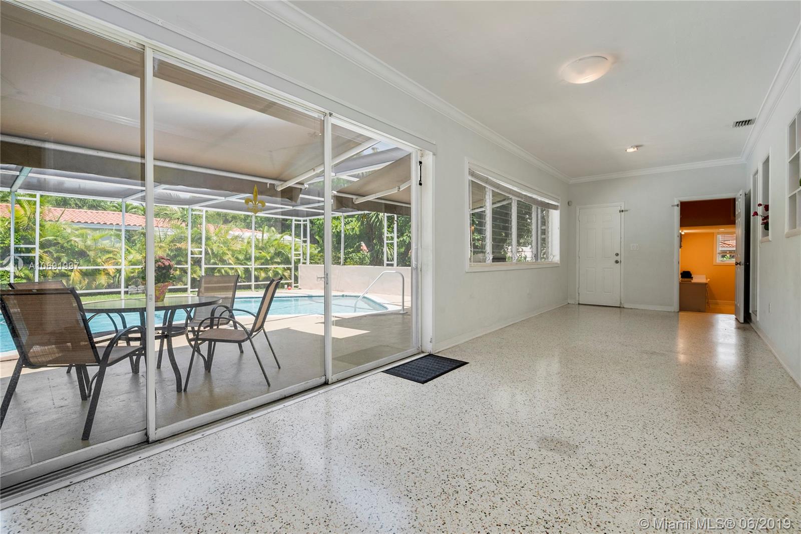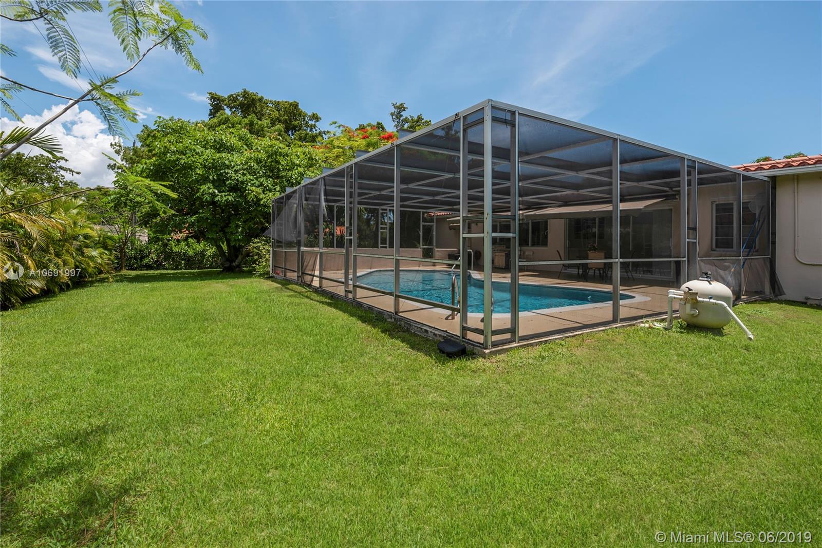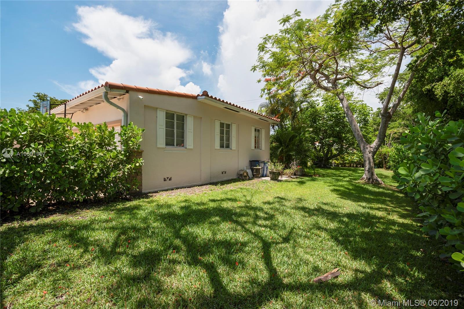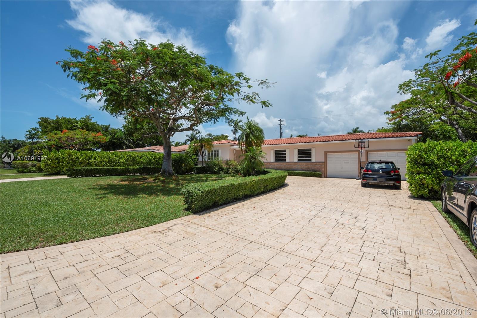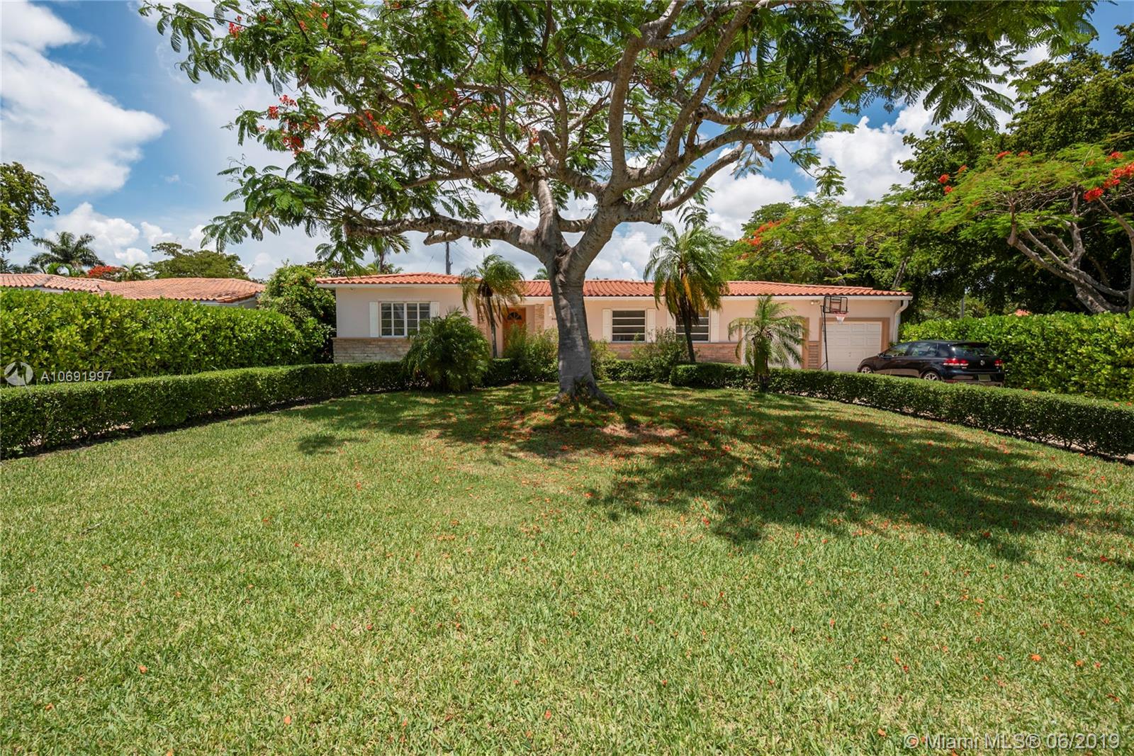 Lovely mid-century home set back on exclusive Riviera Dr.; close to world-class shopping & dining at Merrick Park and downtown Coral Gables. 2 BR’s/ 3 full BA’s + bonus room easily converted to 3rd BR. Light-filled living spaces (including formal living, dining and family rooms) feature wood & terrazzo floors. Expansive terrace and pool is surrounded by a tropical garden with majestic Royal Poinciana trees & exotic palms. Excellent opportunity to expand & renovate the current home which sits on a 12,000 SF corner lot. Roof, electric & plumbing systems already updated. 2CG. Just minutes to UM, the Grove village center’s bayfront parks & marinas, MIA, downtown Miami & Brickell.