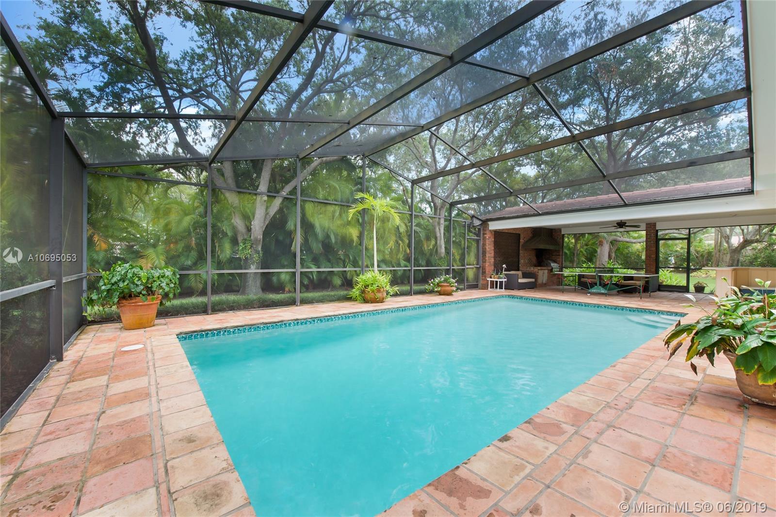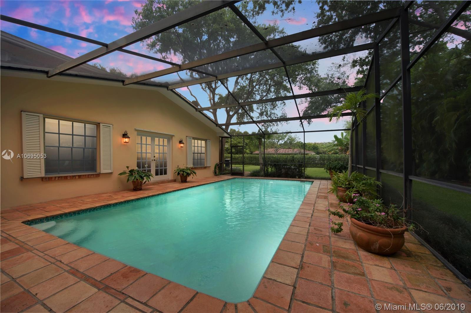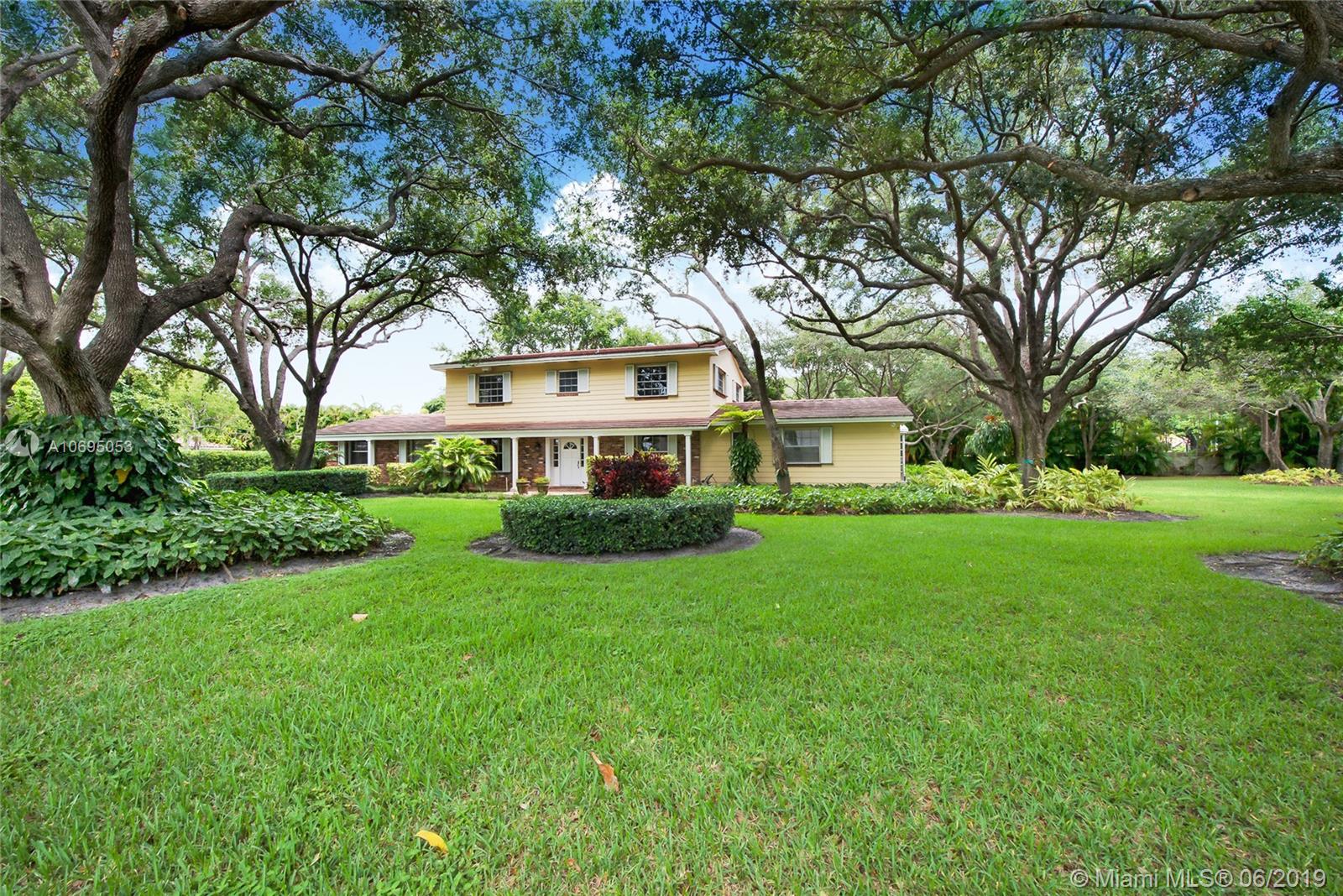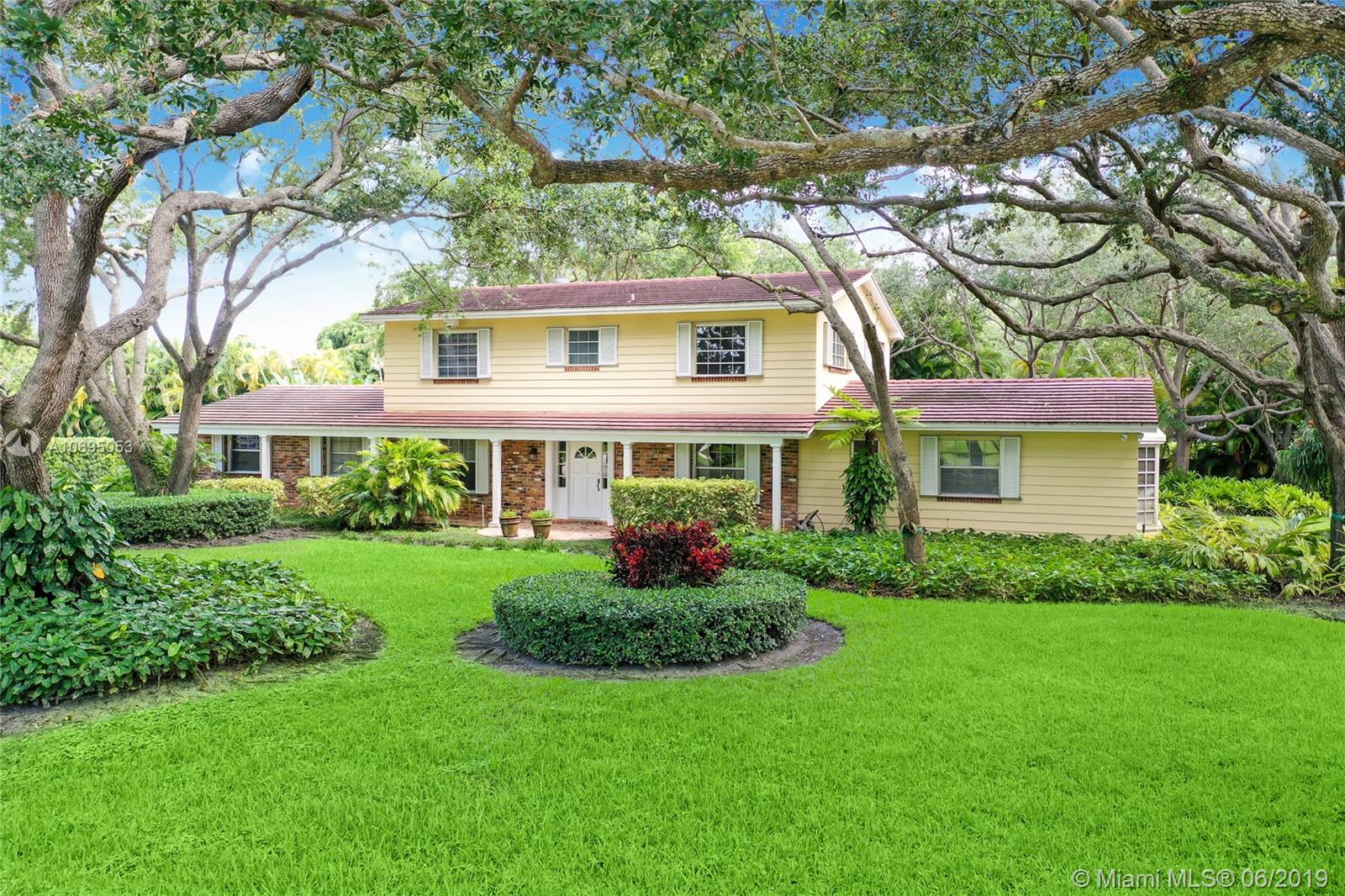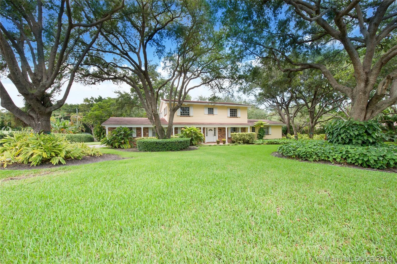 Located in Pinecrest's family-friendly walled community, The Elysium. This 6 bed / 4 full, 1 half bath residence is nestled on a lush manicured substantial 30,993 sf lot. This 2-story charming home is comprised of 3,598 sf and includes formal living and dining room, kitchen with breakfast nook, and family room overlooking the screened patio complete with covered terrace, pool, built-in barbecue and wet bar. Master Suite is located on the first floor and features a large walk-in closet, roman tub and separate shower. Double Jack and Jill floor plan upstairs. Laundry room off of the 2 car garage. Ideal for a developer interested in an opportunity in a great neighborhood. Dining Room chandelier excluded from sale. Minutes from A+ rated schools, shops and restaurants.