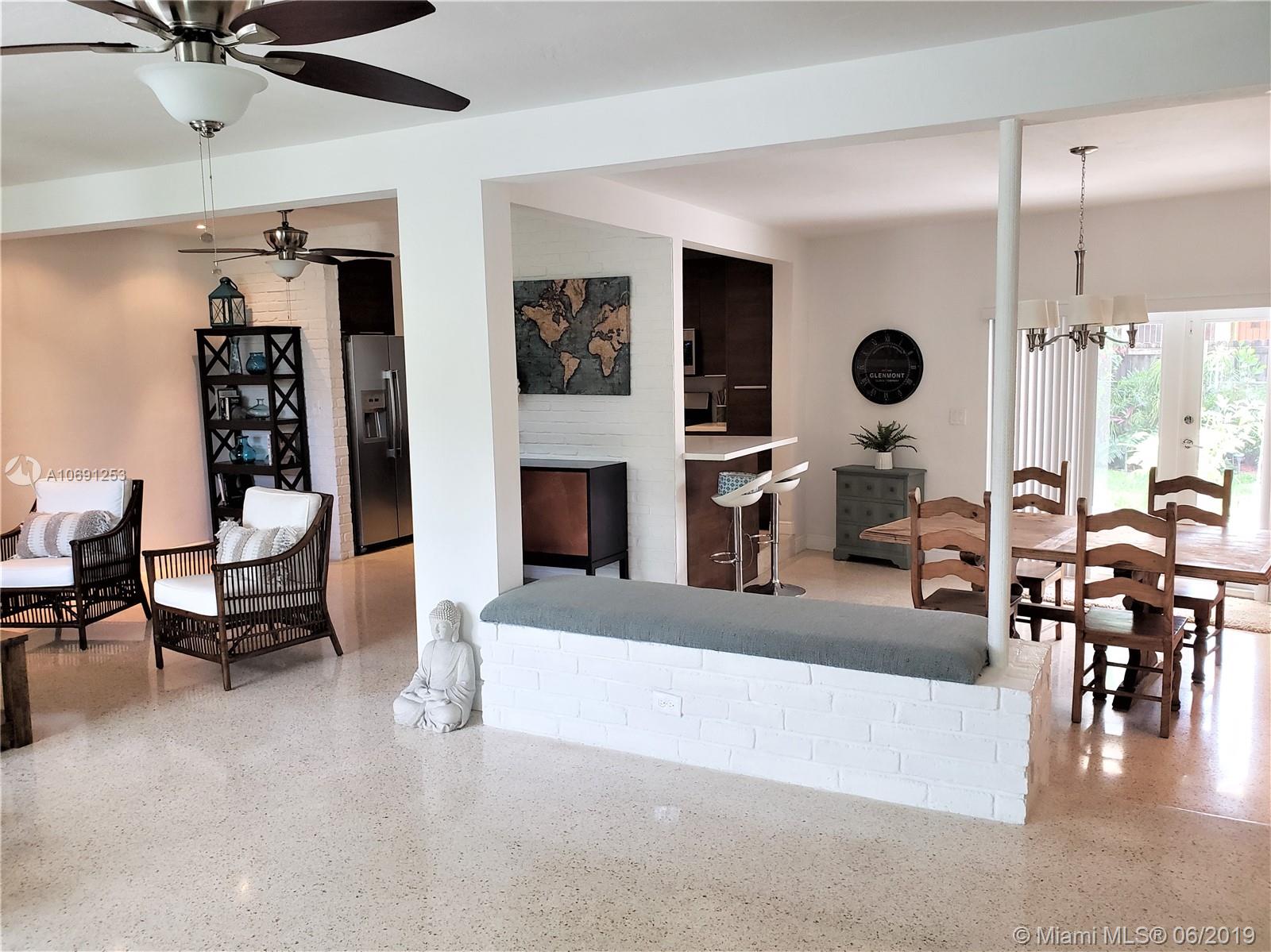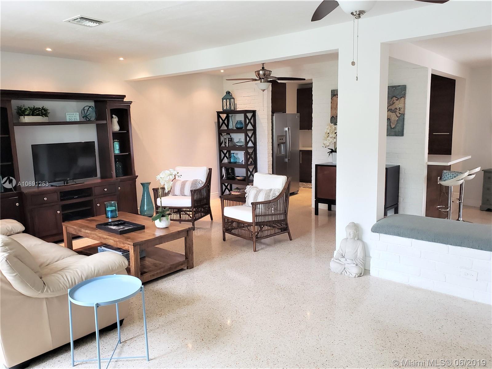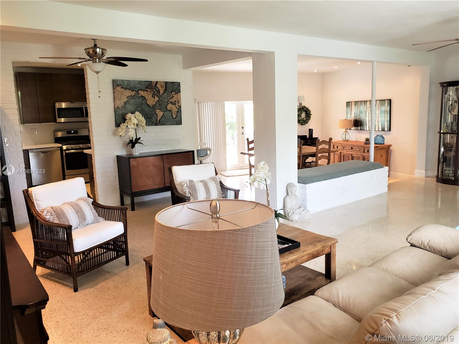 Charming Mid-Century 3/2 with beautiful garden view and wonderful landscaping. Bright and Spacious Living area with updated kitchen, stainless steel appliances, and Quartz counter-tops. Terrazzo and oak wood floors throughout Hurricane impact doors and windows CAT 5 rated. French doors lead to the back yard with wood deck and canopy for relaxing.
