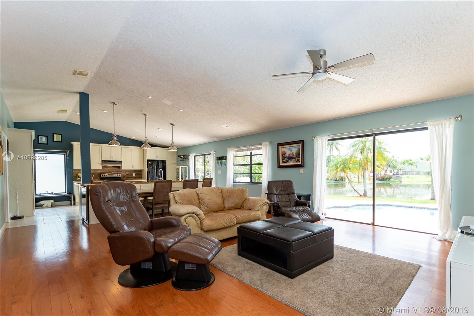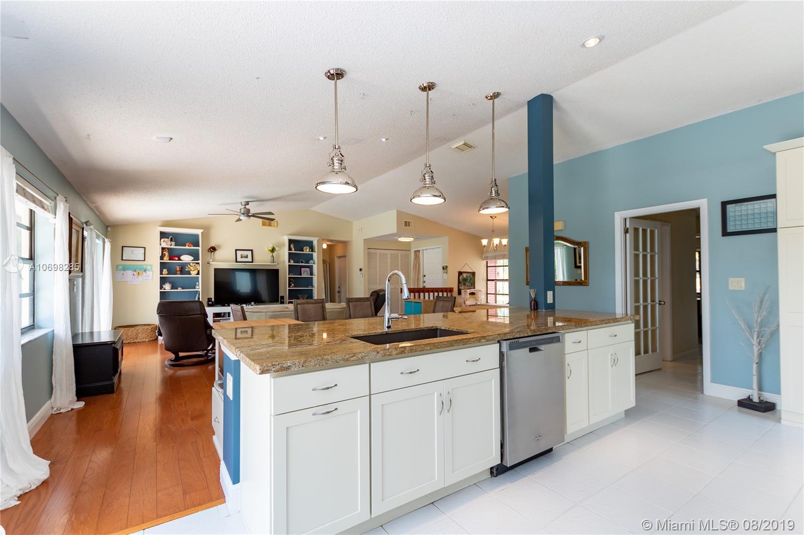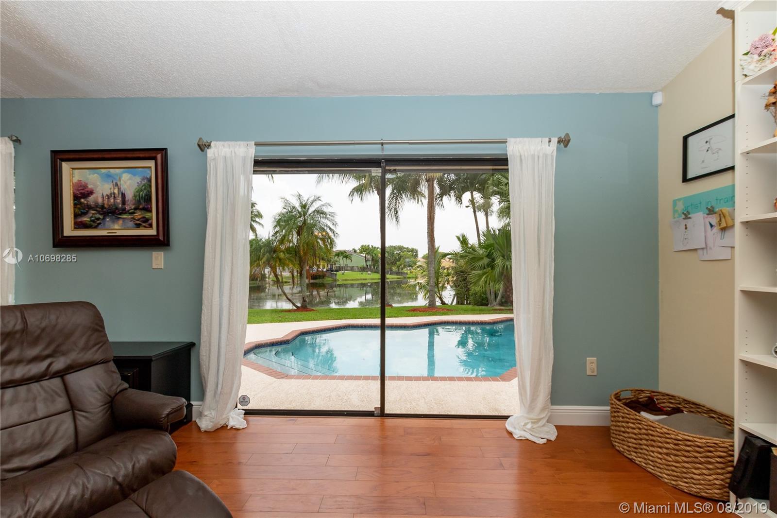 Updated WATERFRONT home with pool located in the Shenandoah community! Tile & hardwood flooring run throughout the home - NO CARPET! Open floorplan includes great room, kitchen and dining room currently utilized as a playroom. Kitchen was relocated creating an open floorplan & renovated featuring solid wood cabinets, granite counters, reclaimed barn wood backsplash, oversized island with built-in banquet seating, and wine fridge! Updated master suite has oversized shower, and walk-in closet. Step outside to the open patio and enjoy your private oasis complete with pool and water view, where you can also see the incredible sunsets in the evening. Other features of this home include new A/C & pool pump (2019), newer solar hot water tank with solar panel, utility sink in garage and MORE!