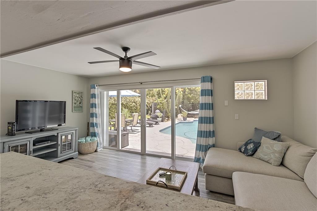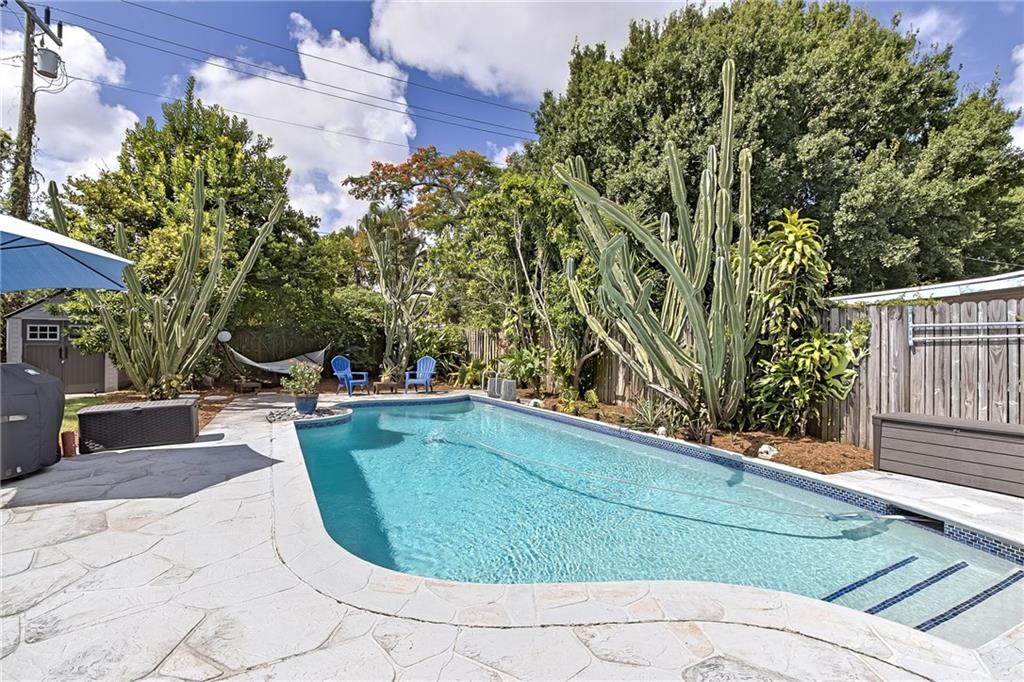 Remodeled 2 bedroom 1 bath spacious pool home. Newer kitchen with granite counters,gas stove & upgraded appliances. Home offers room at entrance that can be used as an office or sitting area, living room, dining & family room. Family room has sliders that lead out to the pool. Bathroom recently completely remodeled with walk in shower. Newer engineered wood flooring throughout entire home. Home has hurricane protection for windows and doors. Recently painted inside and out for nice fresh look. Large backyard with big pool that was recently resurfaced & also with new pump and filter system. Water heater and central a/c are newer as well. Double wide driveway is newer with one car carport. Washer and dryer are in carport area. Nice residential area close to downtown and airport. SHOWS WELL!