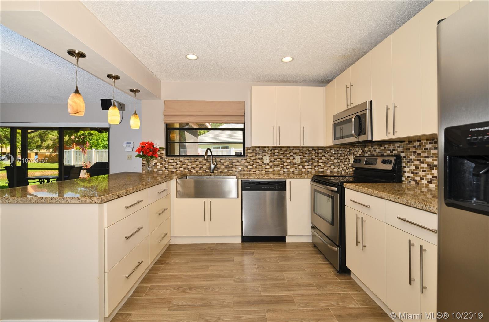 Inviting home in tranquil Cul de Sac. Serene backyard with water views. Nicely redone throughout. Open concept kitchen with stainless steel appliances & granite. Spacious room with two updated bathrooms. Great room excellent for family and entertainment. Wood tile throughout all the house. Roof has been replaced. Inspiring screened patio with captivating view. No HOA. Just minutes from Sawgrass Expw, parks, aquatic center, dogs parks, shopping!