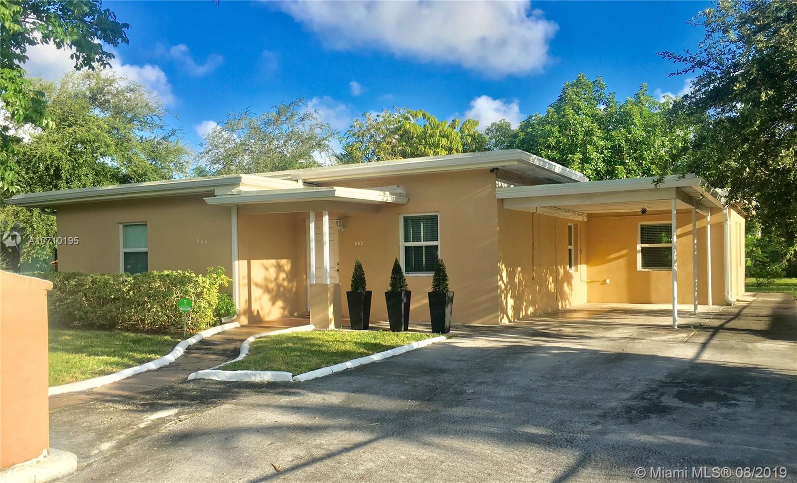 Beautifully Updated 3/2 Home with hurricane impact windows throughout. Completely fenced in yard with driveway and carport. Nice size backyard with plenty of room for a pool and deck! Kitchen is updated with with granite countertops, stainless steel large fridge and newer cabinets. Space for dining table in dining room. HUGE Master with en-suite update bathroom and walk-in closet off. The master is situated off to side of house for maximum privacy and even has a separate entrance. Can be considered a duplex according to tax records. High Efficiency Washer & Dryer! Warrantied roof for 6 more years with hurricane insurance deduction. Not in a flood zone + low insurance! Built in camera system for security. Tile Floors throughout and nice cherry wood laminate floors in the bedrooms.