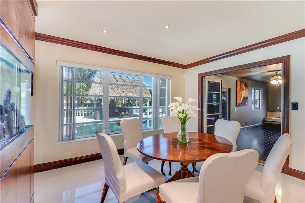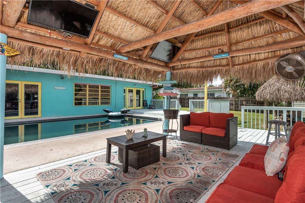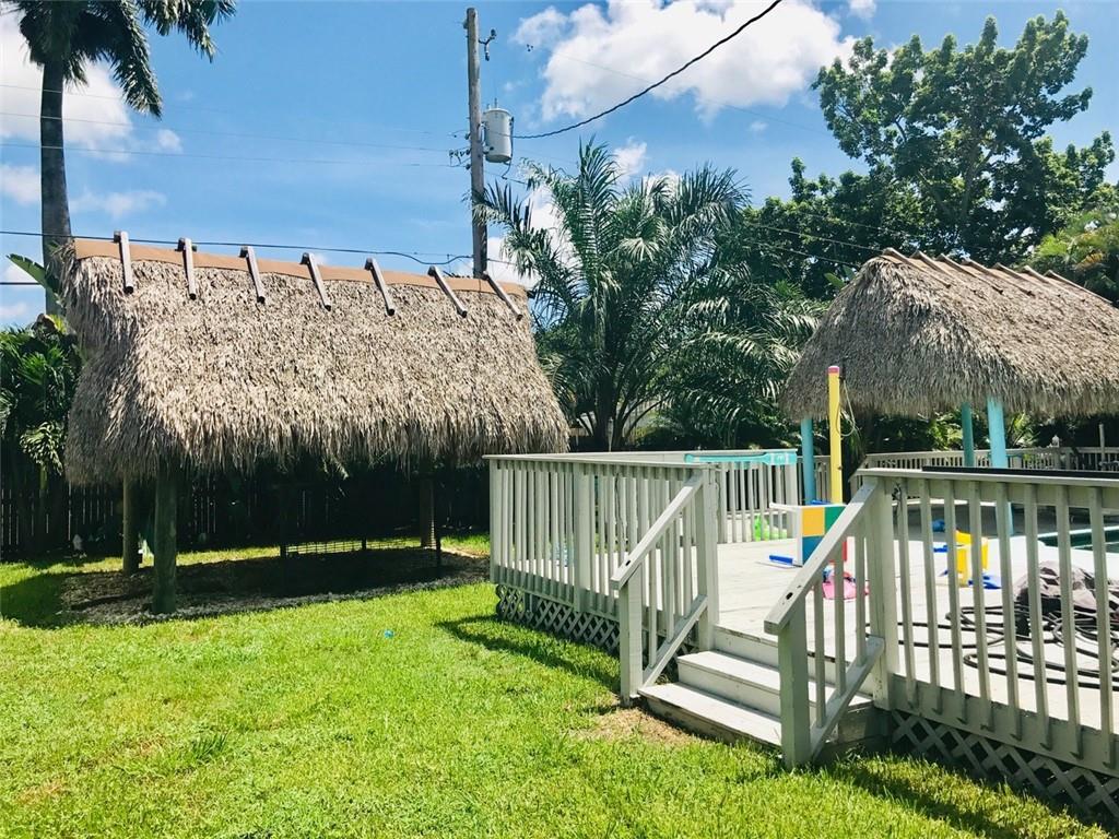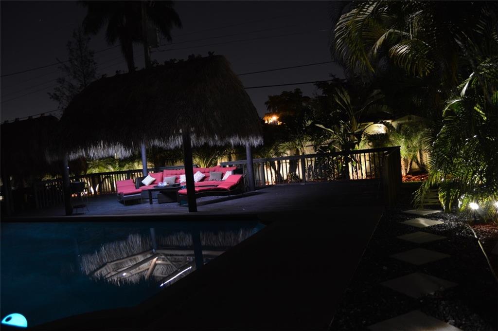 Beautifully Upgraded 3/2 home + Large Bonus Room (275 sqft) + Huge Patio Deck (925 sqft), Remodeled Kitchen w/ Stainless Steel Appliances & Granite Counter Top, Wine Refrig, 200G Saltwater Fish Tank enclosed in Floor to Ceiling Custom Cabinetry, Crown Molding, Tankless Water Heater, Bonus Room for Office/Man Cave, 24" Porcelain Tile, and Java Bamboo Hardwood Flooring. Enjoy the Expansive Backyard, Elegantly Landscaped for Tranquility and Relaxation, Black Pearl Diamond Brite Pool, Child Safety Pool Net, Water Flecks Pool Deck Surface (like Splash Pad), w/2 Authentic Seminole Chickee Huts, one for bonfire/wood fire. Electricity/Lights in the Shed and Chickee with TV. Wood Fence provides Privacy in Backyard and Side Swing Gate allows Vehicle Access in/out. Roof (2014)