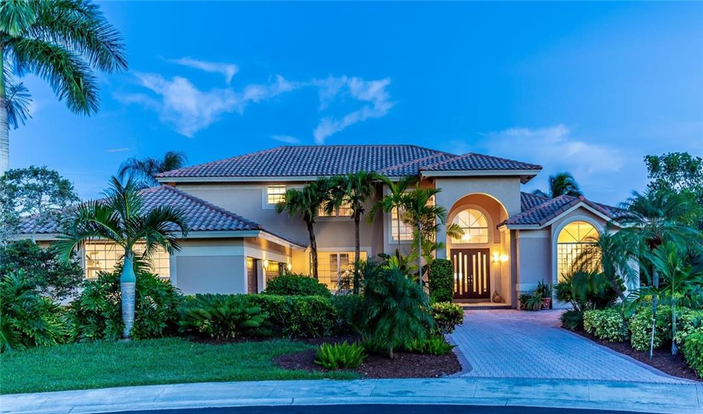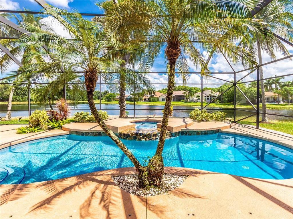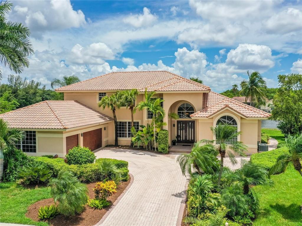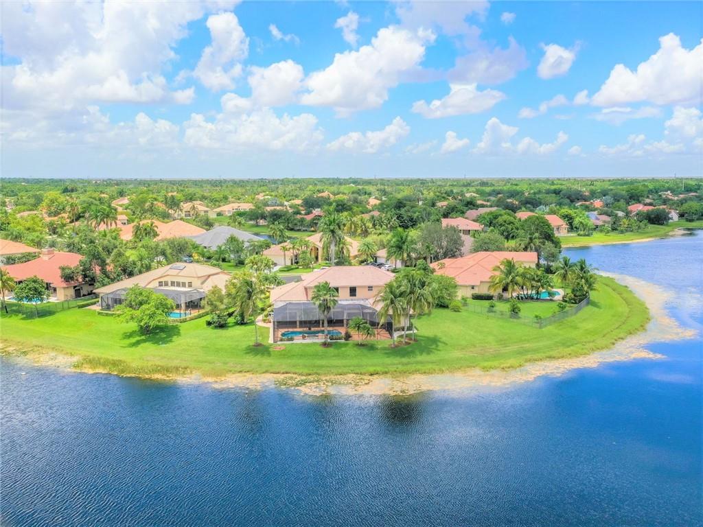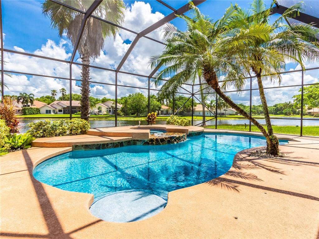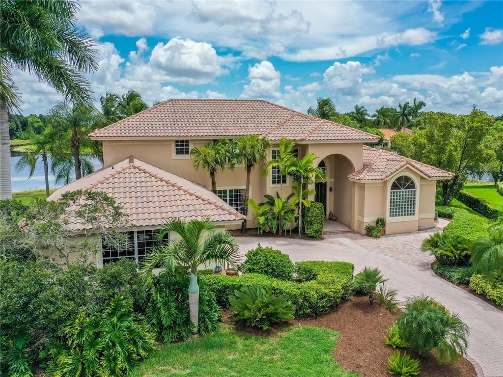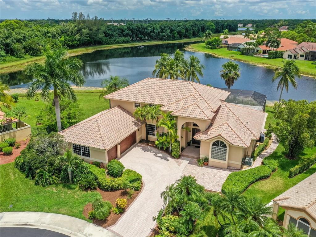 AMAZING HUGE pie-shape culdesac LAKEFRONT lot, OVER half acre, wrap-around WATER views & tons of LAND in upscale boutique Palm Island! Professionally staged, beautifully maintained 5/5/3CG w/salt-chlorinated heated pool/raised spa & long covered patio, screened for year-round comfort! Downstairs spacious Master Suite, Inlaw/Guest Suite + Full Cabana Bath, all with updated bathrooms! Upstairs, 3/2 Kids wing. Stainless/Granite Kitchen w/center island, trendy lighting. Freshly painted interior, new garage epoxy floors, 5-Ton AC compressor 2018. New fans, rose-wood floors in master & living area, new irrigation piping, pool pump, landscape. 3ACs, 2 Hot Water Heaters (one hybrid), custom closets & more! Tot lot, A+ Schools! (Price reflects no shutters, upstairs has original bathrooms & carpet).