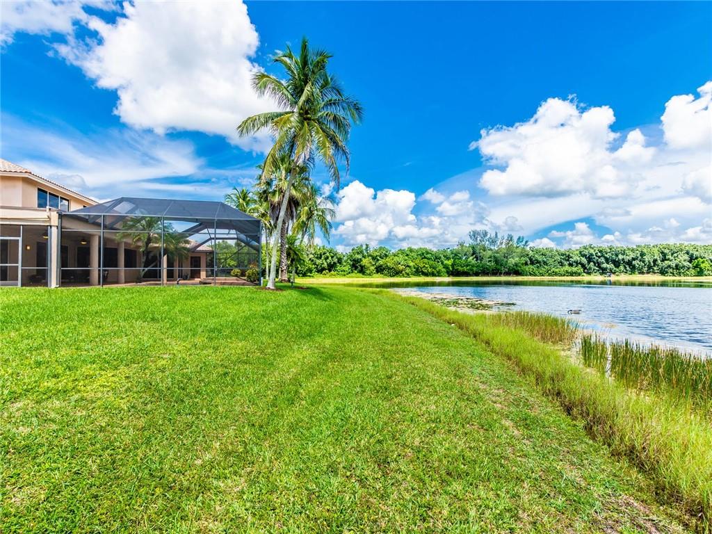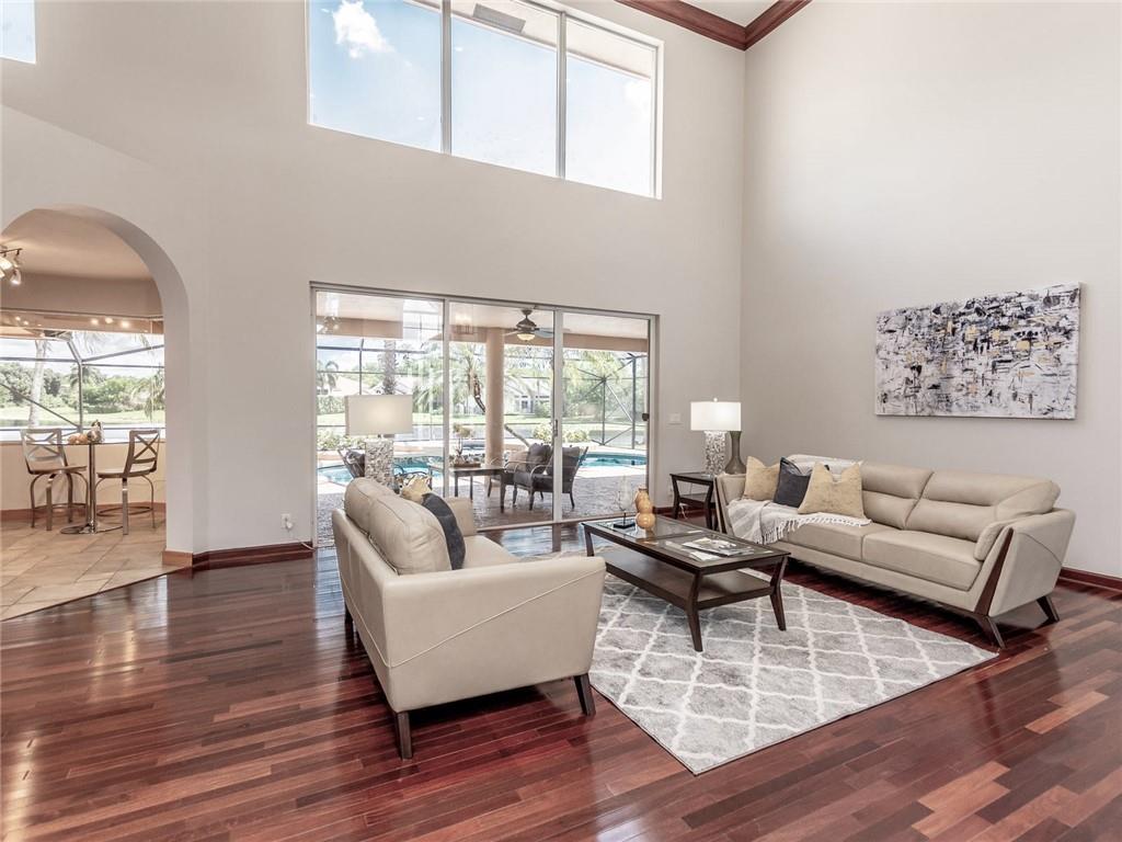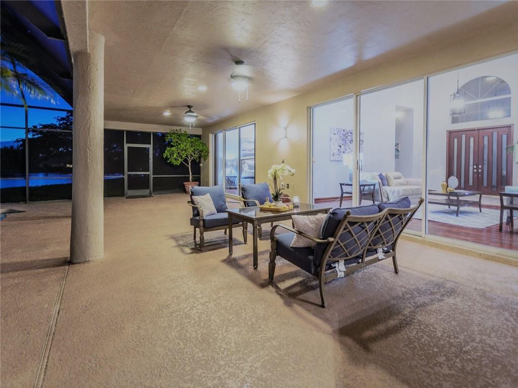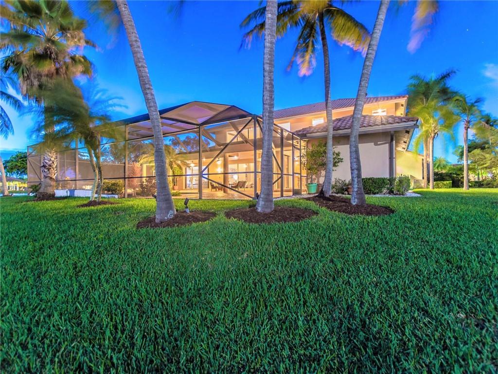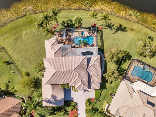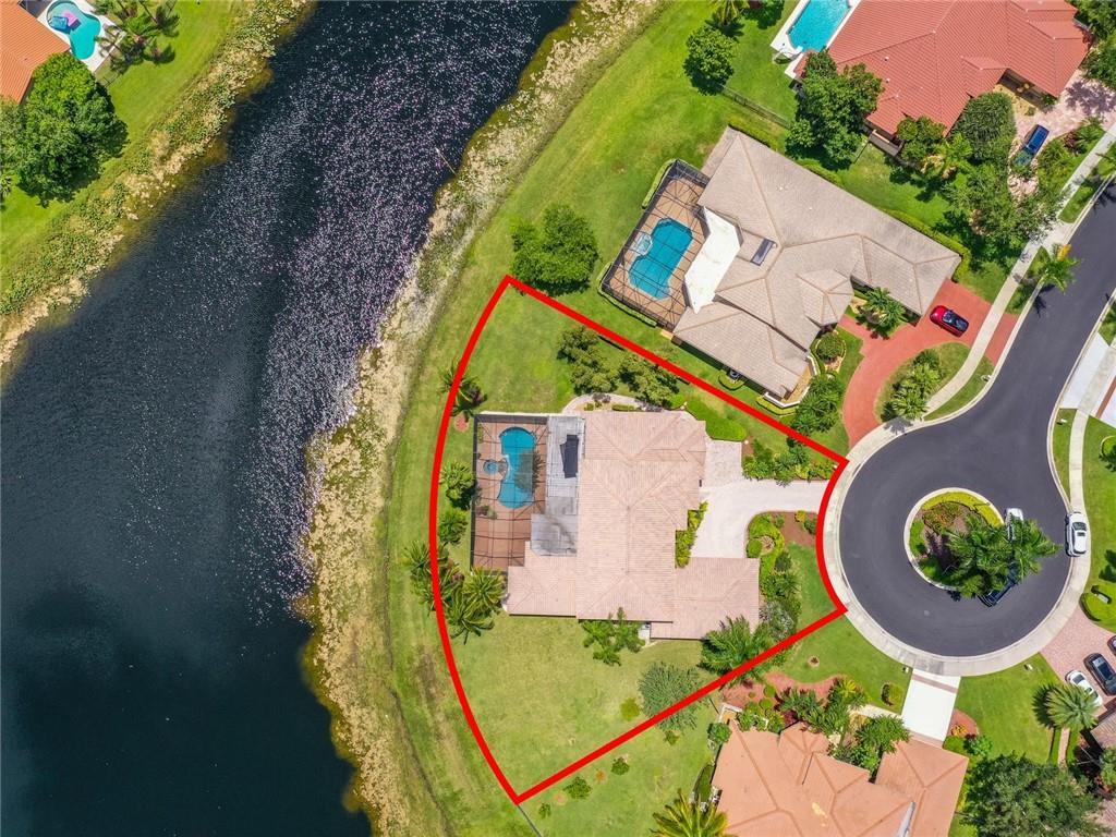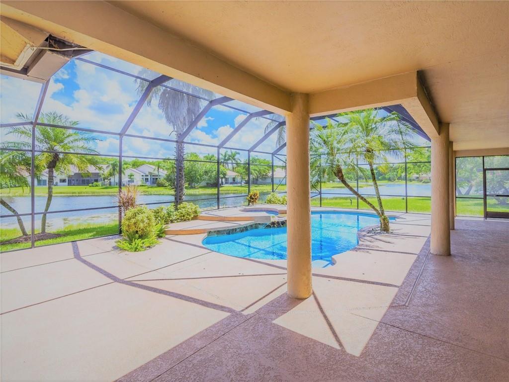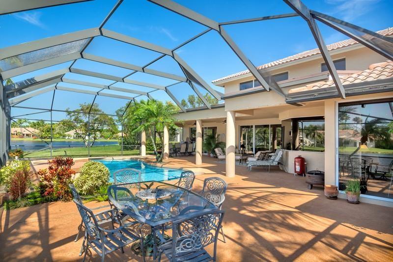AMAZING HUGE pie-shape culdesac LAKEFRONT lot, OVER half acre, wrap-around WATER views & tons of LAND in upscale boutique Palm Island! Professionally staged, beautifully maintained 5/5/3CG w/salt-chlorinated heated pool/raised spa & long covered patio, screened for year-round comfort! Downstairs spacious Master Suite, Inlaw/Guest Suite + Full Cabana Bath, all with updated bathrooms! Upstairs, 3/2 Kids wing. Stainless/Granite Kitchen w/center island, trendy lighting. Freshly painted interior, new garage epoxy floors, 5-Ton AC compressor 2018. New fans, rose-wood floors in master & living area, new irrigation piping, pool pump, landscape. 3ACs, 2 Hot Water Heaters (one hybrid), custom closets & more! Tot lot, A+ Schools! (Price reflects no shutters, upstairs has original bathrooms & carpet).