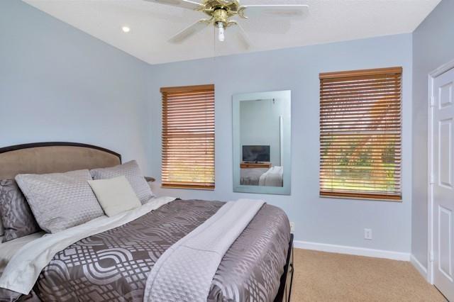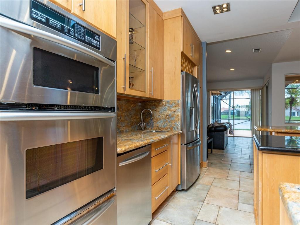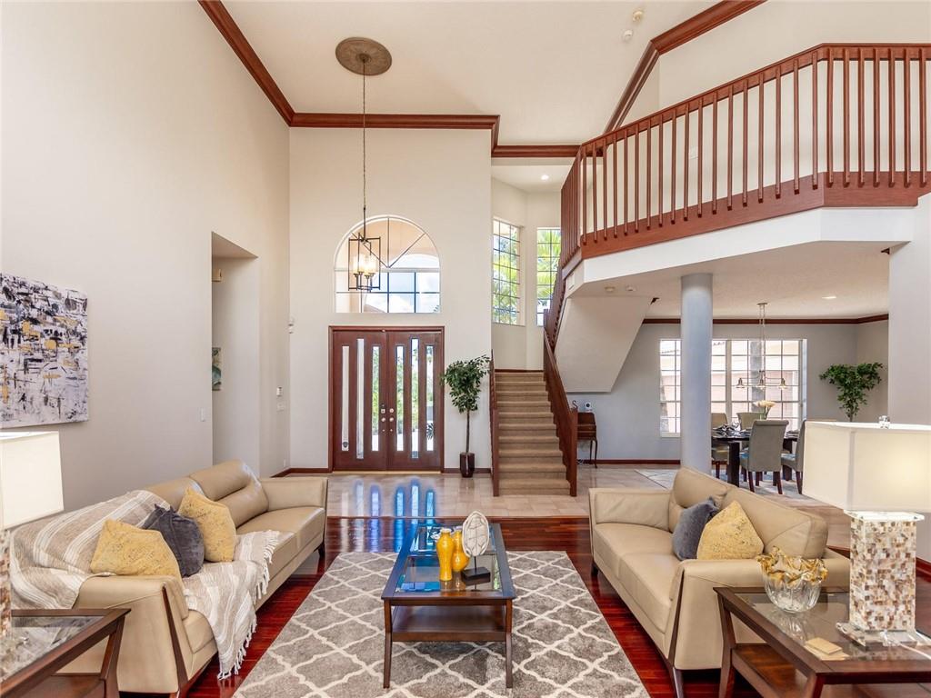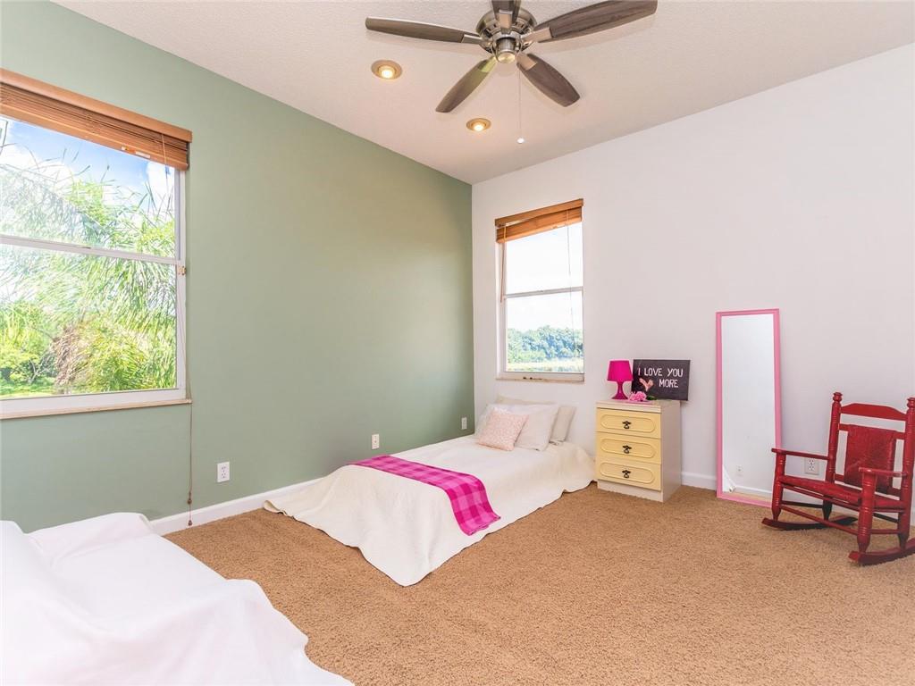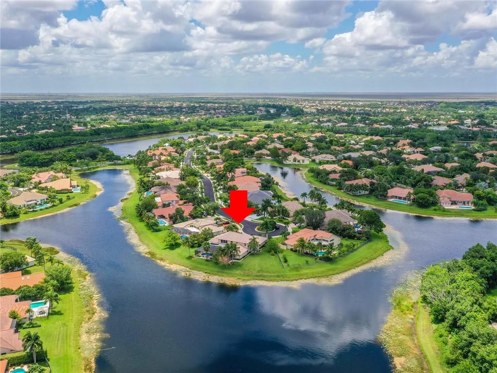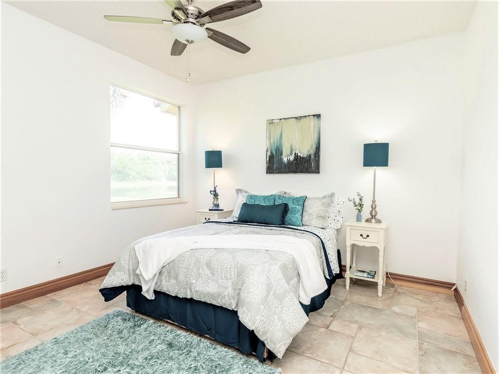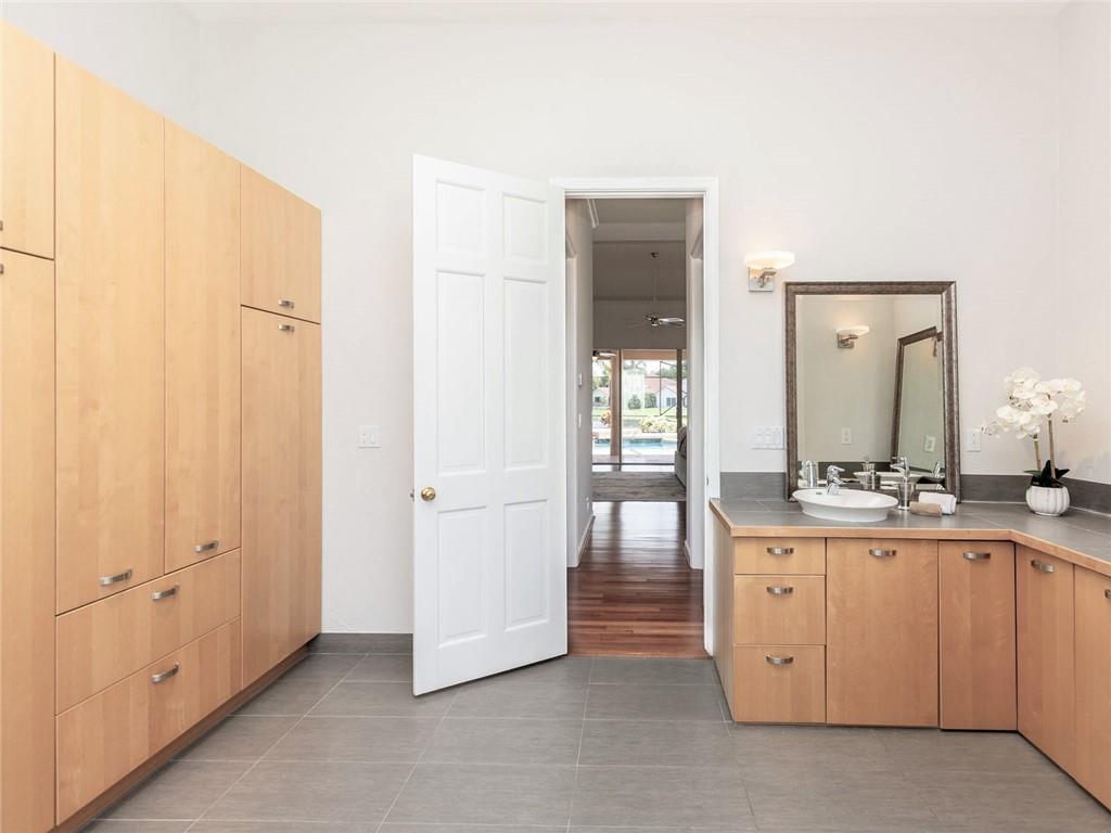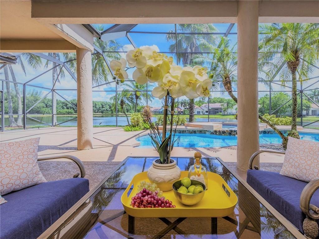 AMAZING HUGE pie-shape culdesac LAKEFRONT lot, OVER half acre, wrap-around WATER views & tons of LAND in upscale boutique Palm Island! Professionally staged, beautifully maintained 5/5/3CG w/salt-chlorinated heated pool/raised spa & long covered patio, screened for year-round comfort! Downstairs spacious Master Suite, Inlaw/Guest Suite + Full Cabana Bath, all with updated bathrooms! Upstairs, 3/2 Kids wing. Stainless/Granite Kitchen w/center island, trendy lighting. Freshly painted interior, new garage epoxy floors, 5-Ton AC compressor 2018. New fans, rose-wood floors in master & living area, new irrigation piping, pool pump, landscape. 3ACs, 2 Hot Water Heaters (one hybrid), custom closets & more! Tot lot, A+ Schools! (Price reflects no shutters, upstairs has original bathrooms & carpet).