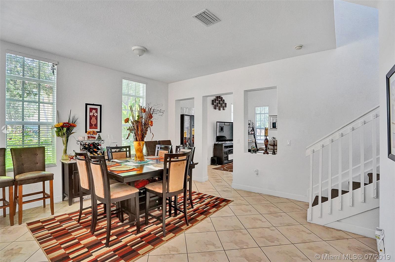 Come and see this amazing corner townhouse with high ceilings, 2 patios/high ceilings. Lots of natural light coming through the windows. Ceramic tile in diamond shape throughout the entire first floor. All living areas have over the 10-foot tall ceiling. Open concept kitchen updated with wood cabinets, granite countertop/backsplash plus professional SS appliances. The second floor has laminated flooring with a loft that could be used as an office/play area. The master bathroom is a great size with a walk-in closet overlooking the reserve. The master bathroom has dual vanities with granite countertops. The association includes cable, alarm, Fast internet, gate, rover, external maintenance, roof maintenance The community offers a clubhouse, Gym, pool, 24 hours security and child play area.