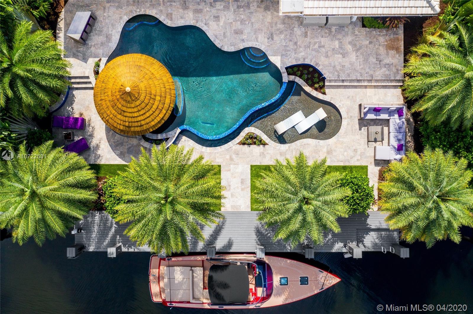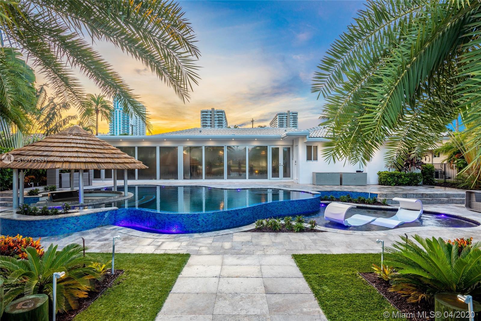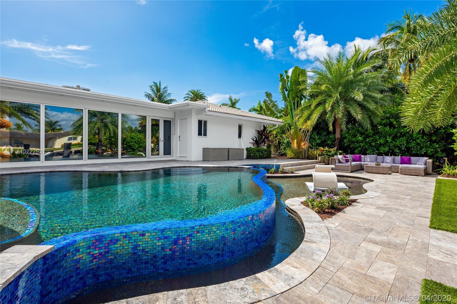Waterfront luxury masterpiece tucked away in the prestigious Golden Isles community. Fully renovated & turn key this stunning residence features 4 oversized bedrooms and 5 bathrooms, 4,000 Sq Ft of living space. A tranquil entry covered in bougainvillea welcomes you to a sleek modern vibrant place to call home. Open concept floor plan. White 32' porcelain tile throughout, custom doors, closets, LED lighting. Snaidero-Pininfarina Kitchen includes Subzero refrigerator & wine cooler, Quartz countertops, Wolf oven & range. 14' high ceilings, impact windows. Resort style backyard perfect for entertaining, custom designed infinity edge salt water pool w/ built in swim up tiki hut including summer kitchen & bar overlooking 85' of water frontage.Easy access to intracoastal,a plus for avid boaters!