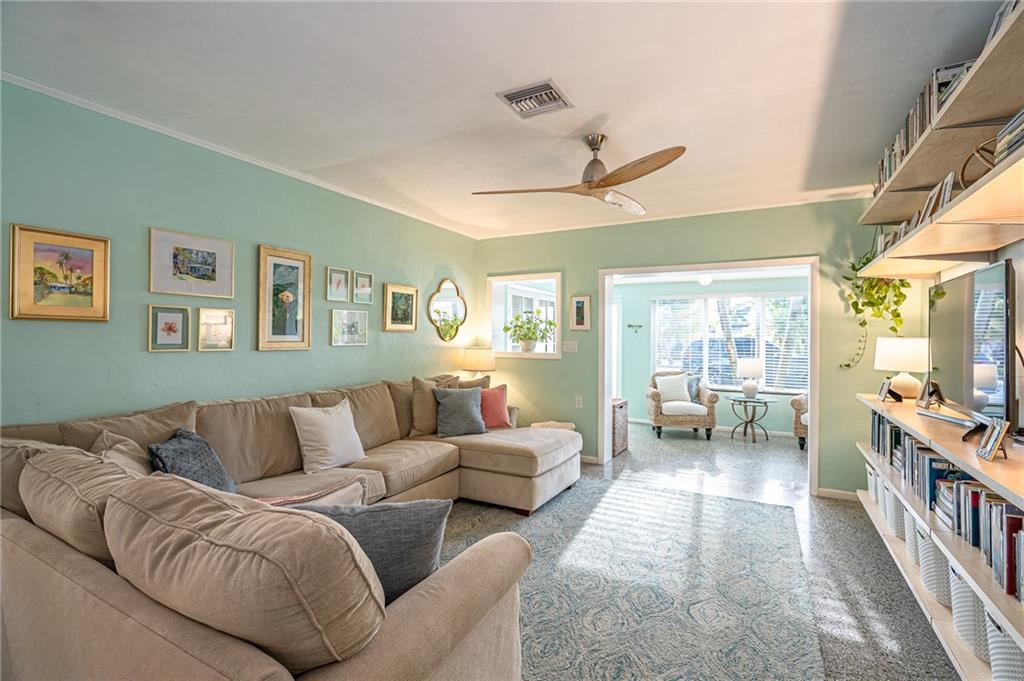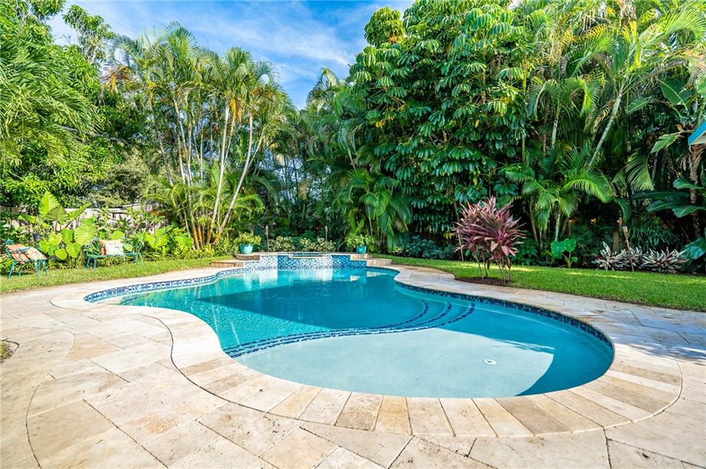 Old Florida Charm meets beach coastal home! Gleaming Terrazzo floors greet you as you enter this Poinsettia Heights beauty. This home has a 3 bedroom, 2 bath split-bedroom, open floor plan. The new spacious kitchen has a chopping block island, plus breakfast bar, quartz counter tops, & S.S. appliances. The interior laundry room has additional storage. Step outside to the large backyard boasting a newer saltwater pool w/ spa, plus separate outdoor shower. The covered patio w/ outside wet bar is fantastic for entertaining & w/ one click the Mosquito Nix system will keep the bugs away. The Hawaiian inspired landscaping also has fruit trees (lemon, guava, & passion fruit) which adds to the serenity of the luscious yard (sprinkler on well water). The home also has impact windows & a new roof!