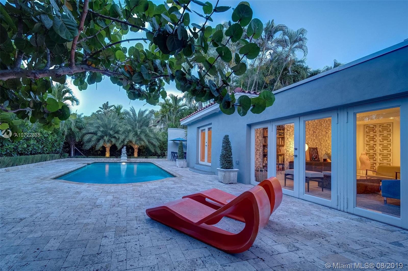 Located on one of Miami Shores Grandest Boulevards, this exquisite MiMo house offers expansive living spaces with tropical walled gardens & private pool area. Walk to Miami Shores Golf Course & easy access to all the amenities that Miami Shores offers. The foyer opens to sunny living room w/ 12’ high ceilings, then to a glamorous family room w/ French doors to the pool. The 4 bedrooms - 2 ensuite- are located at the 4 corners offering privacy. Conservatory-like office space with windows all around to enjoy the traditional 1940’s palm court. Large kitchen & open sunlit breakfast space overlooking garden. Two driveways – in front and in rear - plus 2-car garage. The pool areas unique architectural elements – Mission style arches – provide the feeling of being at an Italian Summer Villa.