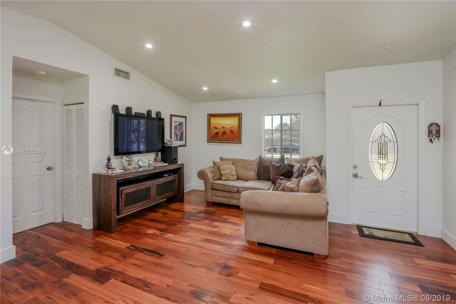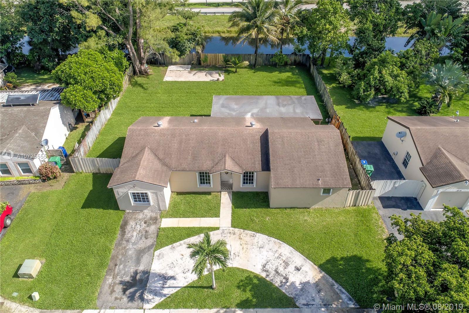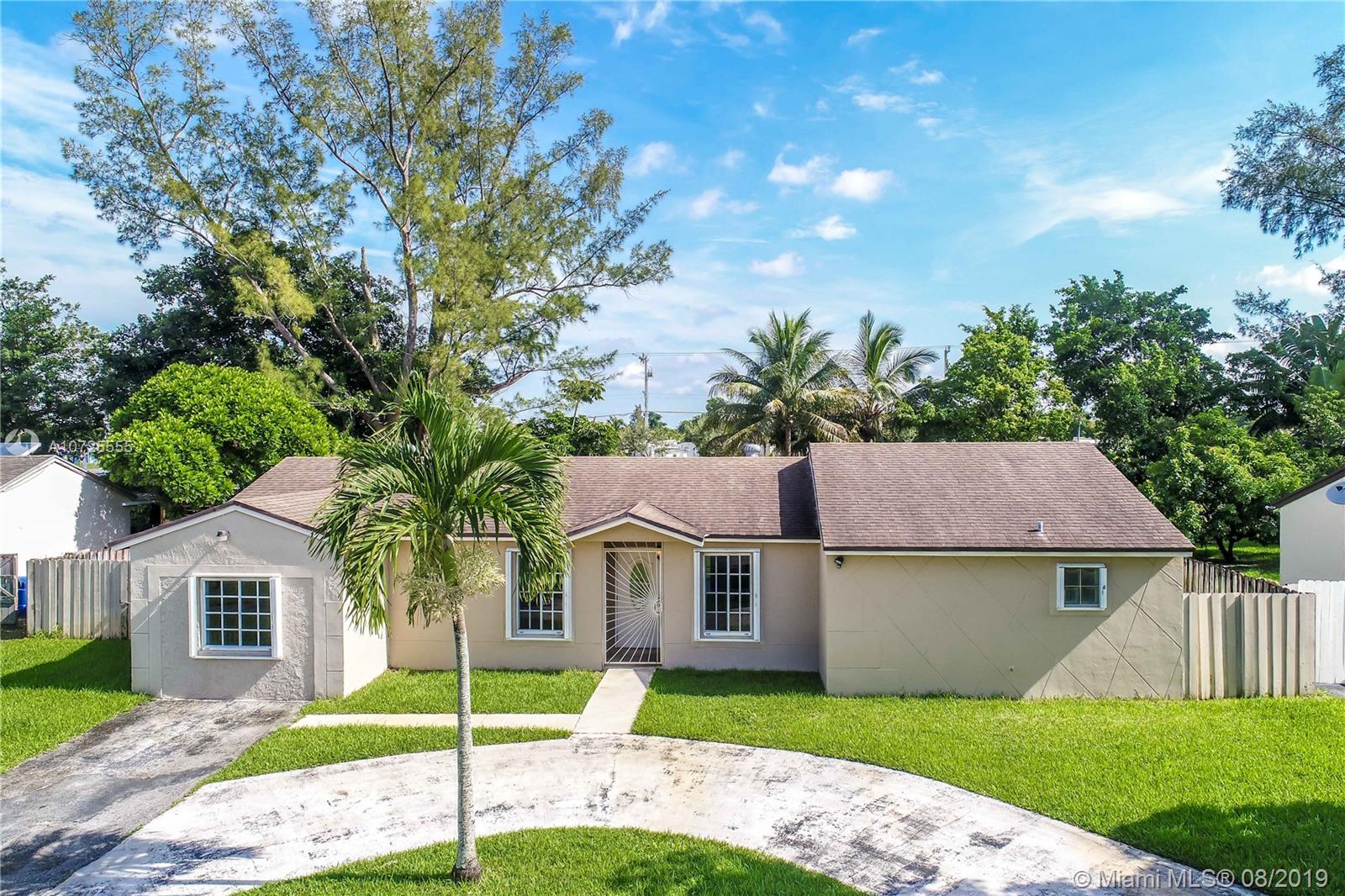 Move in ready-completely remodeled 4 beds & 2 baths home on quiet street, large lot of 10,000 SF. Master bdrm on a split plan. Recent updates include: engineered wood floors, soak tub inside shower enclosure with glass doors, newer AC, open kitchen with white laminate cabinetry and quart counter, ebony paneled cabinetry, wall ovens. Eat in counter and french doors to covered terrace. All surfaces in modern color palette of grays and whites. Lots of natural light from many windows, built out master walk in closet, appliances barely 5 years old, roof with long life to go. Quick access to Red Road & highways, midway between Miami Lakes and Miramar. Privacy fenced back yard-wrap around accordion shutters. Tumbled marble back terrace with wood beam lined ceiling, concrete slab for pergola.