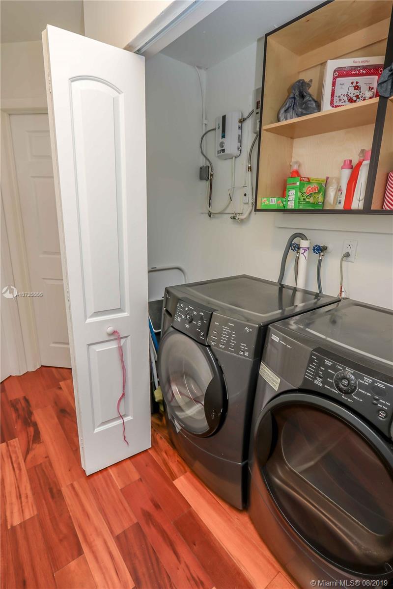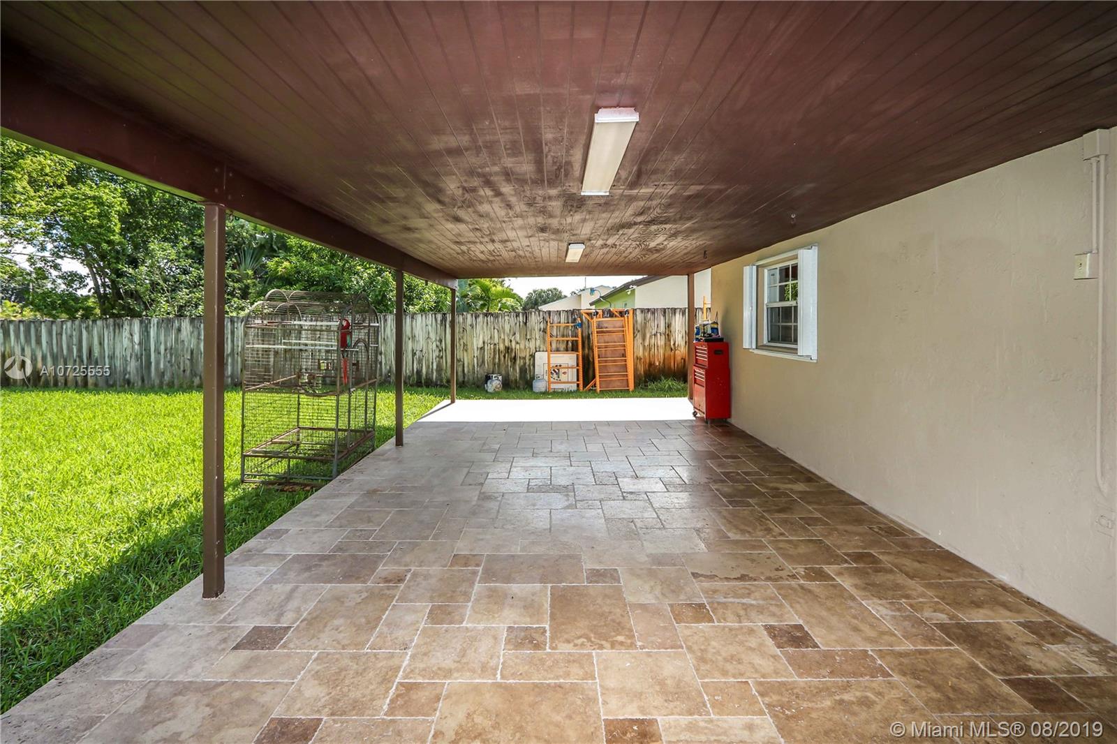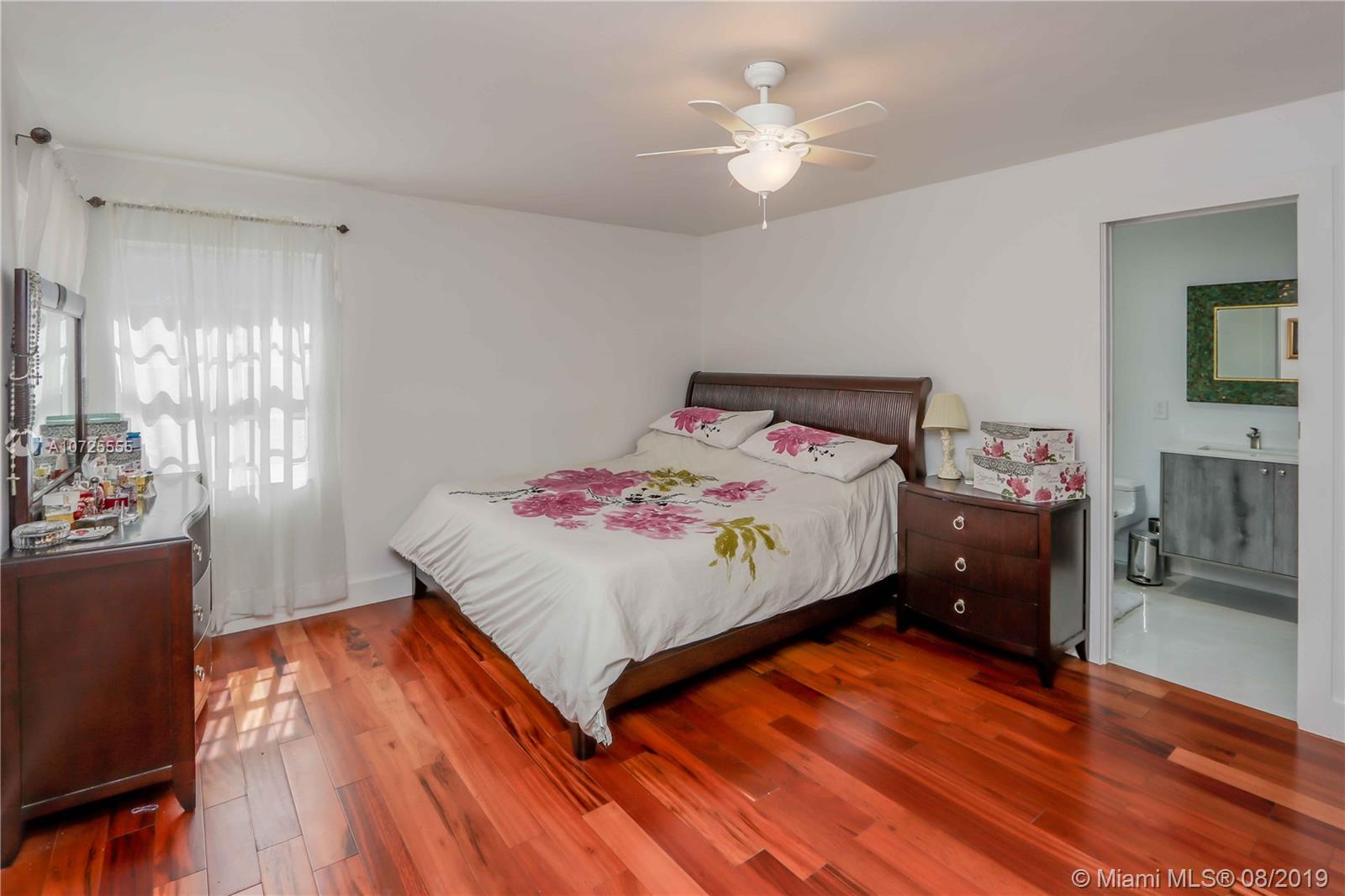Move in ready-completely remodeled 4 beds & 2 baths home on quiet street, large lot of 10,000 SF. Master bdrm on a split plan. Recent updates include: engineered wood floors, soak tub inside shower enclosure with glass doors, newer AC, open kitchen with white laminate cabinetry and quart counter, ebony paneled cabinetry, wall ovens. Eat in counter and french doors to covered terrace. All surfaces in modern color palette of grays and whites. Lots of natural light from many windows, built out master walk in closet, appliances barely 5 years old, roof with long life to go. Quick access to Red Road & highways, midway between Miami Lakes and Miramar. Privacy fenced back yard-wrap around accordion shutters. Tumbled marble back terrace with wood beam lined ceiling, concrete slab for pergola.