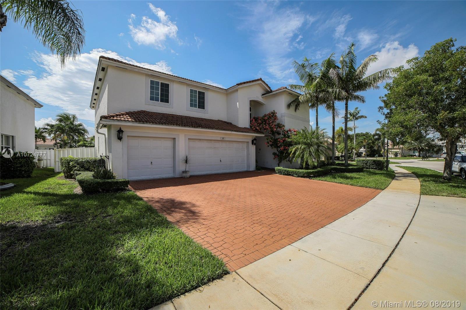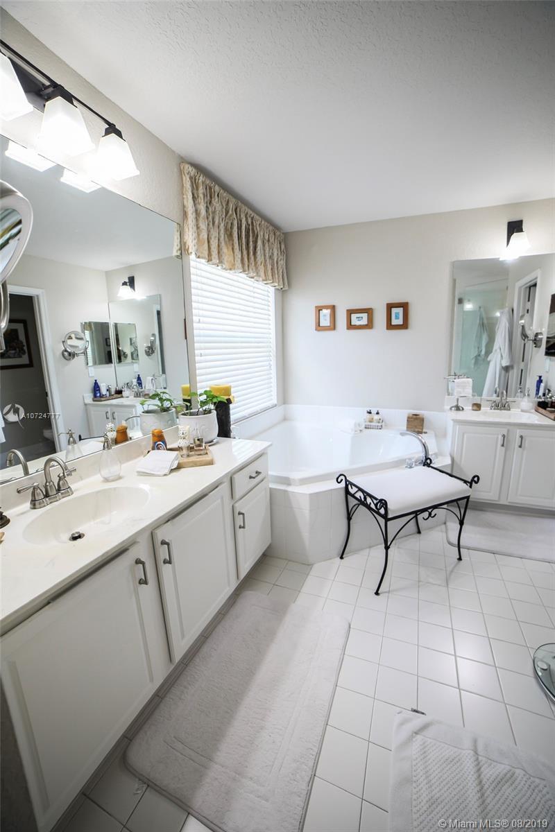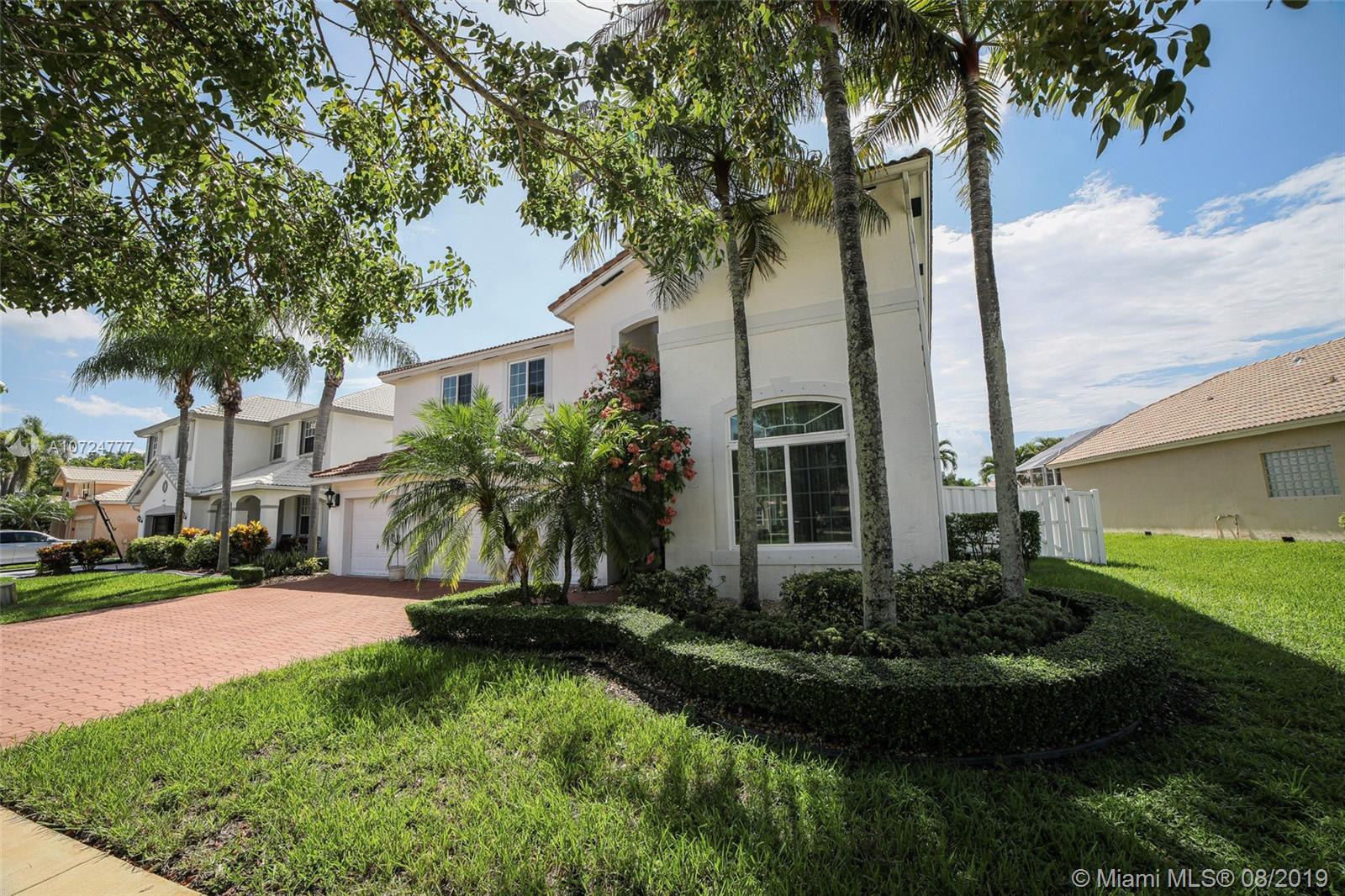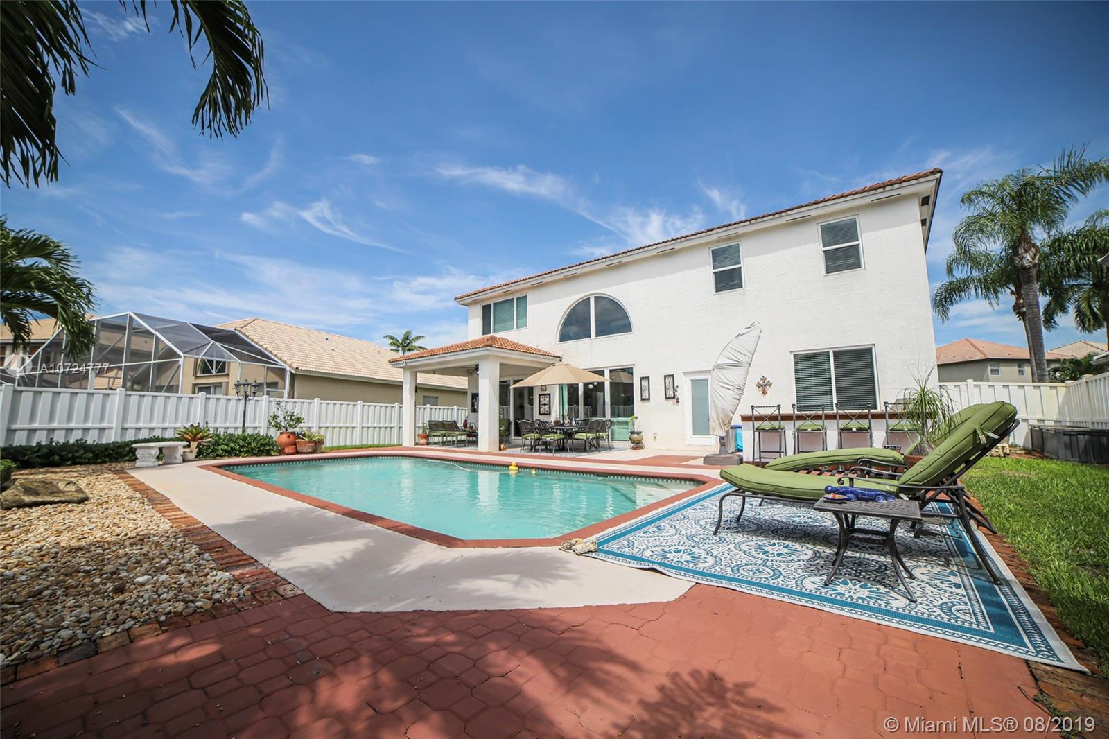 Gorgeous home in a desirable gated community Pembroke Shores, 4bedrooms, 3full baths, 3car garage. Bright, airy and open floor plan with natural lighting and great flow. High ceilings. Tastefully updated kitchen that features granite countertops, stainless steel appliances, and modern style wood cabinets. Ample tiled living areas with a great Living Room, and a formal Dining Room area. Wood Stairs to the second floor redone with an open design. Upstairs has laminated wood floors. Good size Master Bedroom with a just beautifully renovated Master Bathroom. Split bedroom design. Other bathrooms also renovated. New hurricane windows with thermal protection. Amazing backyard with white vinyl fence, pool, paved patio, large landscape, built-in outdoor grill, outdoor speaker. Move-in ready!!