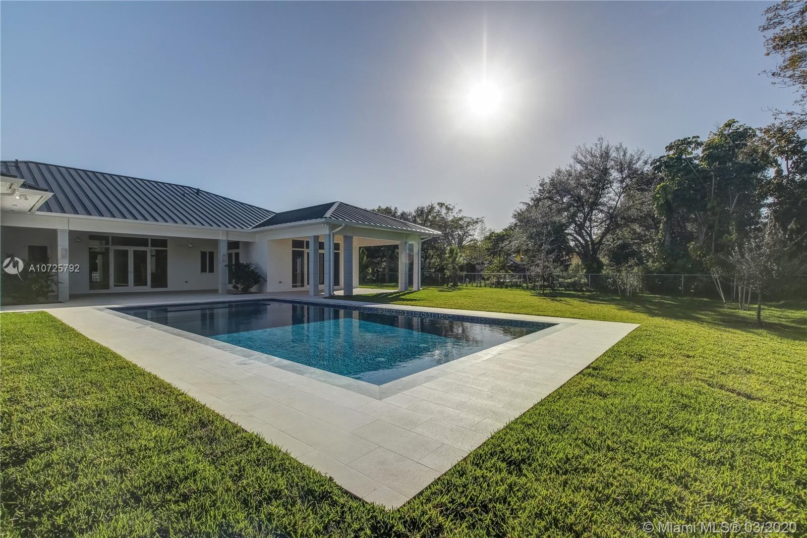 Modern and Sophisticated One Story New Construction Home In Prestigious Pinecrest. This estate is Meticulously designed with superior finishes including 12'+ ceilings through out the entire home, 5 bedrooms and 6.5 baths all bedrooms with en suite bathrooms from Porcelanosa. Italian and Spanish porcelain floors, LED recessed lighting through out, A luxurious kitchen with Quartz counter tops, kitchen cabinets from Veneta Cucine, Sub- zero and Wolfe appliances. Bar area with Sub zero wine cooler plus ice maker. Over sized social areas, 2 very large outdoor patios, enormous heated pool plus spa (20'X40') complete with LED lighting system. A Gated Corner Lot with 2 gated entrances and a side 3 car (finished) garage make this home spectacular. All pre-wired for your "smart-home" technology.