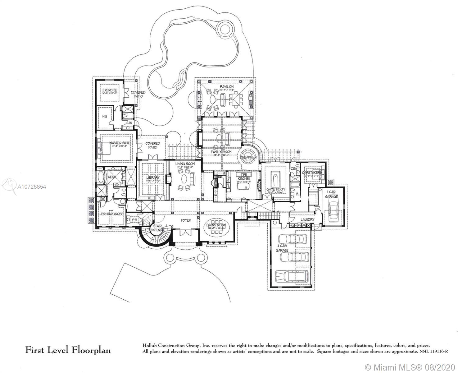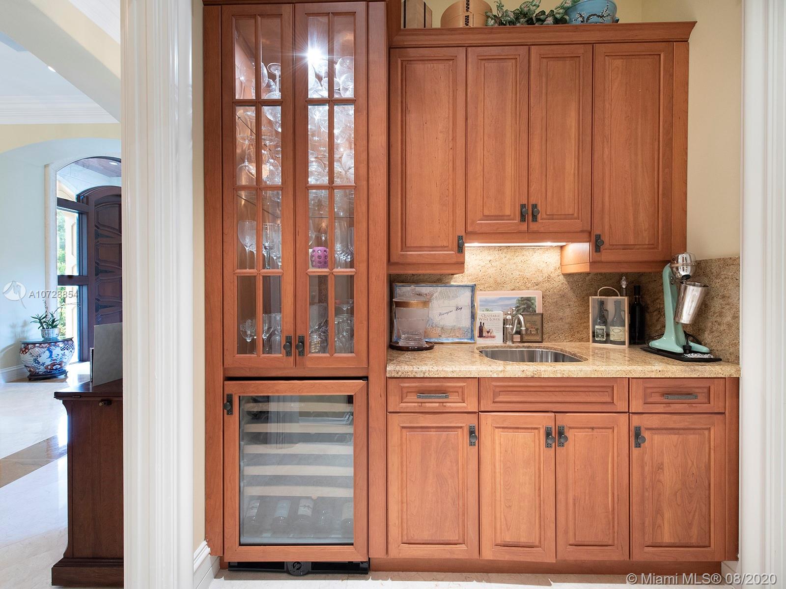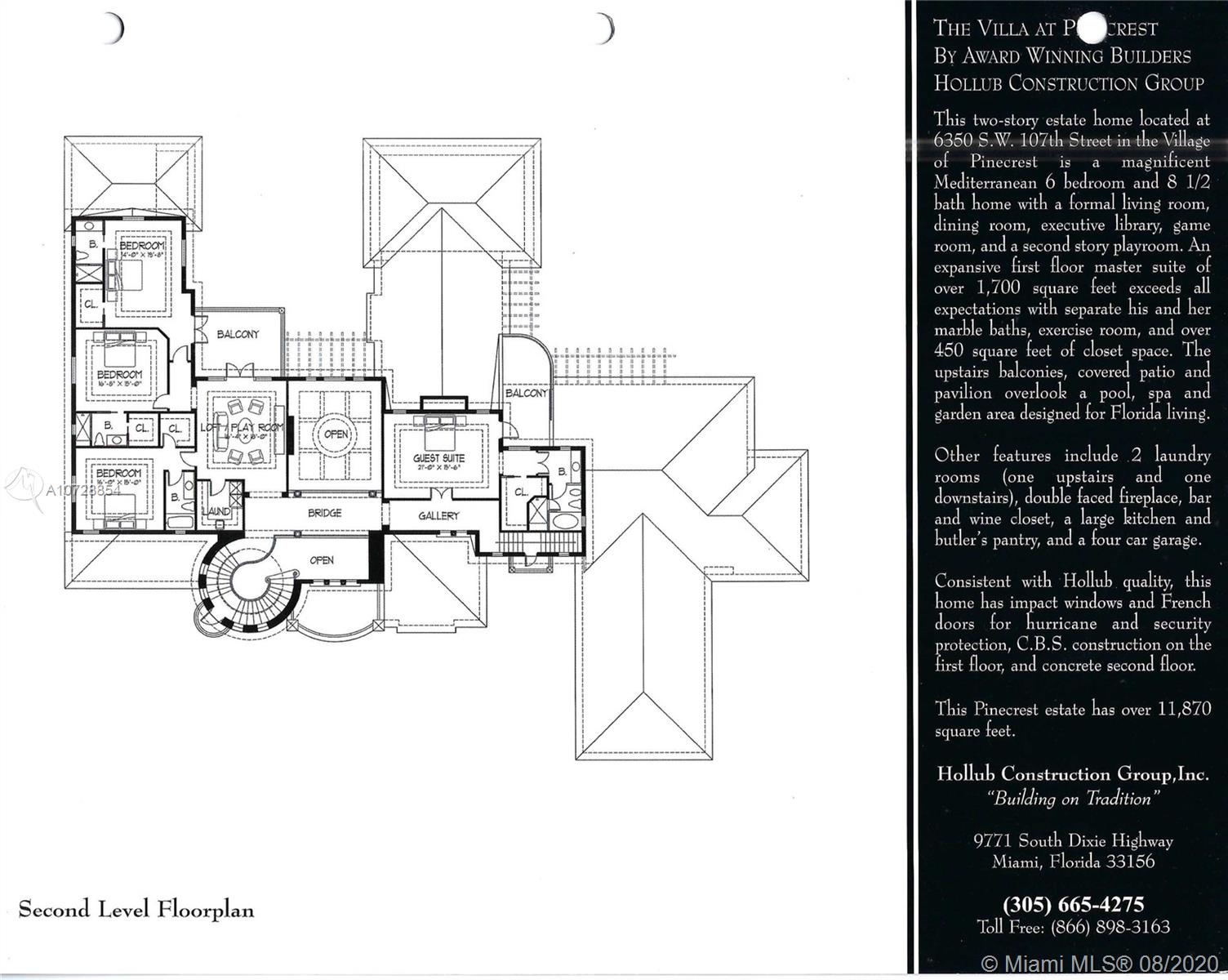 Extraordinary, pristine two story Italian villa in North Pinecrest, with legendary Hollub Homes design and construction. Unmatched living and entertaining spaces. Formal living and dining room, executive library with gorgeous built-ins and double-sided fireplace, billiard/game room, bar and wine cellar, stunning European kitchen with brick ceiling. The expansive master suite of over 1700 square feet is palatial, with separate marble baths and walk-in closets and an exercise room with exterior access to the resort-like pool and grounds. Ultimate flexibility with 5 additional en suite bedrooms. Other distinct features include a second floor loft with kitchen and additional laundry, custom exquisite finishes and design details throughout. Impact glass. A MUST SEE!