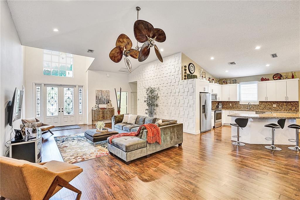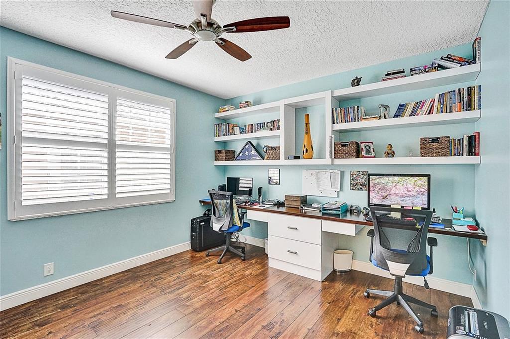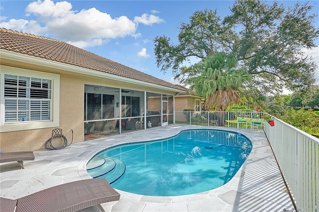 Located in sought after Highland Place in Eagle Trace. Home is absolutely beautiful! From the moment you walk in through the double stain glass doors the soaring ceilings and wood floors will take your breath away. It is bright and open with plenty of room for any size furniture.Plantation shutters through out this home. Three bedrooms and three bathrooms, master bath has been remodeled and looks modern, chic and clean. The third bedroom is converted to a office with built in cabinets but can easily be converted to a bedroom. Outside patio is screened and a huge room to entertain overlooking the pool and canal. Home is located very close to shopping with Publix just a short walk or drive in distance. Imagine yourself grilling and entertaining family and friends in a beautiful pool home .