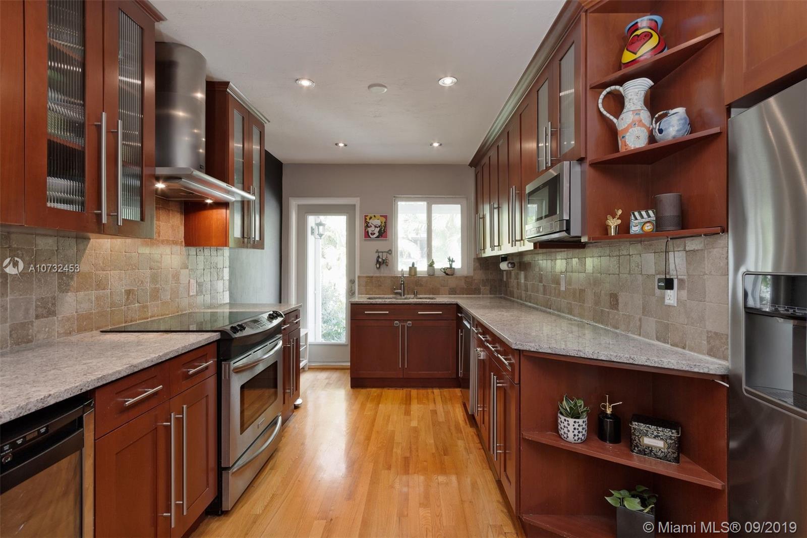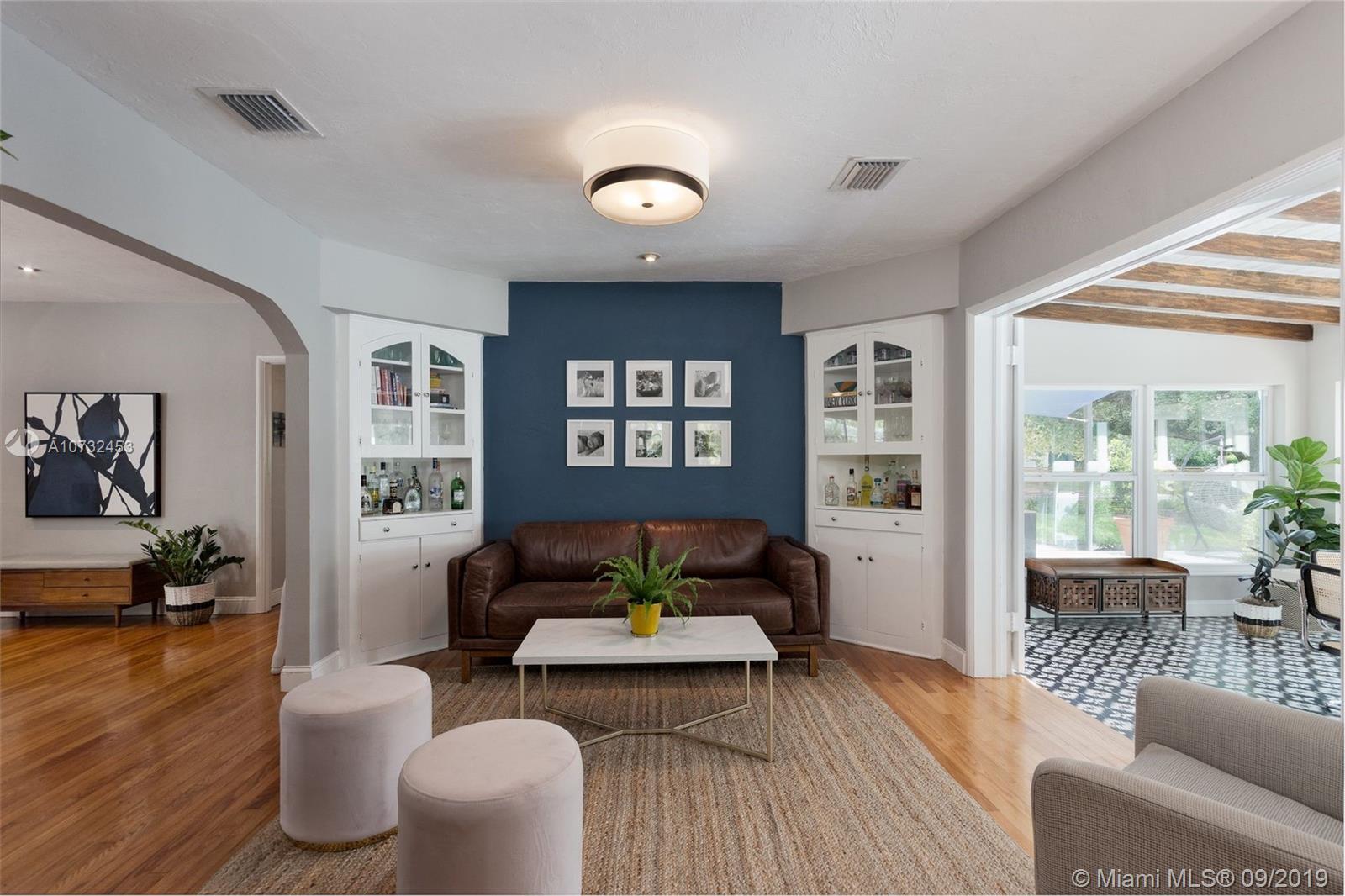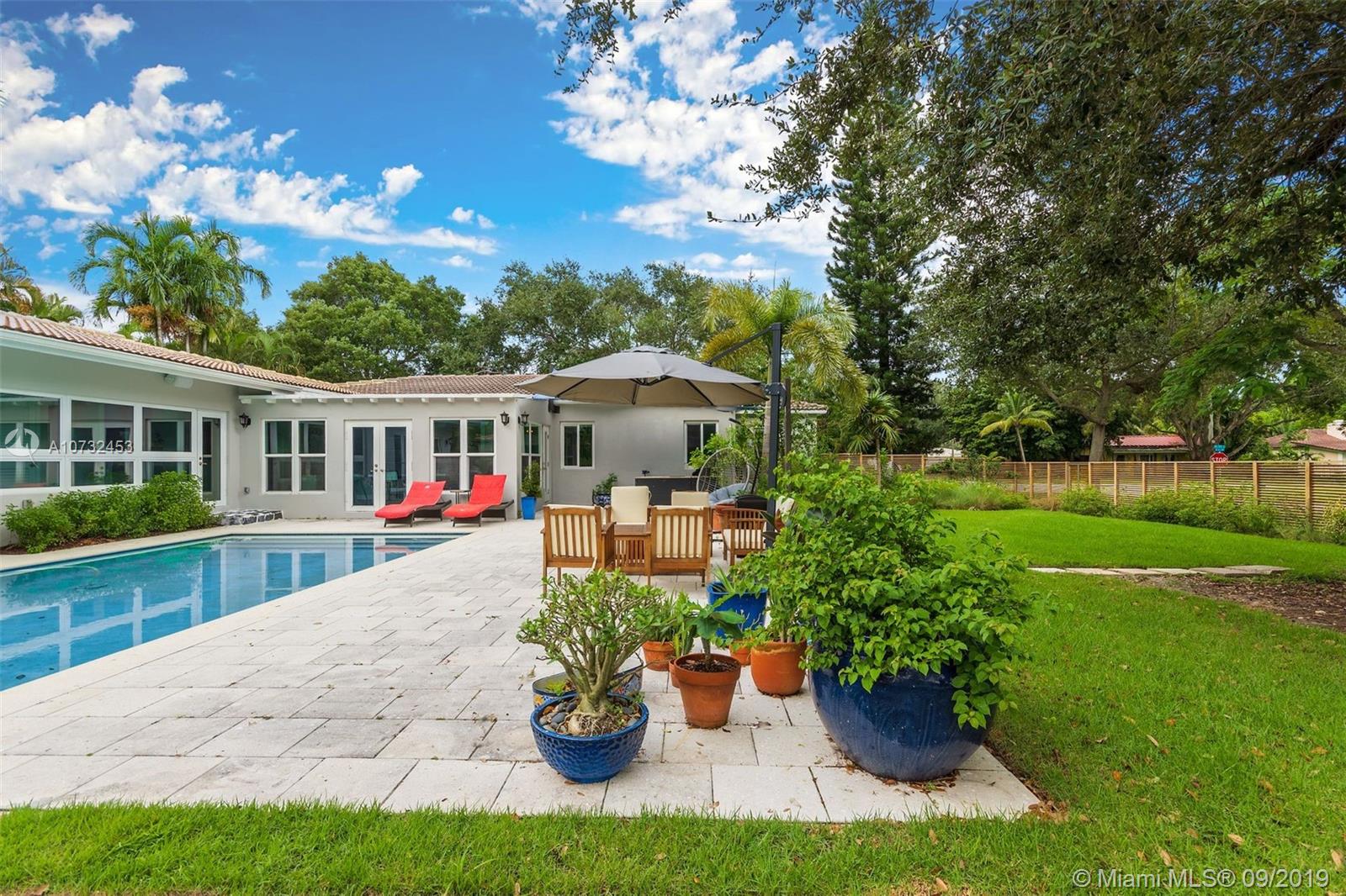 5 bedrooms and 4 full baths in this renovated Miami Shores home. Big corner lot, fenced yard with patio, outdoor kitchen and beautiful pool. Spacious living room ,dining room open to the kitchen and family room overlooking the pool and garden. The kitchen is updated with stainless steel and granite . Wood and tile floors, impact windows and doors, two zones of central a/c. Master bedroom overlooks the pool and garden, has big walk-in closet and new bathroom. Big inside laundry room and utility room, attached one car garage. Move in condition.