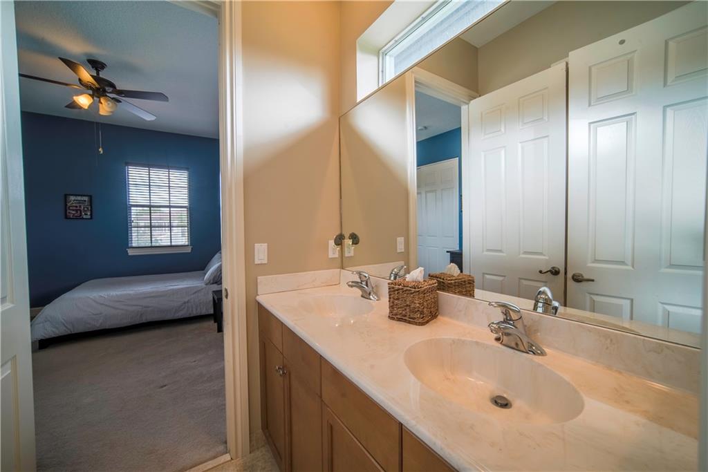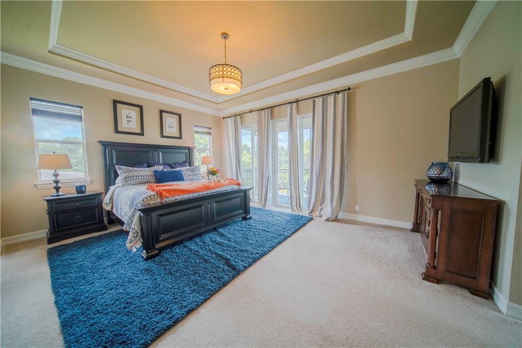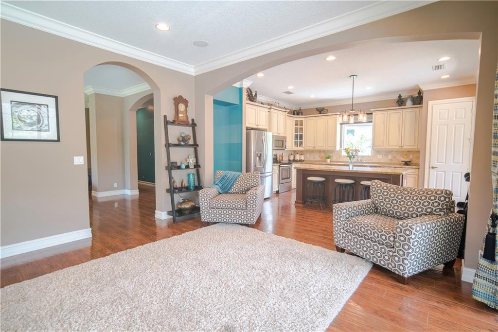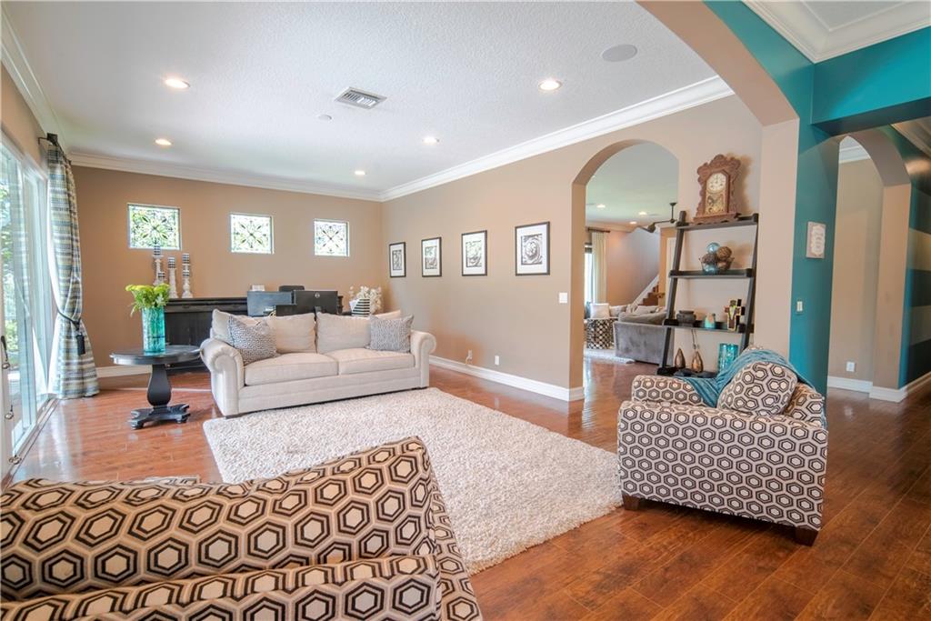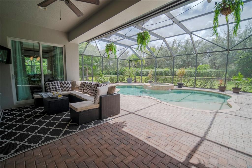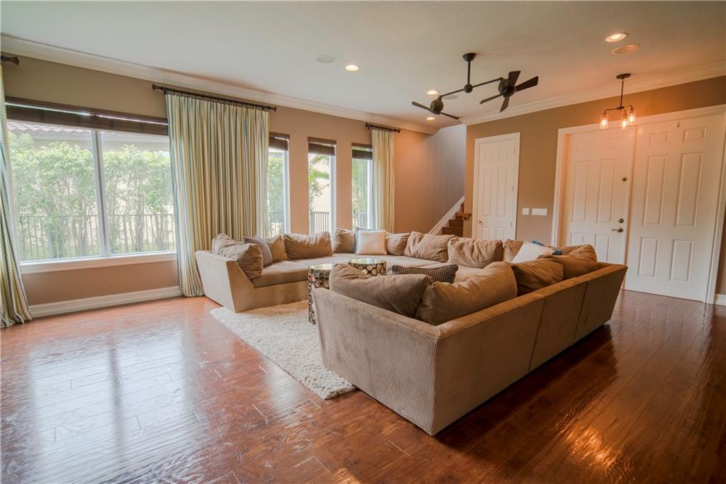 Contemporary & Turnkey Expanded St. John Model w/5 Beds + Loft, 4 Baths, Pool & Spa on a Large, Pie-Shaped Cul-de-Sac Lot. Freshly Painted Outside, Impact Windows/Doors, Hardwood Floors, Crown Molding & Upgraded Light Fixtures Throughout Living Areas. Upgraded Kitchen w/Granite Countertops, SS Appliances, Pantry, Off White Wood Cabinets & Contrasting Brown Center Island w/Barstool Seating. Open Family Room w/Sliding Glass Doors Opens Up Into Large Covered Patio Area & Screened-In Pool. Downstairs Has 1 Full Guest Bed & Bath. Upstairs Master Suite w/Tray Ceilings & Walk-In Closets Has A Screened-In Balcony Overlooking Pool & Backyard w/Upgraded Landscaping. Master Bath w/Glass Shower, Whirlpool Spa Tub, Dual Vanity Sinks. Enjoy Guard Gated Community, Resort Style Amenities, A-Schools!
