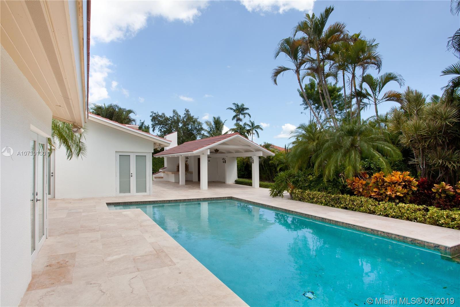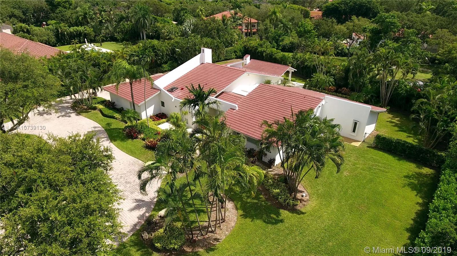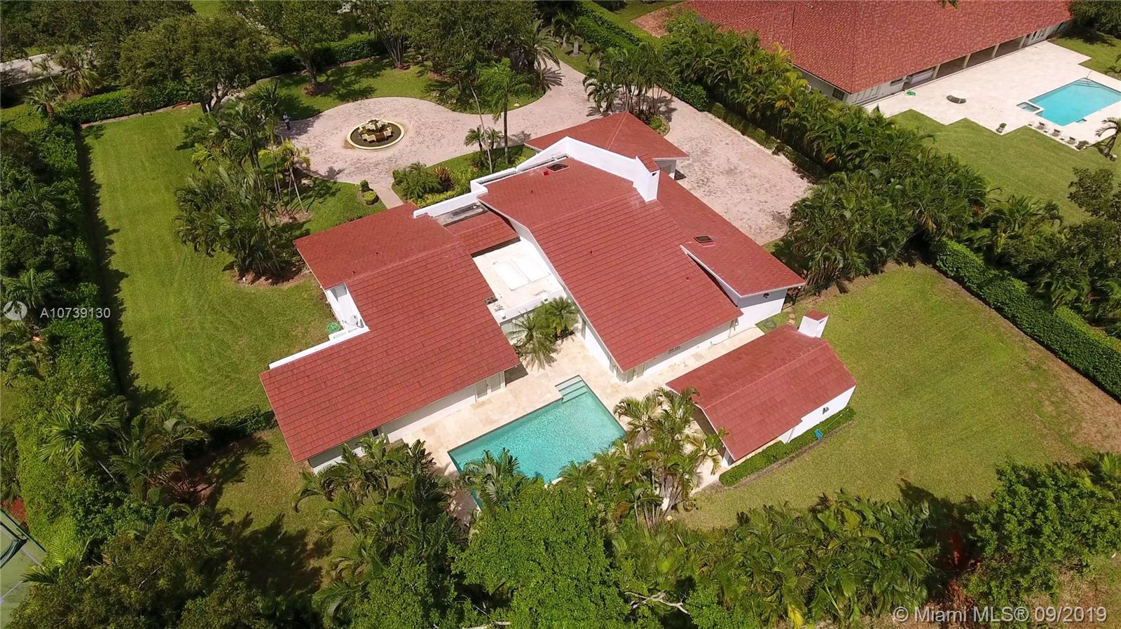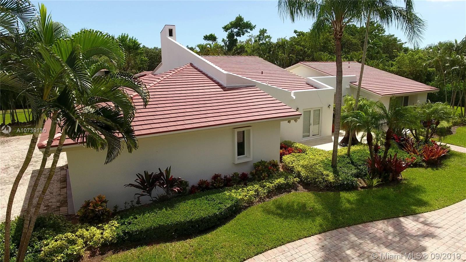 Updated one story home with great split floor plan in sought-after neighborhood. Brand new roof and gutters, impact doors and windows throughout. Gated for privacy, this home sits on a 39,493 sq ft lot with huge driveway and beautiful green areas surrounding the house. The foyer, overlooking the pool and patio, opens to the formal living room, dining room and family room. The gourmet eat-in kitchen has Viking appliances and granite counter tops. Adjacent to the kitchen are the maid's quarters and laundry room. The spacious master suite has a beautiful view of the pool and patio and features a great bathroom and walk-in closet. There are other 3 bedrooms, 2 full bathrooms and a powder room. The pool and patio area feature a gazebo and huge green areas. Also for rent at $12,900.
