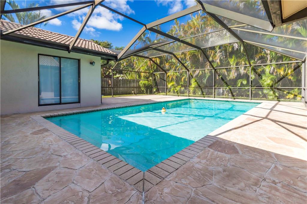 Great single-family home in Cypress Glen. Property features 4 bedrooms 2 baths oversized pool & enclosed screened area. As you enter you have a large formal living room with high ceilings and a wet bar great for entertainment. Unique floor plan flows around the pool area giving you lots of natural light from multiple sliding doors surrounding the family room, kitchen, living room & master bedroom all with views of the pool. Separating the other 3 bedrooms towards the front of the home with their private bathroom & deep closets. Open eat-in-kitchen leads into the family room with newer wood floors & high ceilings. Dining room is setup to be used as a convertible room, Den or office. S-tile Roof. Laundry room. Hurricane garage door & Fence area for pets.