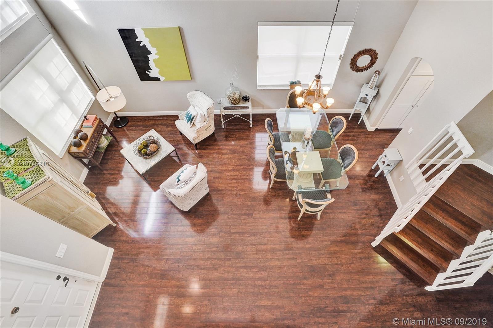 Unique & spacious floor-plan featuring high ceilings, bright interior & all laminate wood floors downstairs. Updated kitchen with high-quality cabinetry, pull-out shelves, stainless appliances & stone counters with seating for 5. Custom work space adjacent to kitchen & family room, downstairs bedroom & fully updated bath. 2nd floor boasts a large & open den/office space . Updated master bath, 3rd & 4th Bedrooms share a Jack & Jill bath. Relax in your private & fenced back yard oasis with solar heated pool and greenery, how about your own Mango tree? Storm protection throughout. Enjoy a care-free lifestyle with lawn care, sprinkler system, HD cable service, internet and ADT alarm monitoring service included. Emerald Estates is guard gated & ideally located, next to parks, shopping & schools