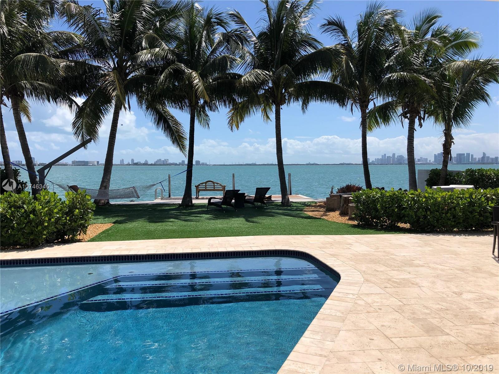 BEST PRICED UPDATED WATERFRONT HOME! Tropical paradise on the open bay with unobstructed views of the Miami skyline and South Beach. This beautiful property offers 60-ft of bayfront, oversized heated pool with beach, and a huge backyard with fire pit! Situated on a 9,000 sqft lot, this stunning 4-bed plus den / 3 bath home has been renovated in 2012 and is move-in ready. The open concept floor plan and wall-to-wall glass allow for the maximum exposure of magnificent water views. Some of the features include marble and wood floors, high-end kitchen appliances, spa shower with steam, giant master suite with sitting area/den, hurricane impact windows and doors, new seawall and boat dock, and one car garage. Amazing location just minutes from South Beach, Bal Harbor, and downtown.