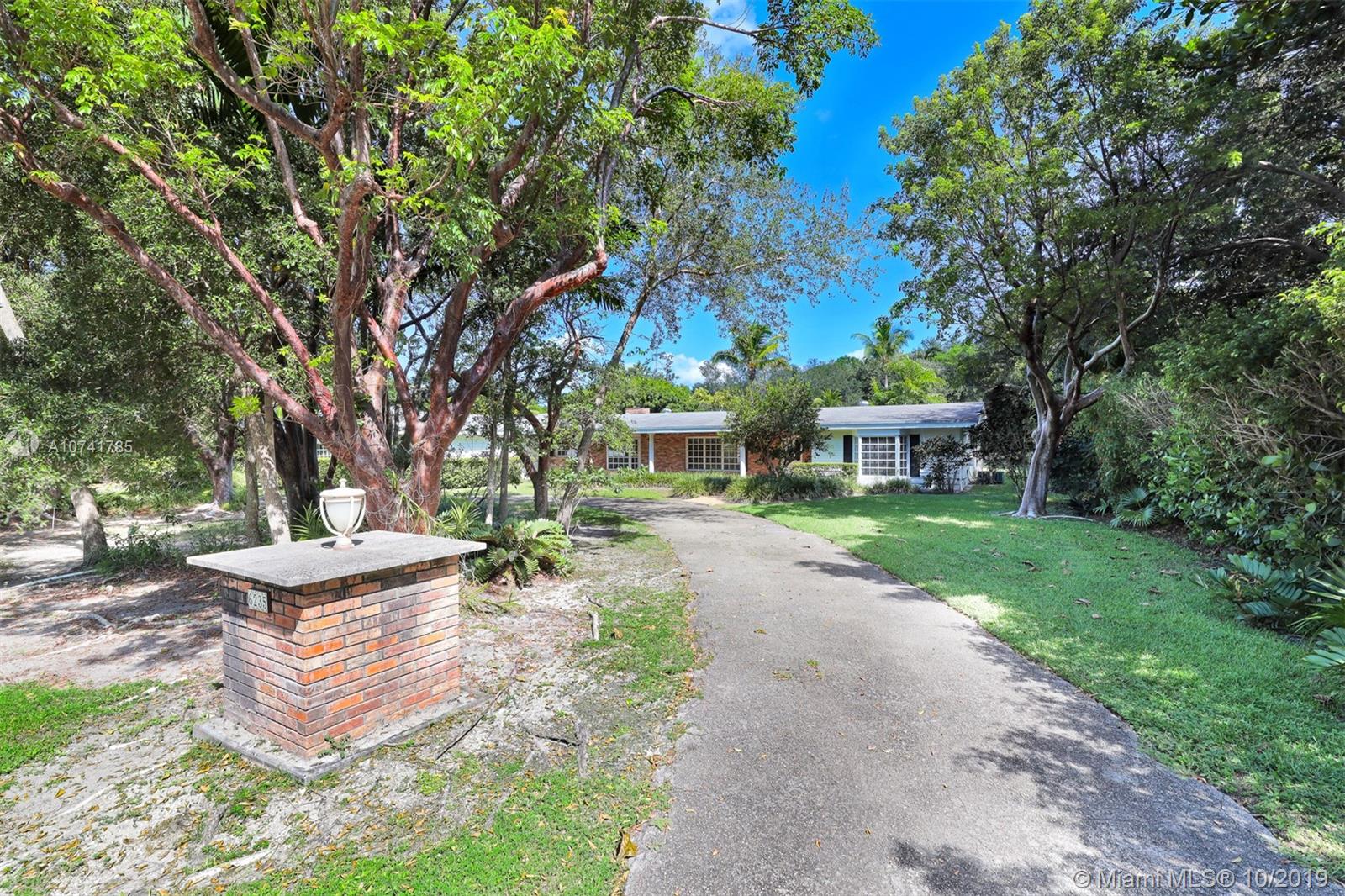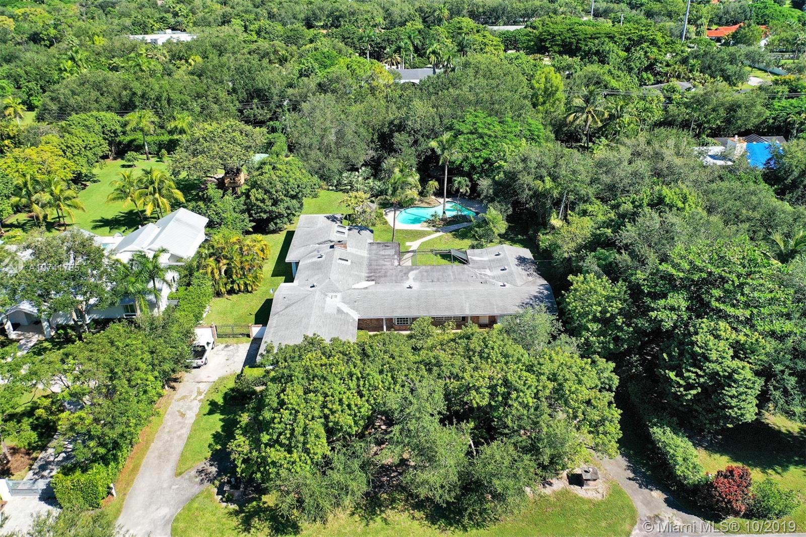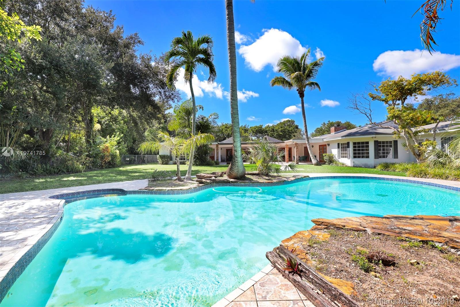 On a lovely FULL ACRE this 5Bed/3.5Baths home is located in the heart of Pinecrest. This is an opportunity to either renovate or build a new home. Existing home has over 4,000 sq ft of living space, plus a 2 car garage and an oversized pool! The lush and private backyard has palmetto islands, mature live oaks, mango & avocado trees. Bright and flowing floor plan with lots of natural light. Living rm, formal dining rm, kitchen and breakfast room, large laundry/utility room, large family room with wood burning fireplace and romantic master suite overlooking pool/garden with oversize walk-in closet and luxurious master bath. Bonus room adjacent to master suite. The 3-way split bedroom plan ensures privacy and quiet for everyone. SOLD AS IS. PLEASE USE SHOW ASSIST 24 HOUR NOTICE