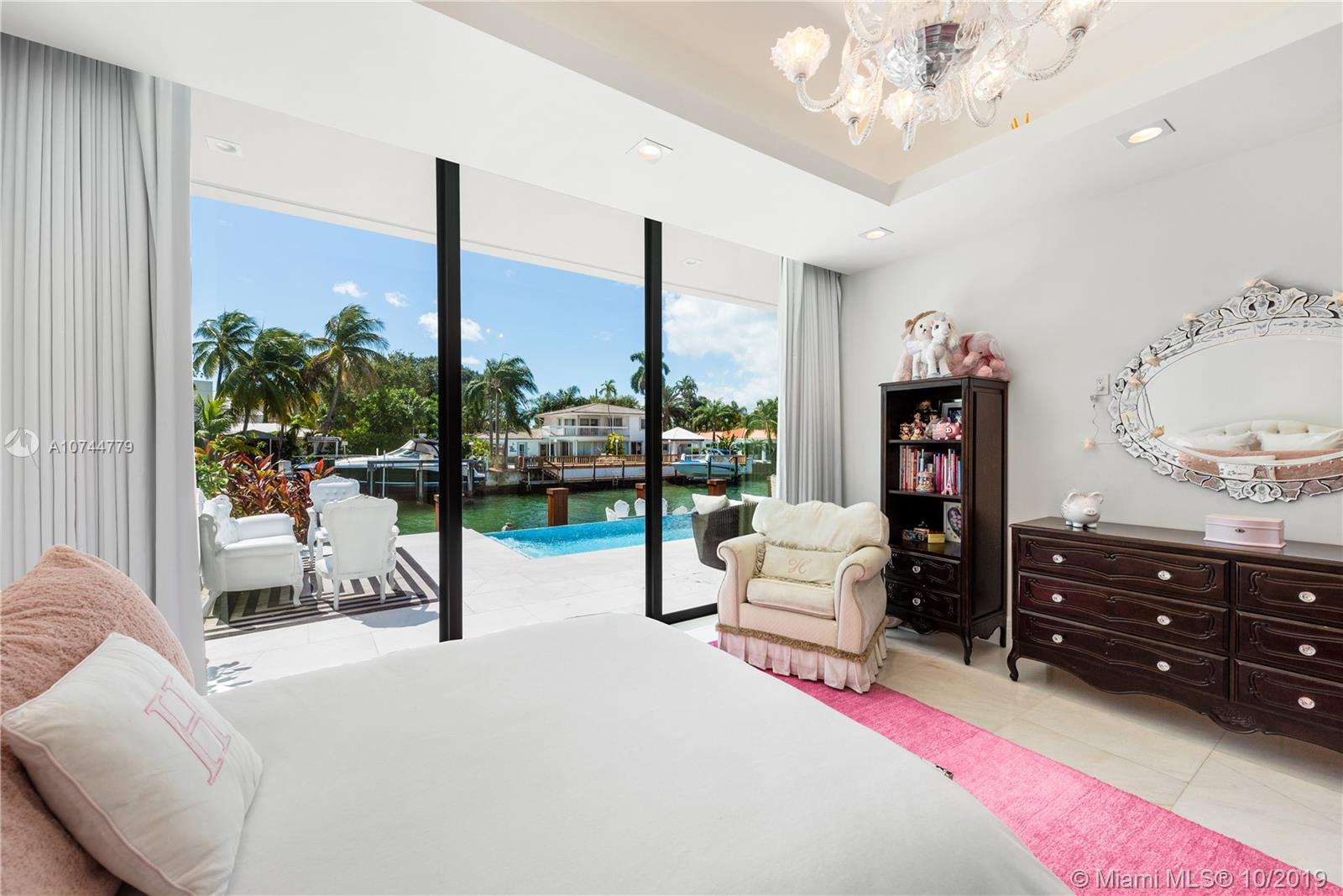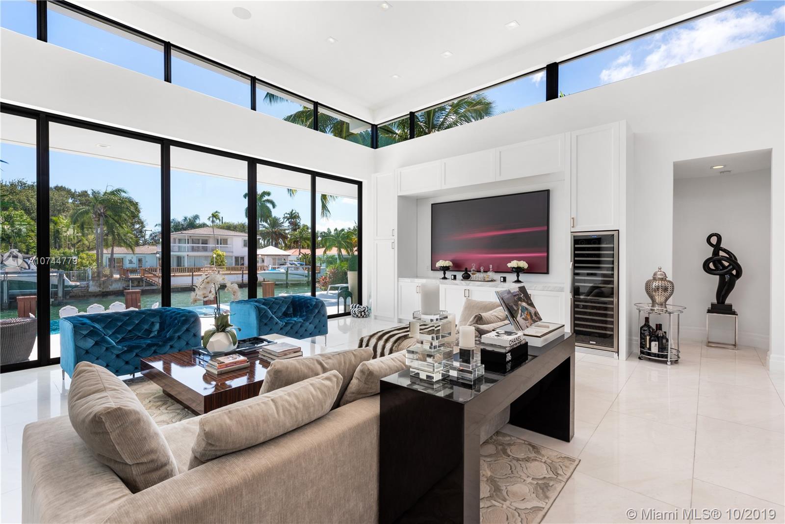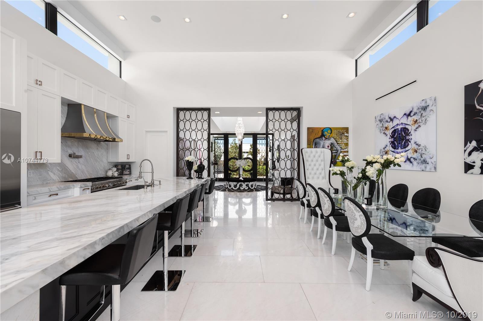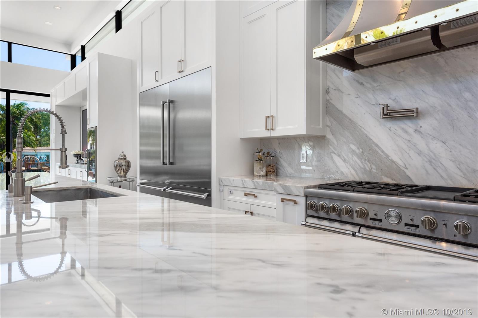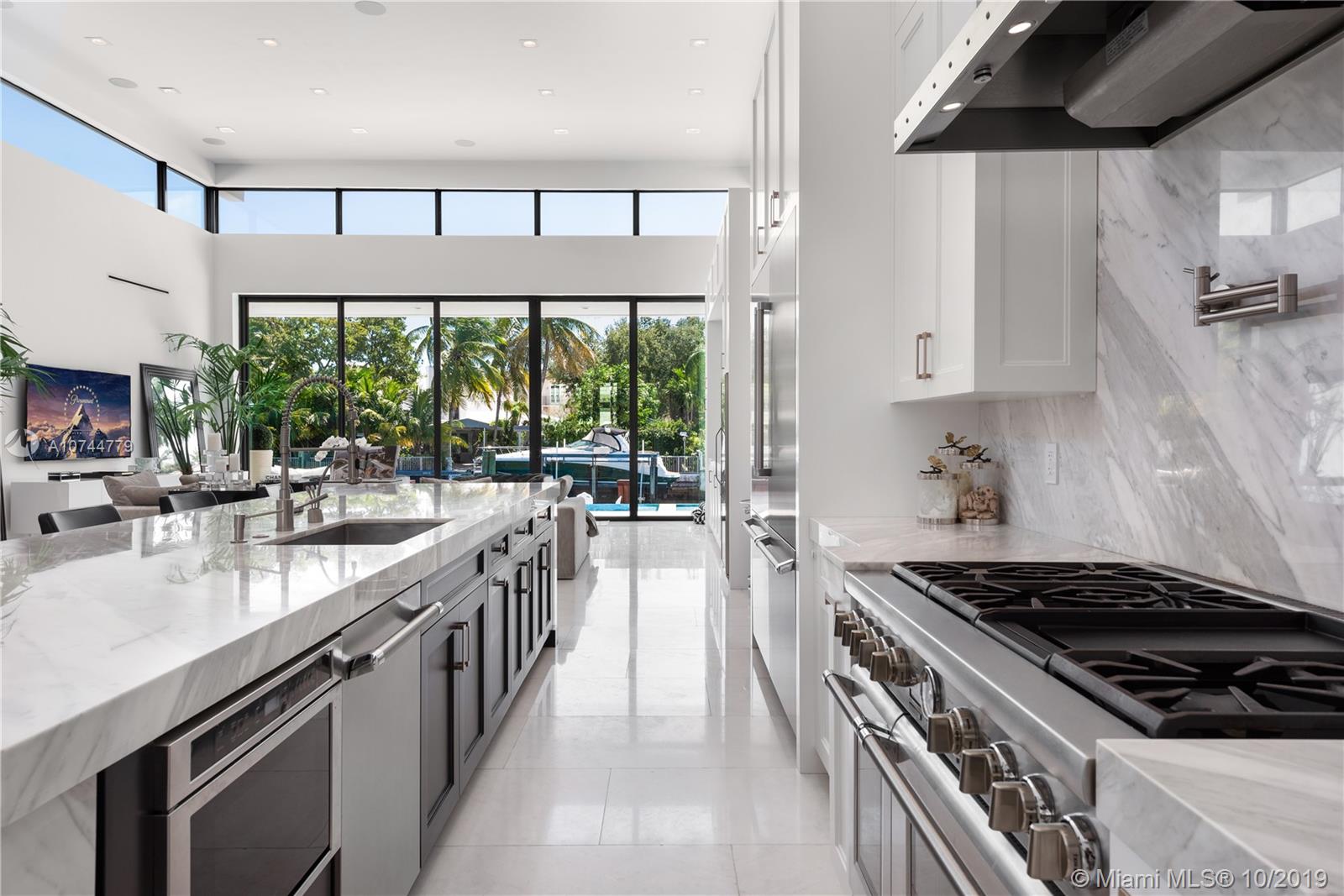 Built-in 2018, this spectacular Regency Moderne style masterpiece was designed for entertaining in style. If grand open space with lots of light and height is what you seek, welcome home. Quality built for its owners (not spec), this showplace features gorgeous white marble floors throughout with 18 ft ceiling in great room and 11 ft ceilings in bedrooms. 4 oversized en-suite bedrooms plus maids room and 5.5 baths. Custom cabinetry throughout including gourmet kitchen with Thermador appliances. Heated infinity-edge pool and spa, Ipe wood dock, hi-impact windows and doors, double car garage. 75 feet of protected water with bay access about 150 feet away. Perfection in Keystone Point.