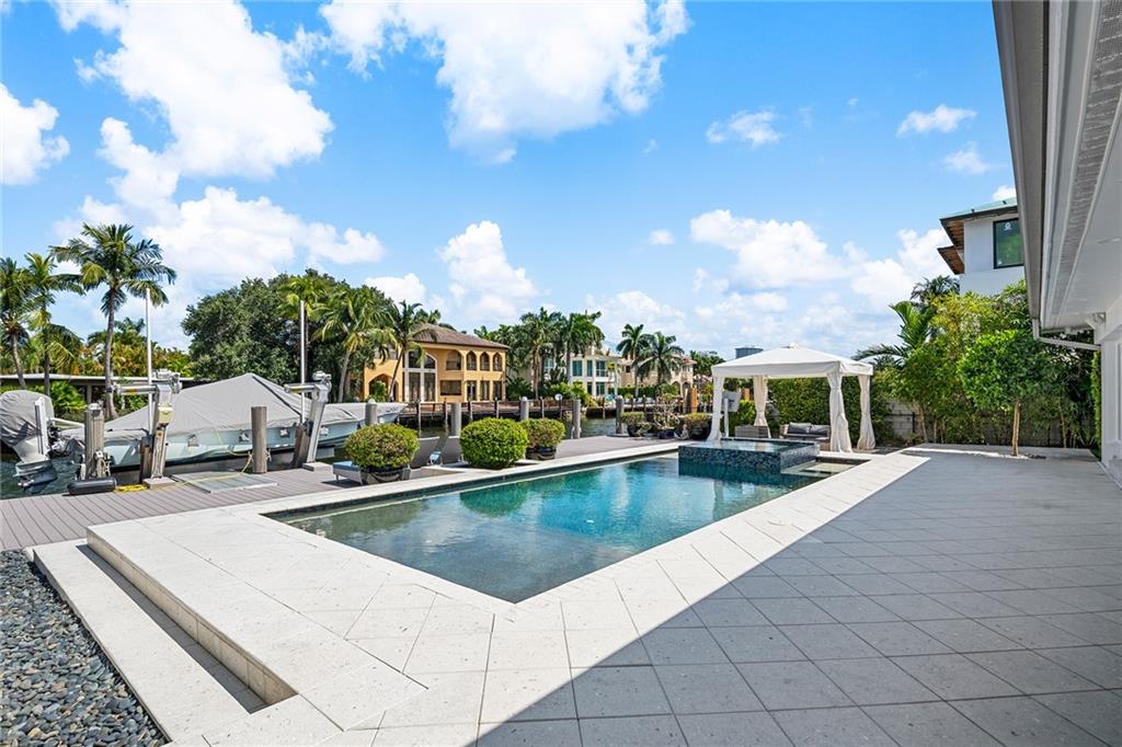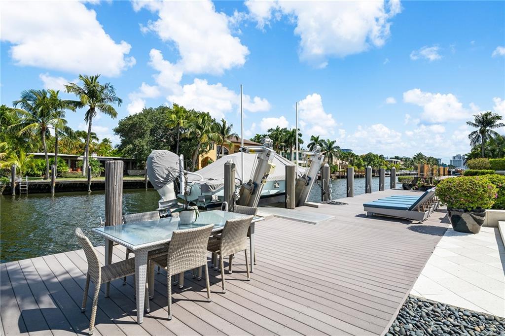 Located in Seven Isles off of Las Olas Blvd., this renovated deep water home offers single level living that has been redesigned with a contemporary flair. 76 ft of waterfront allows dockage of a yacht up to 56 ft in length. Private, gated entry with pergola covered courtyard. An open floor plan combines living, dining, and kitchen areas, all with views of the pool and canal. Composite dock with boat lift. Impact windows and doors. Kitchen and baths have all been remodeled. Living room with fireplace, kitchen with gas cooking and breakfast bar seating. Master has walk-in closets and marble en-suite master bath. Two add'l bedrooms have full en-suite baths. Half bath has outdoor access for cabana bath use. Resort-like backyard. Pool with shallow, beach entry and spill-over spa. Move-in ready