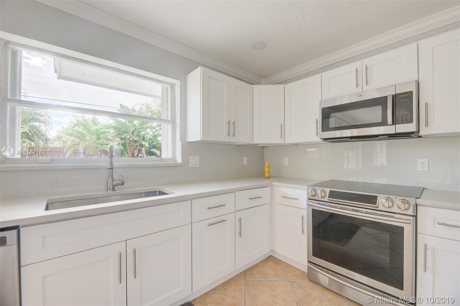 Gorgeous 3/2 totally upgraded. NEW ROOF with 25 year warranty! Wood tile floors throughout, quartz kitchen, s/s appliances, and Brand new bathrooms. Large fenced in yard. New vanities and waterfall bar in the kitchen. Open floor plan concept. Tons of windows, new blinds, base boards, crown molding, freshly painted. Quartz back splash in the kitchen. Fans in the bedrooms. New closet doors. Nice landscaping with tons of palms trees. Bright and tons of windows. New light fixtures and new cabinets. Stone shower floors and tile back splash. Bring your toothbrush! Brand new barn doors in second bedroom. New blinds. Accordion shutters.